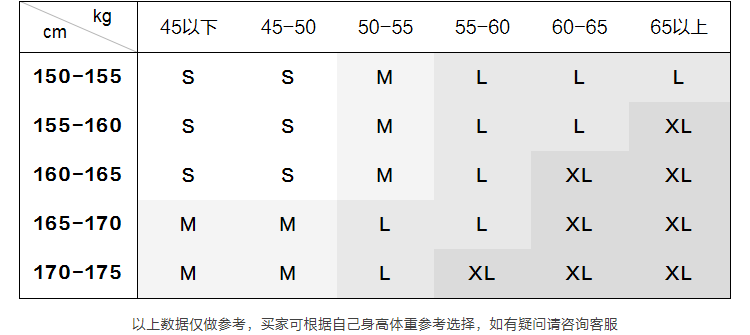 China (cm) 160-165/84-86 165-170 / 88-90 167-172 / 92-96 168-173 / 98-102 170-176 / 106-110