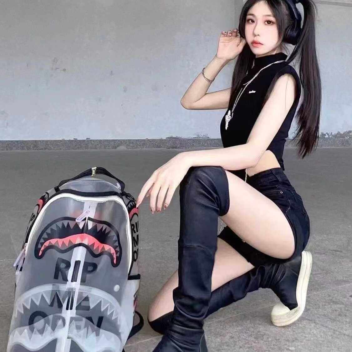Sports Backpack Sg Spoof Shark Hottie Student Transparent Large Capacity Trendy Brand Backpack Casual Travel School Bag