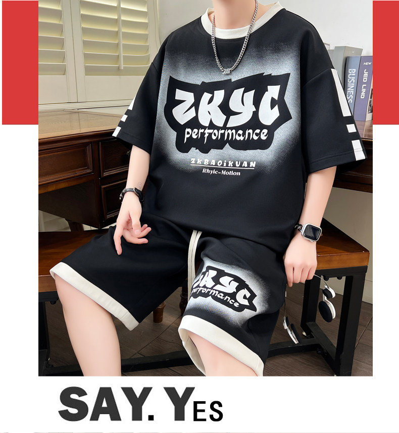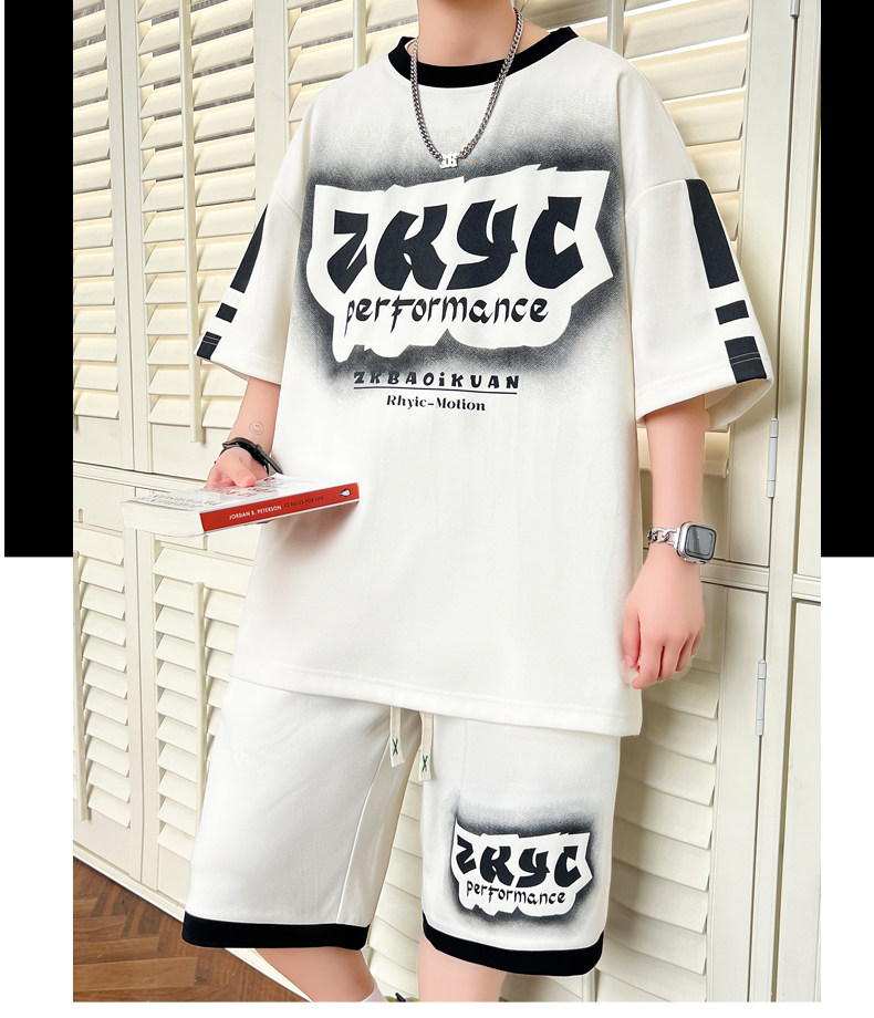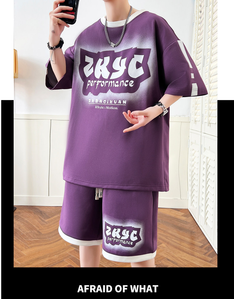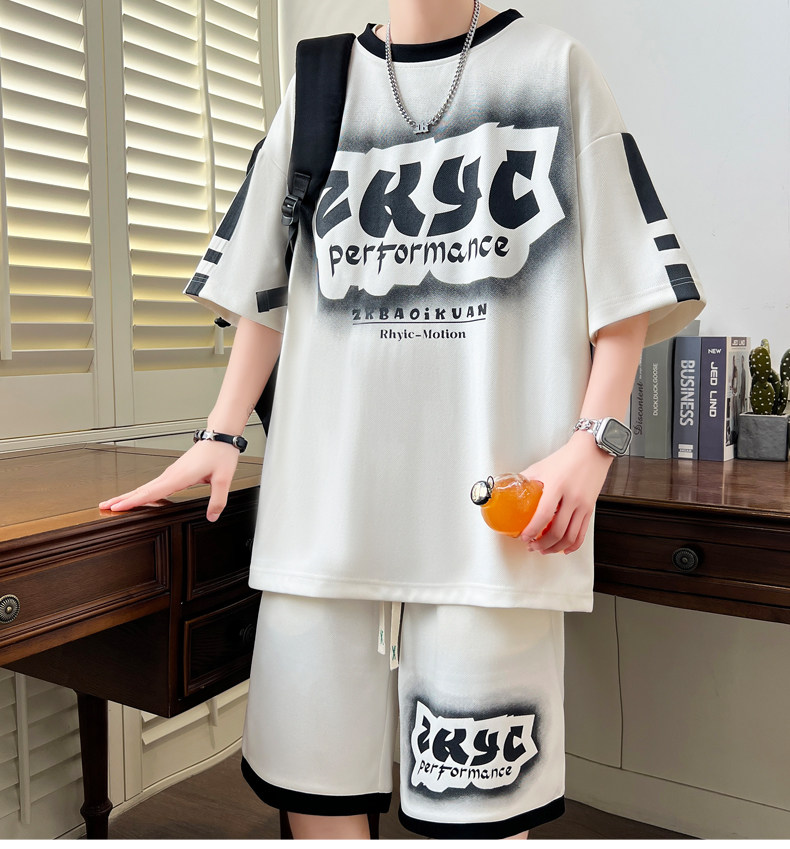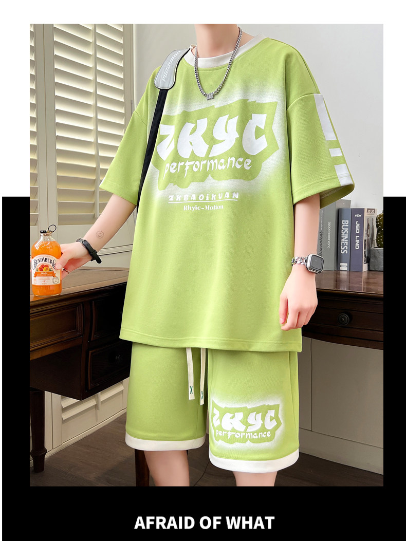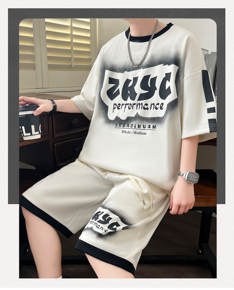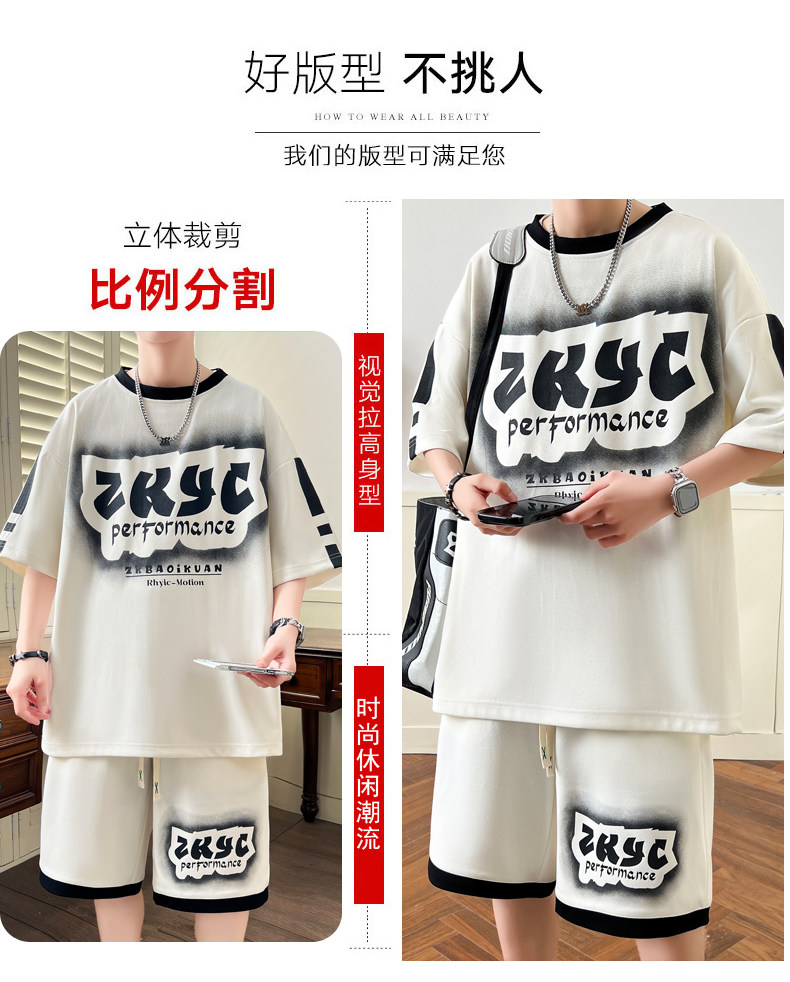 Casual Sports Suit for Men, Summer Five-Quarter Sleeve T-Shirt, Men's Short-Sleeved Youth Set, Stylish Hong Kong Style Clothing T-Shirt