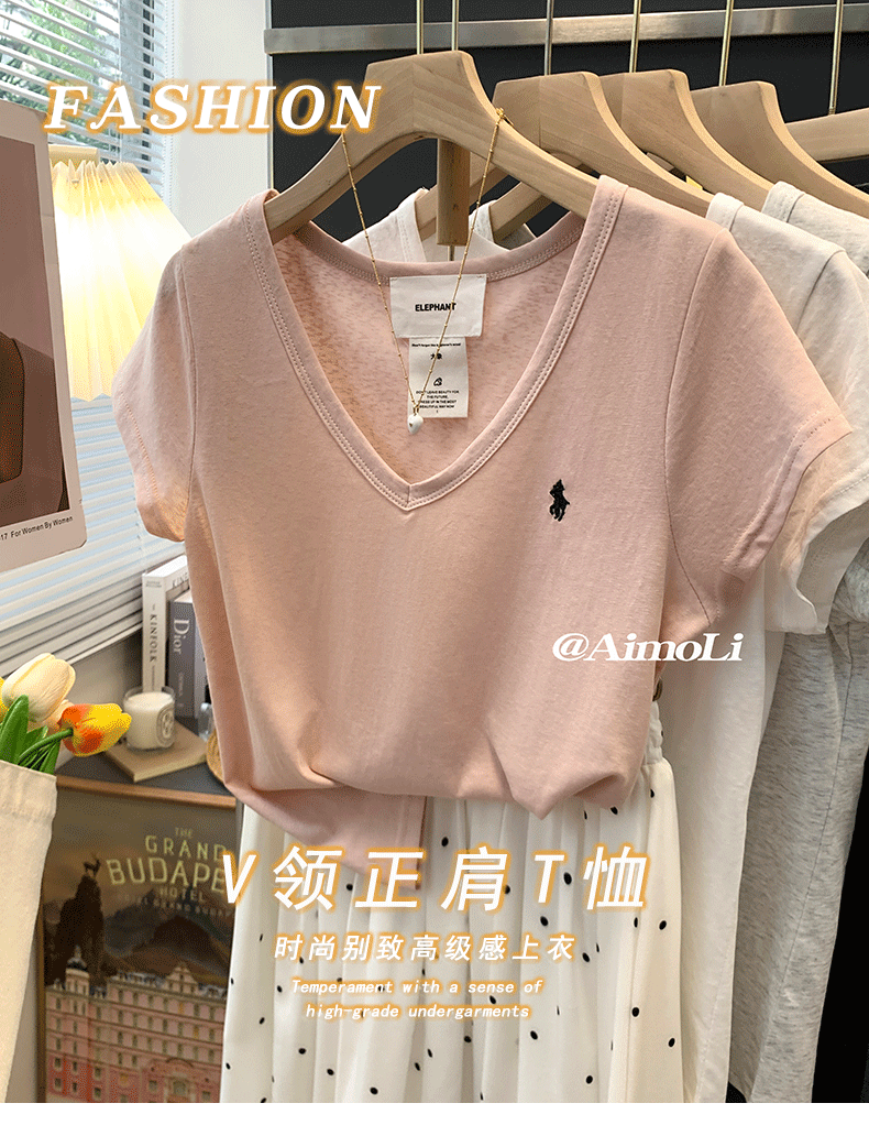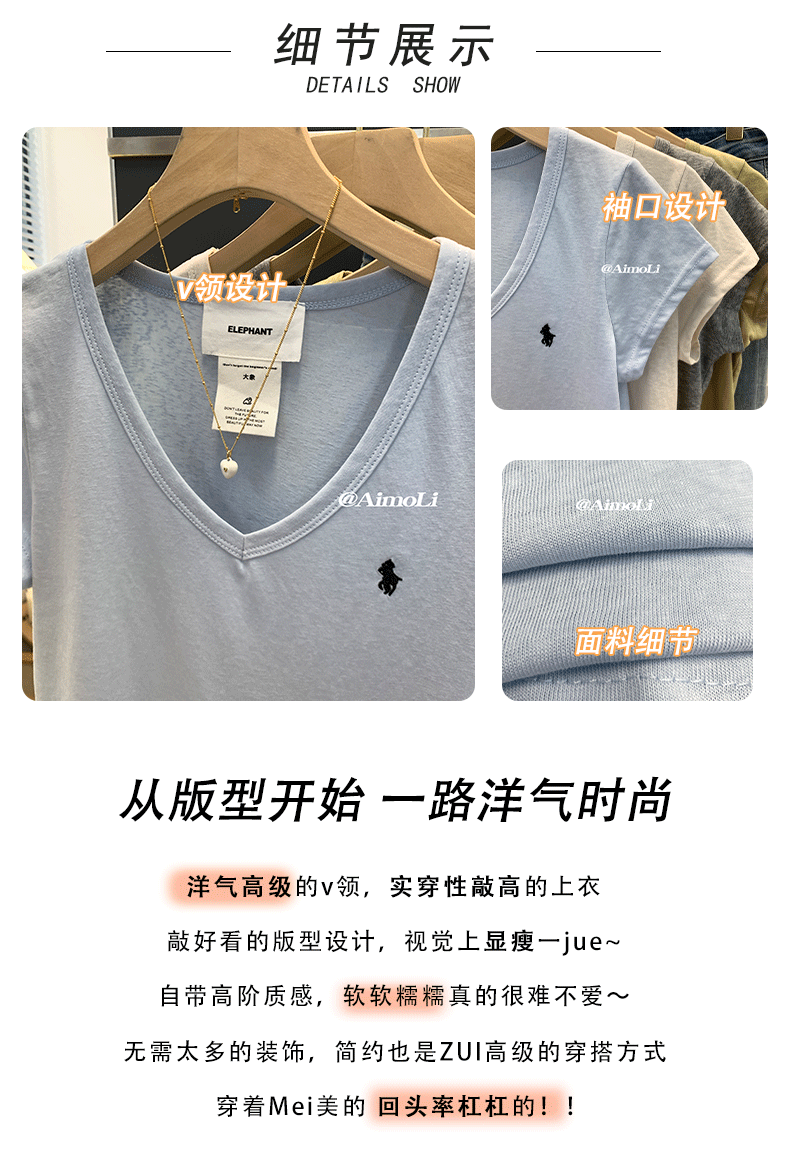 Summer Blue V-Neck Embroidered Pure Cotton Regular Shoulder Short-Sleeved T-Shirt for Women, New Design, Unique and Stylish, Slim-Fitting Top