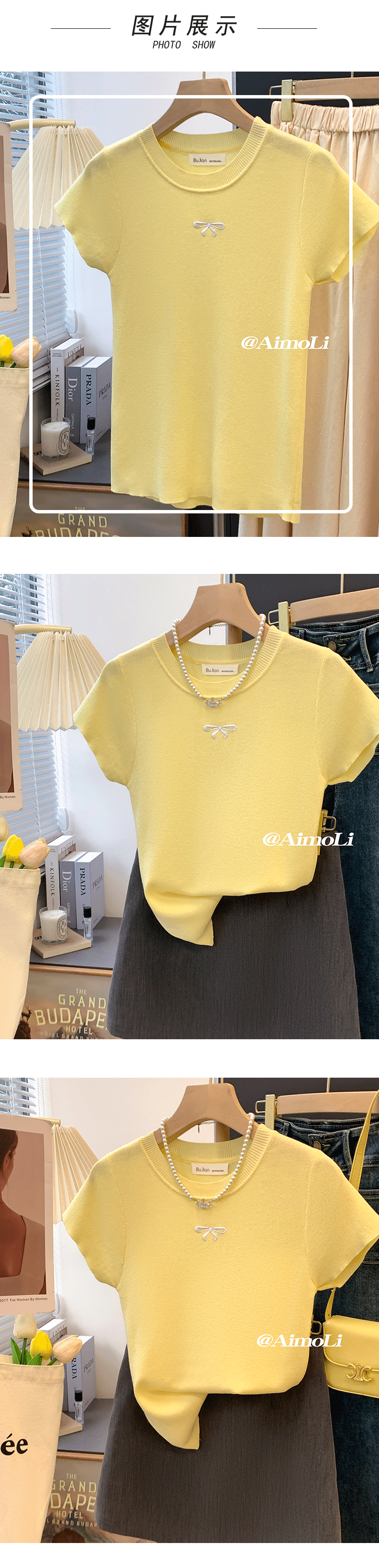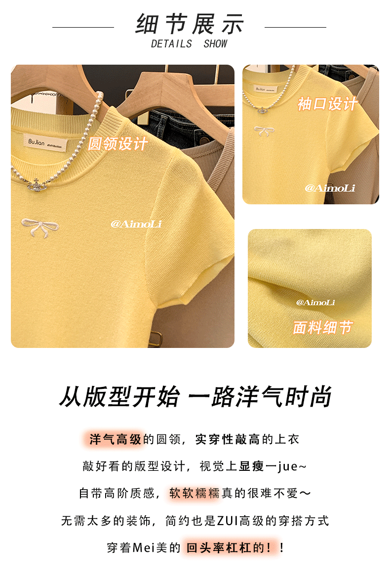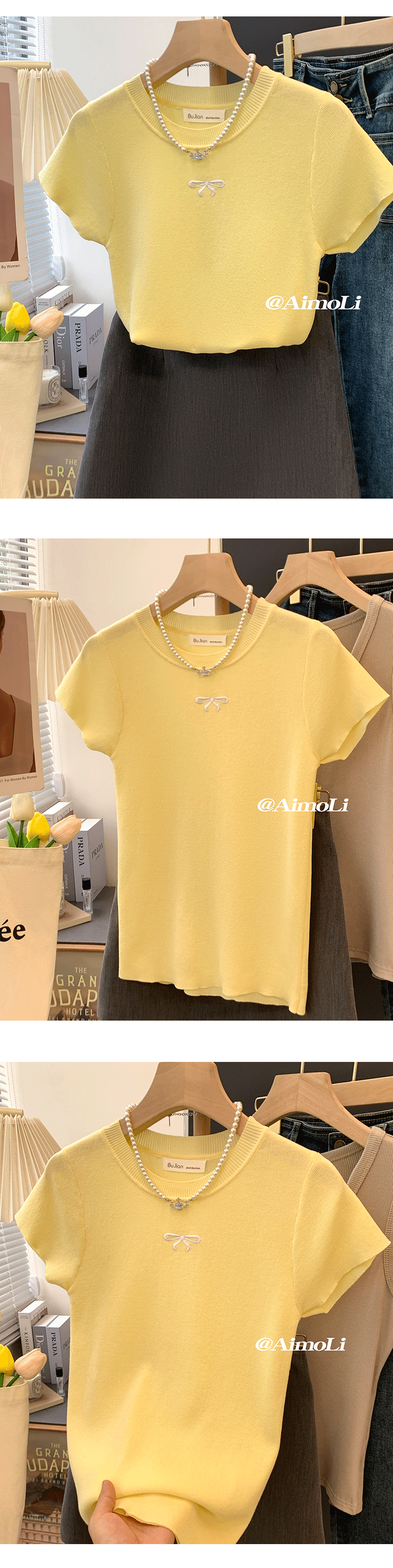 French-Style Yellow Sweet Bow Ice Silk Knit Top for Women, Summer Embroidered Slim-Fit Thin Base Shirt, Unique Top