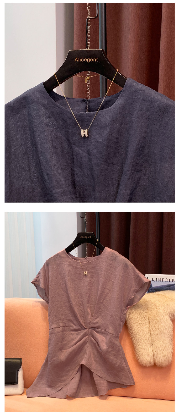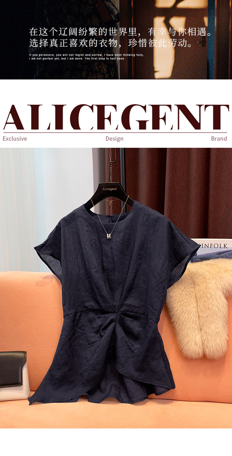 High-End Accessible Luxury 100% Ramie Thin Top for Women 2024 Summer New Style Pleated Asymmetrical Hem Elegant Shirt