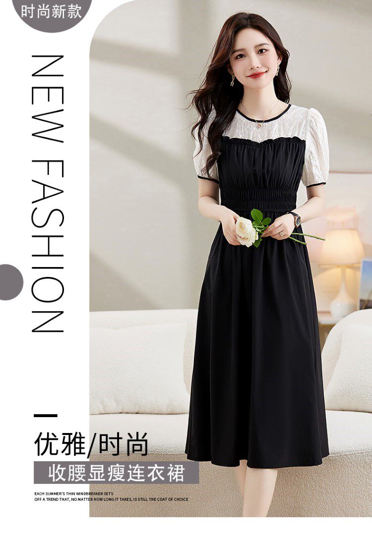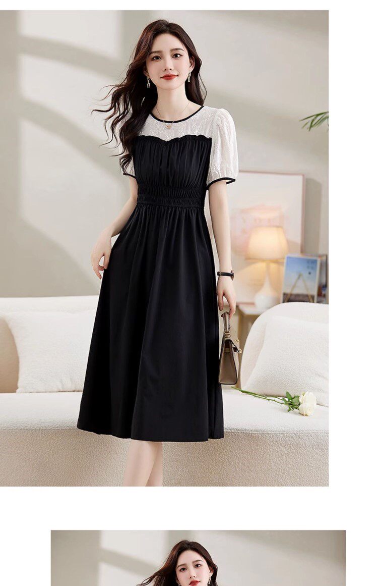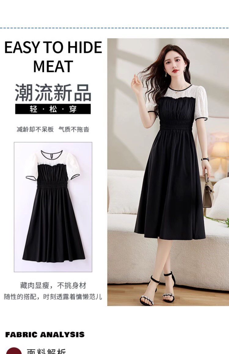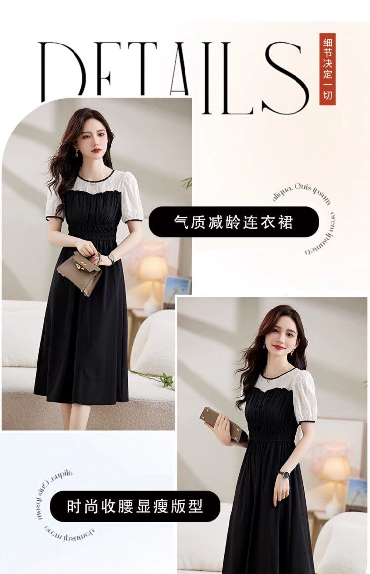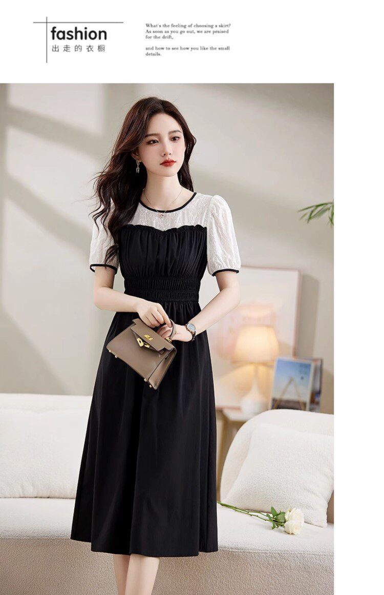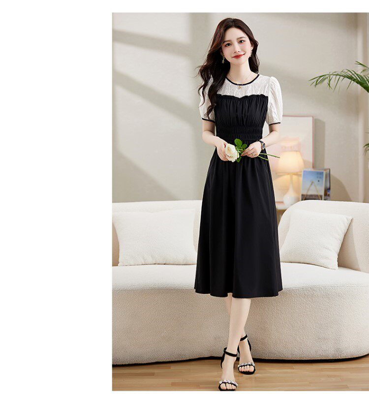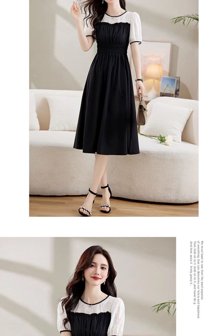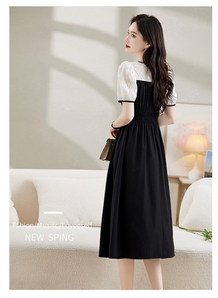Black Patchwork Dress for Women 2026 Summer New High-End Exquisite Puff Sleeves Elegant Slim Fit Mid-Length Dress