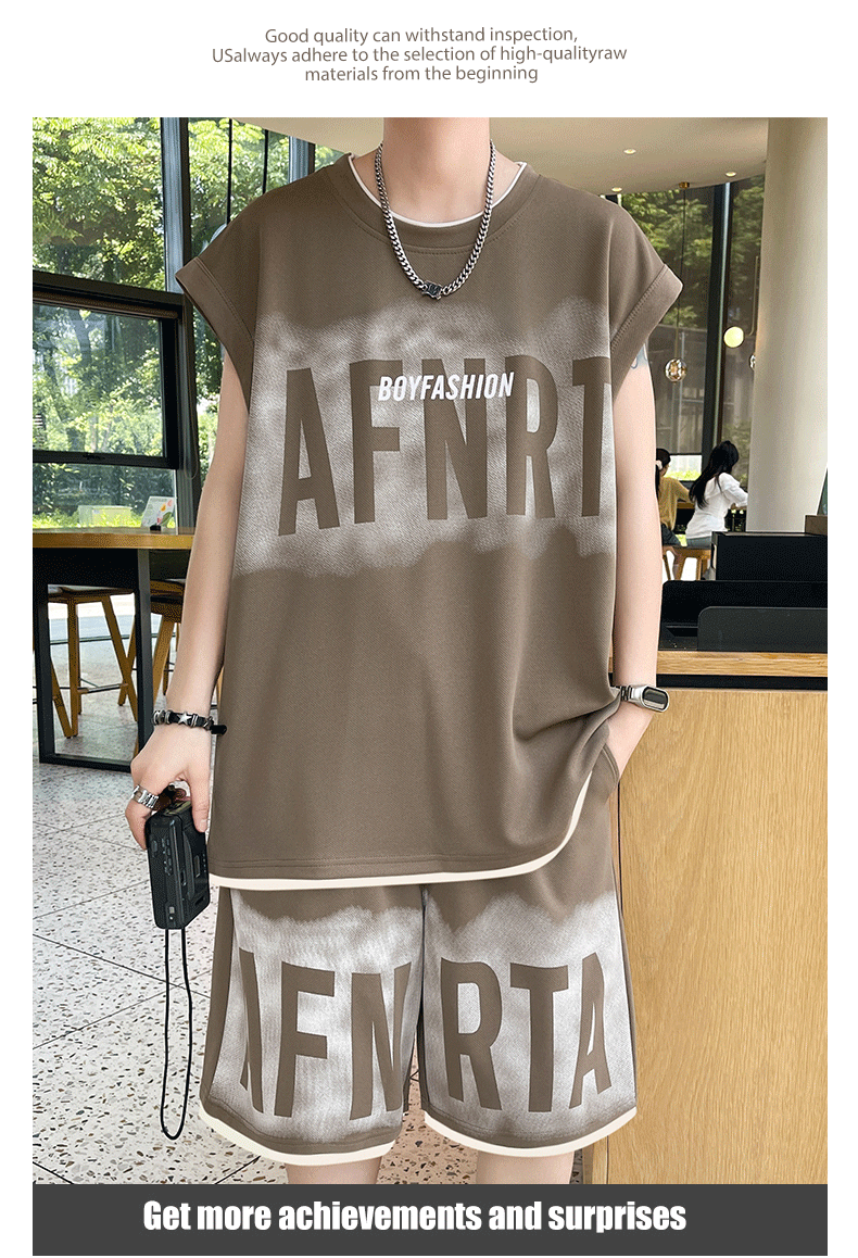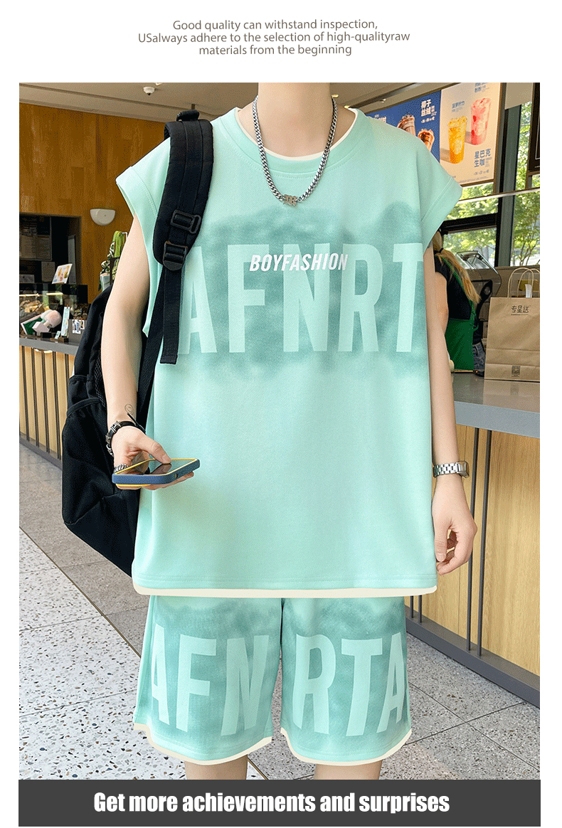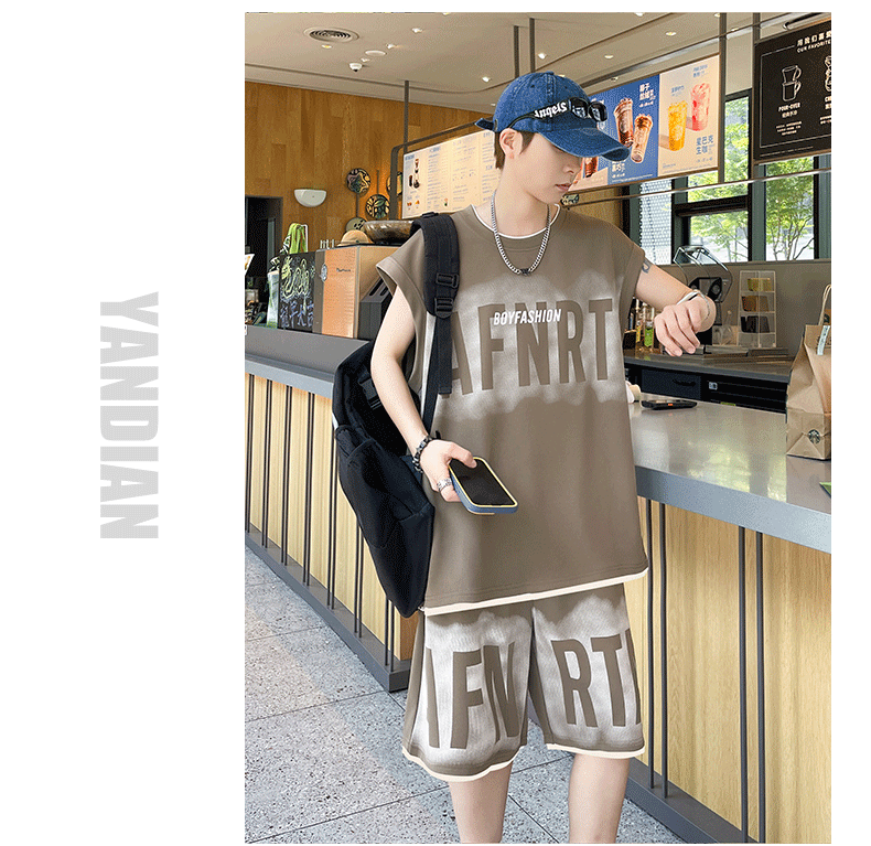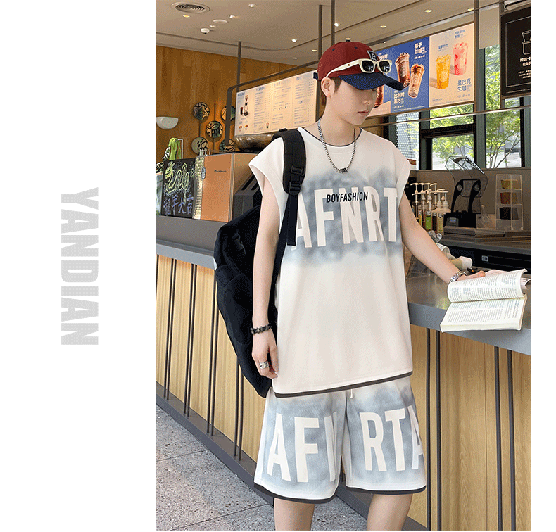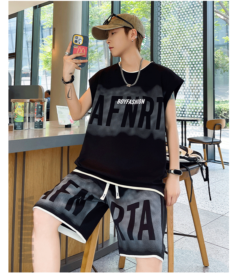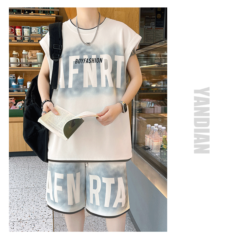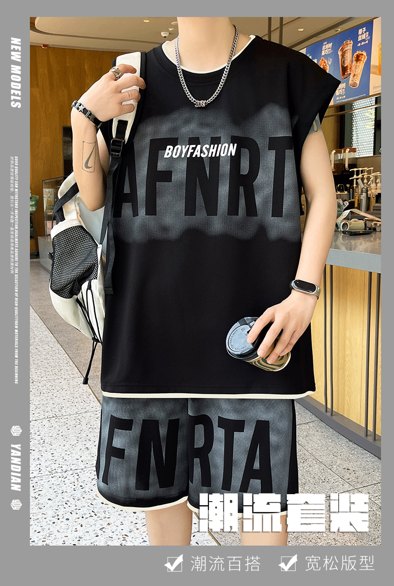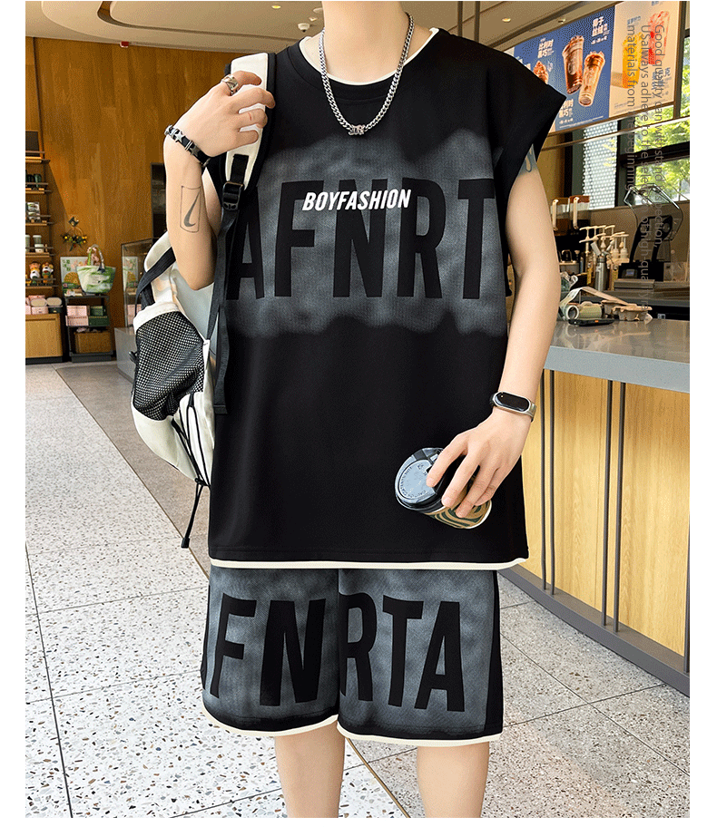 American Casual Sports Suit for Men, Summer Sleeveless T-Shirt, Vest, Trendy Brand, Large Size, Five-Point Shorts, Vest Two-Piece Set
