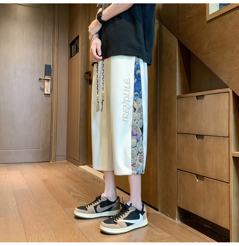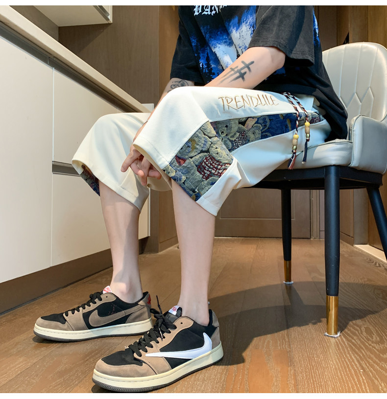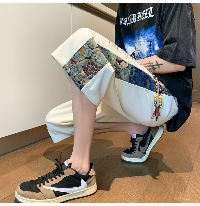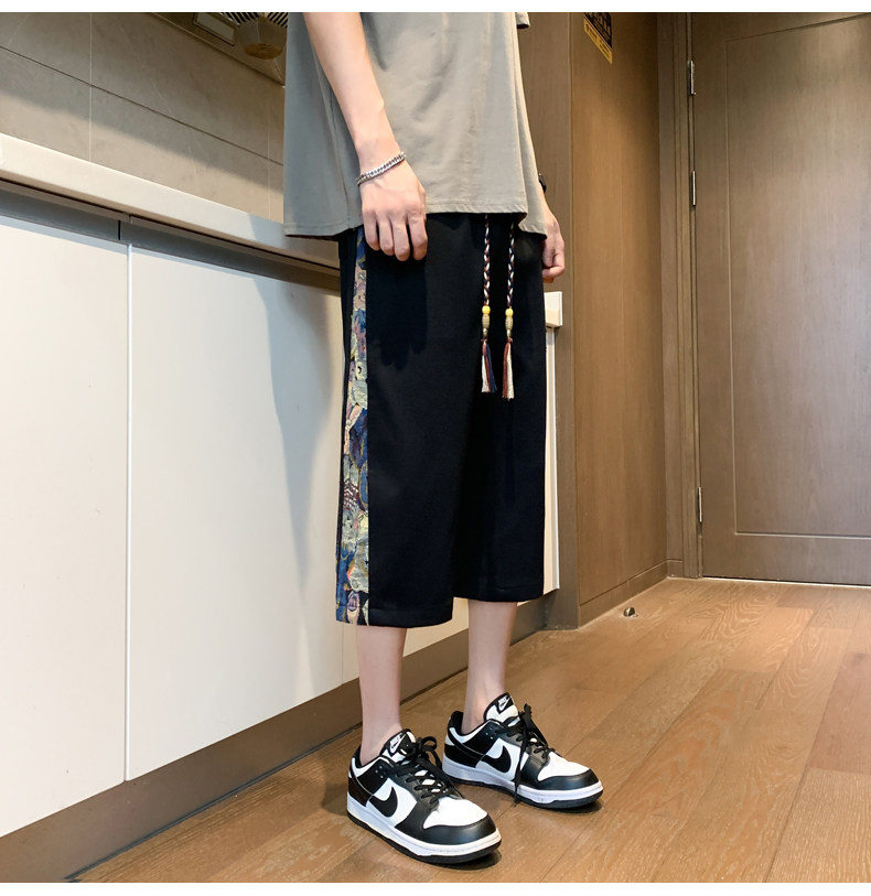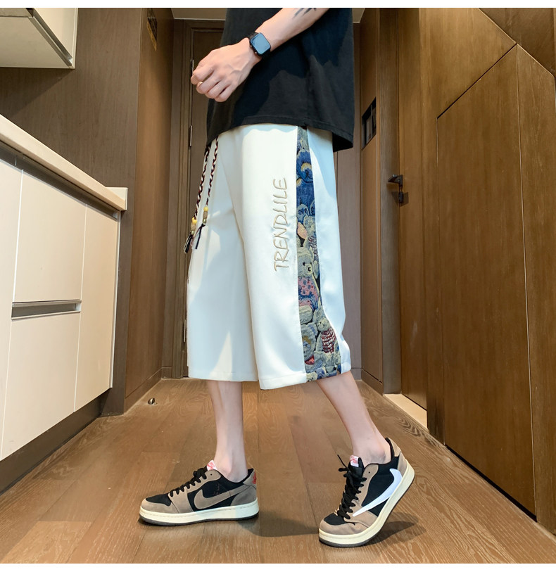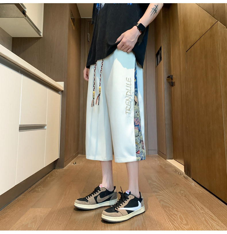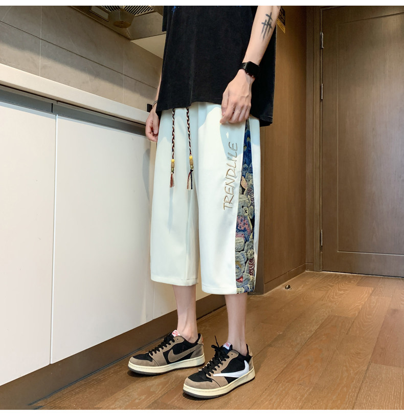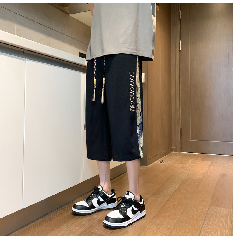 Chinese Style Men's Summer Ice Silk Loose Straight Casual Pants, National Trend Embroidered Fashion Sports Cropped Pants
