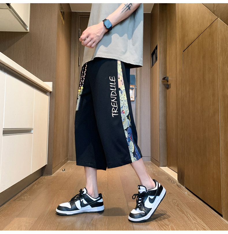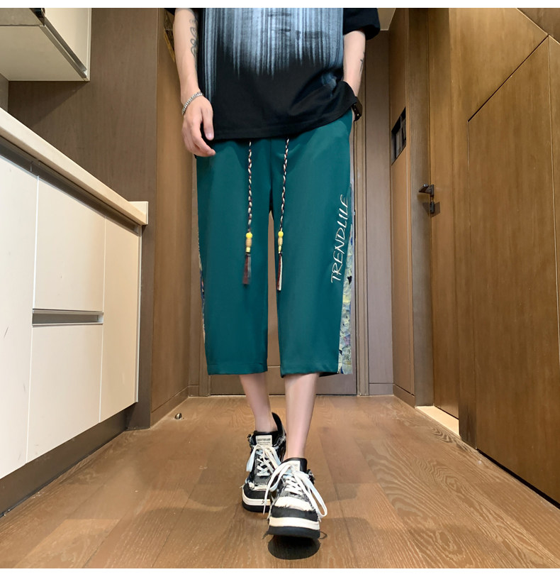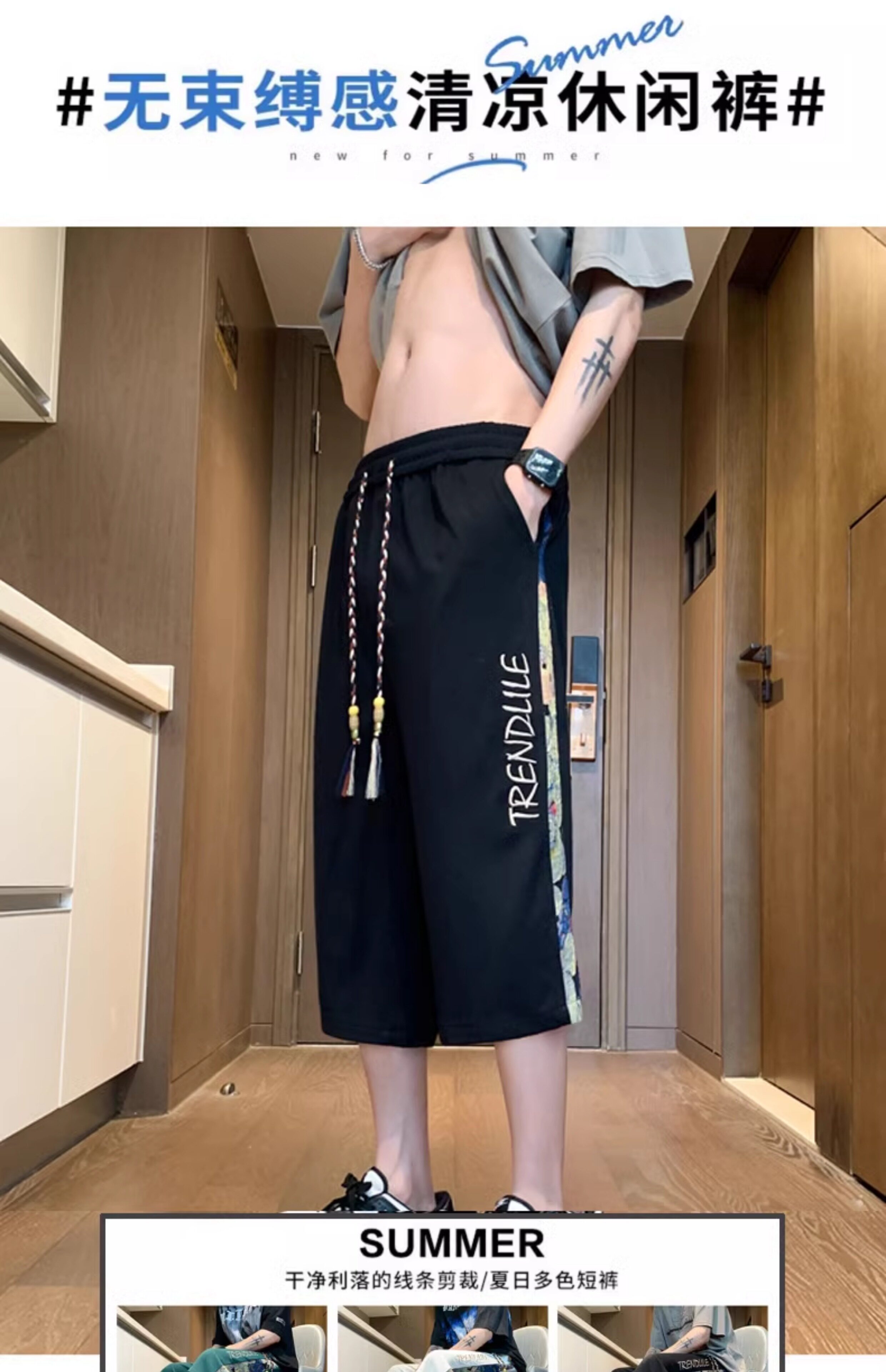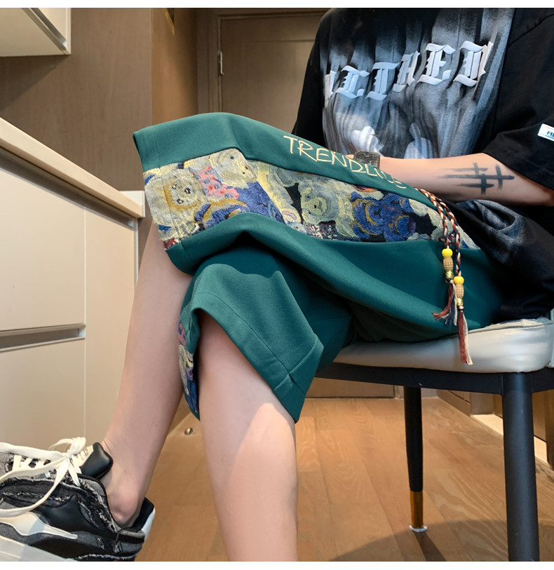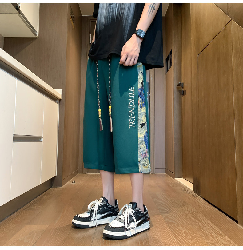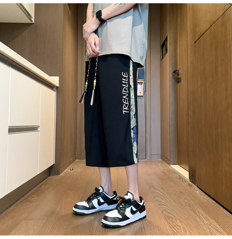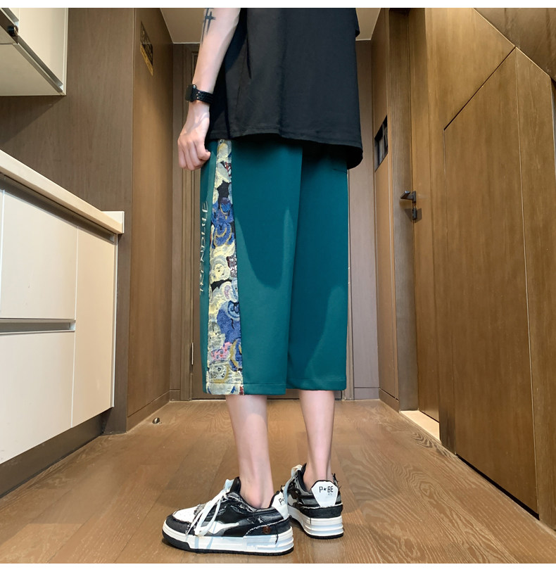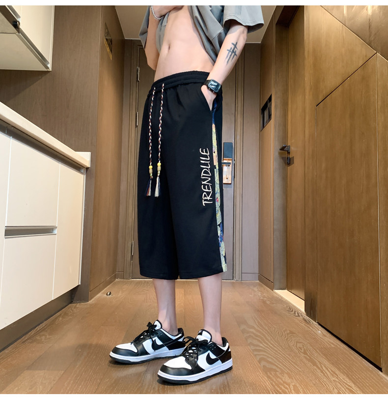 Chinese Style Men's Summer Ice Silk Loose Straight Casual Pants, National Trend Embroidered Fashion Sports Cropped Pants