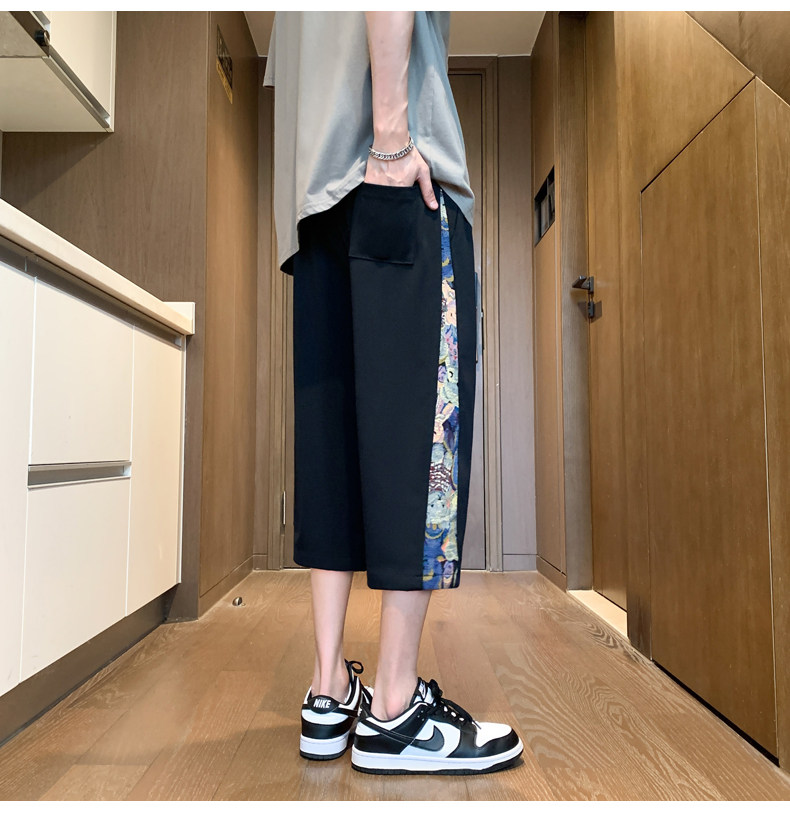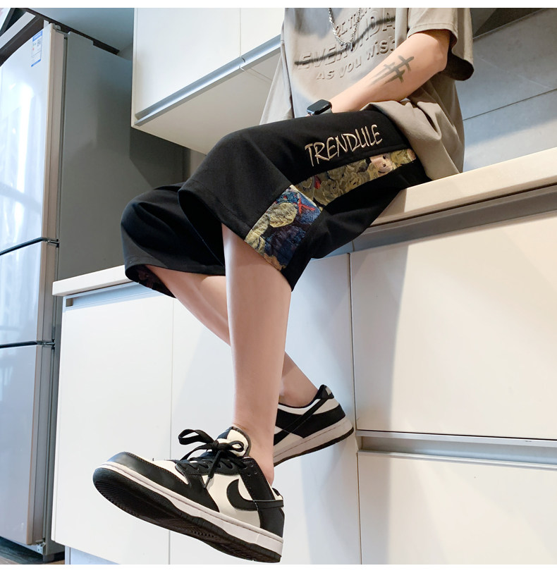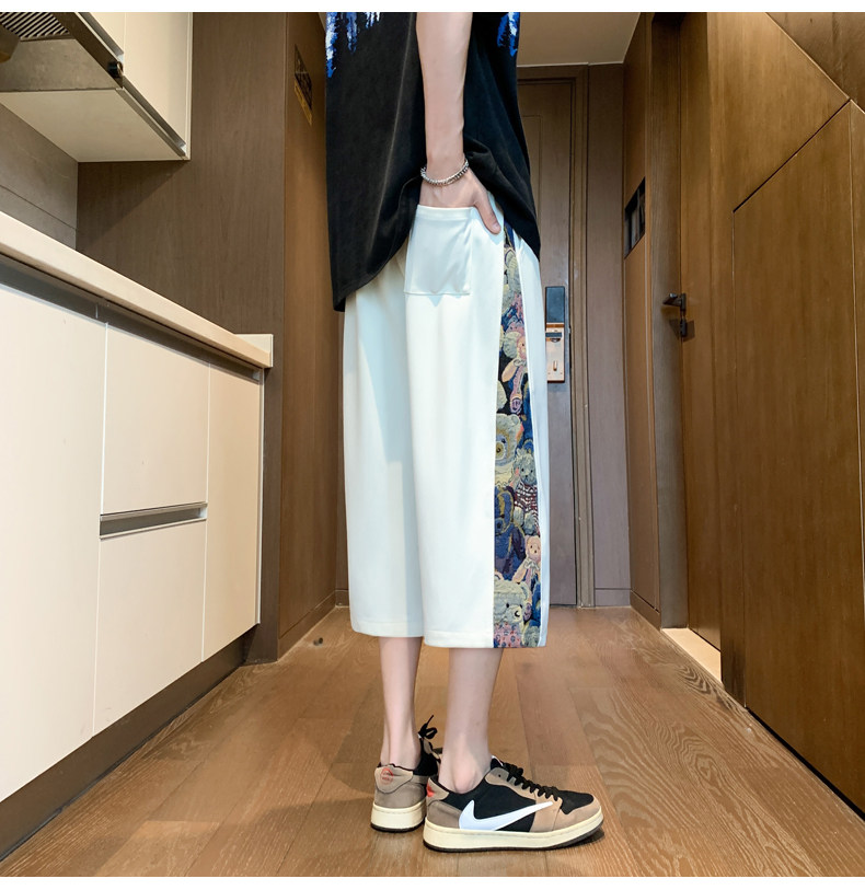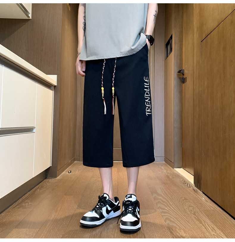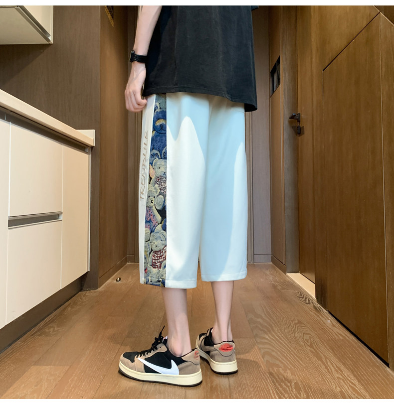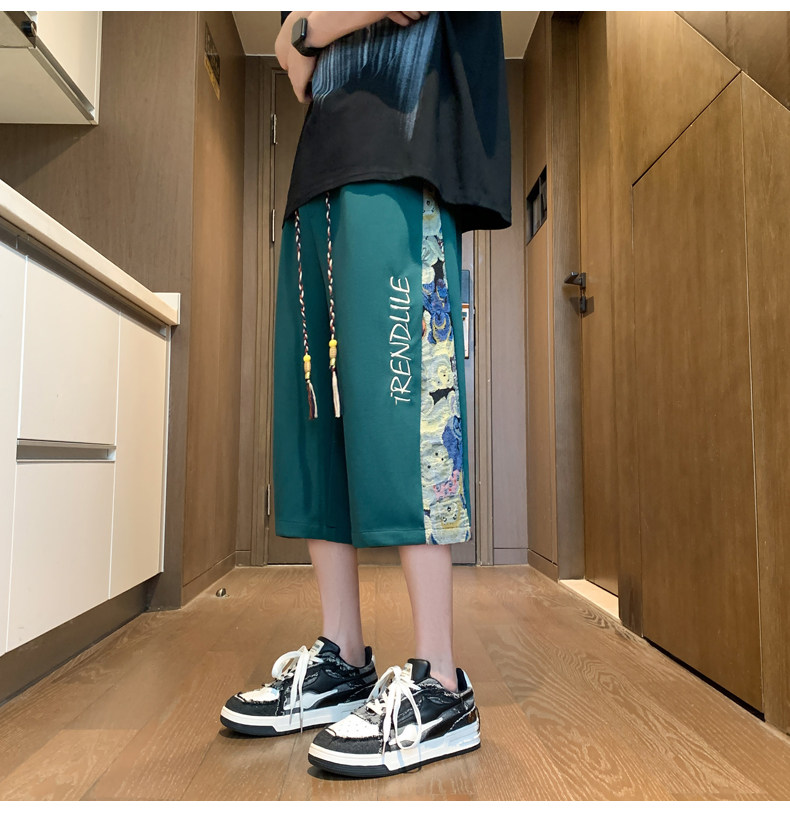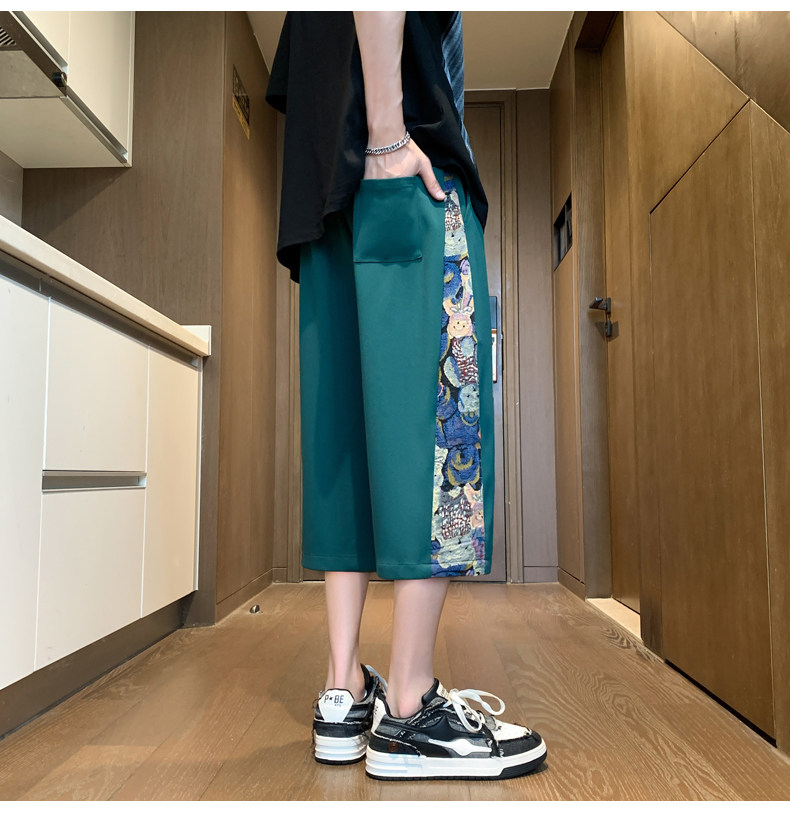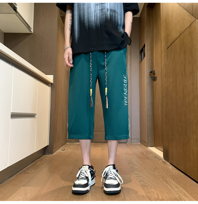 Chinese Style Men's Summer Ice Silk Loose Straight Casual Pants, National Trend Embroidered Fashion Sports Cropped Pants