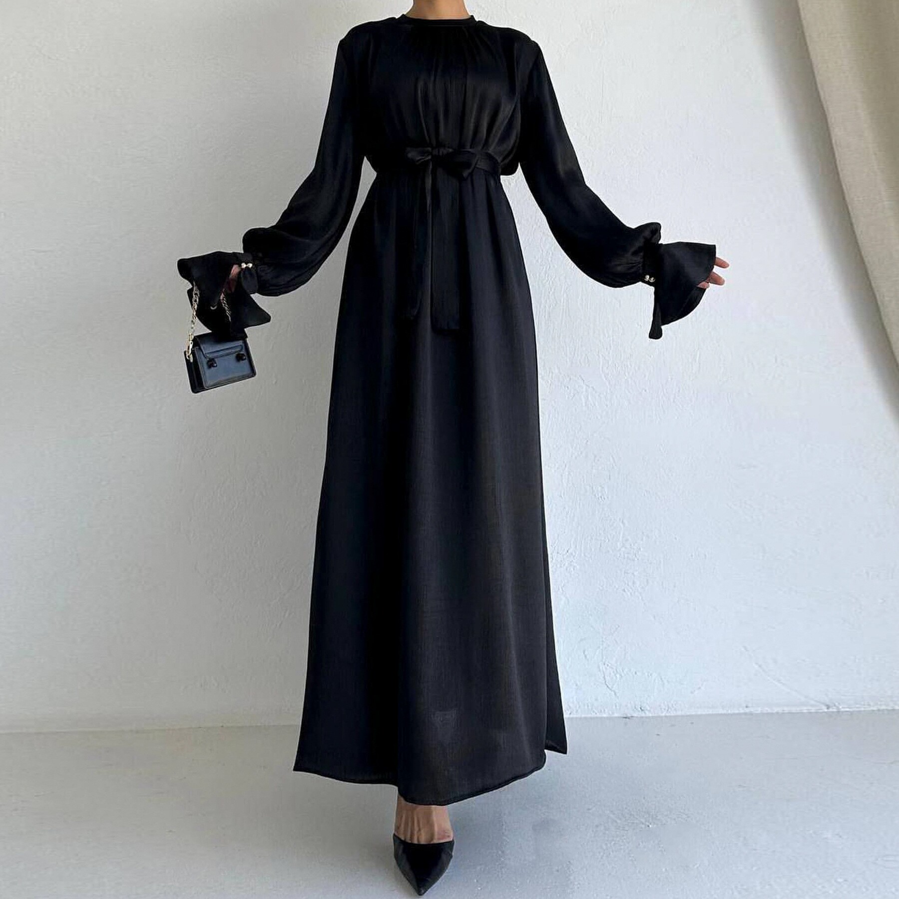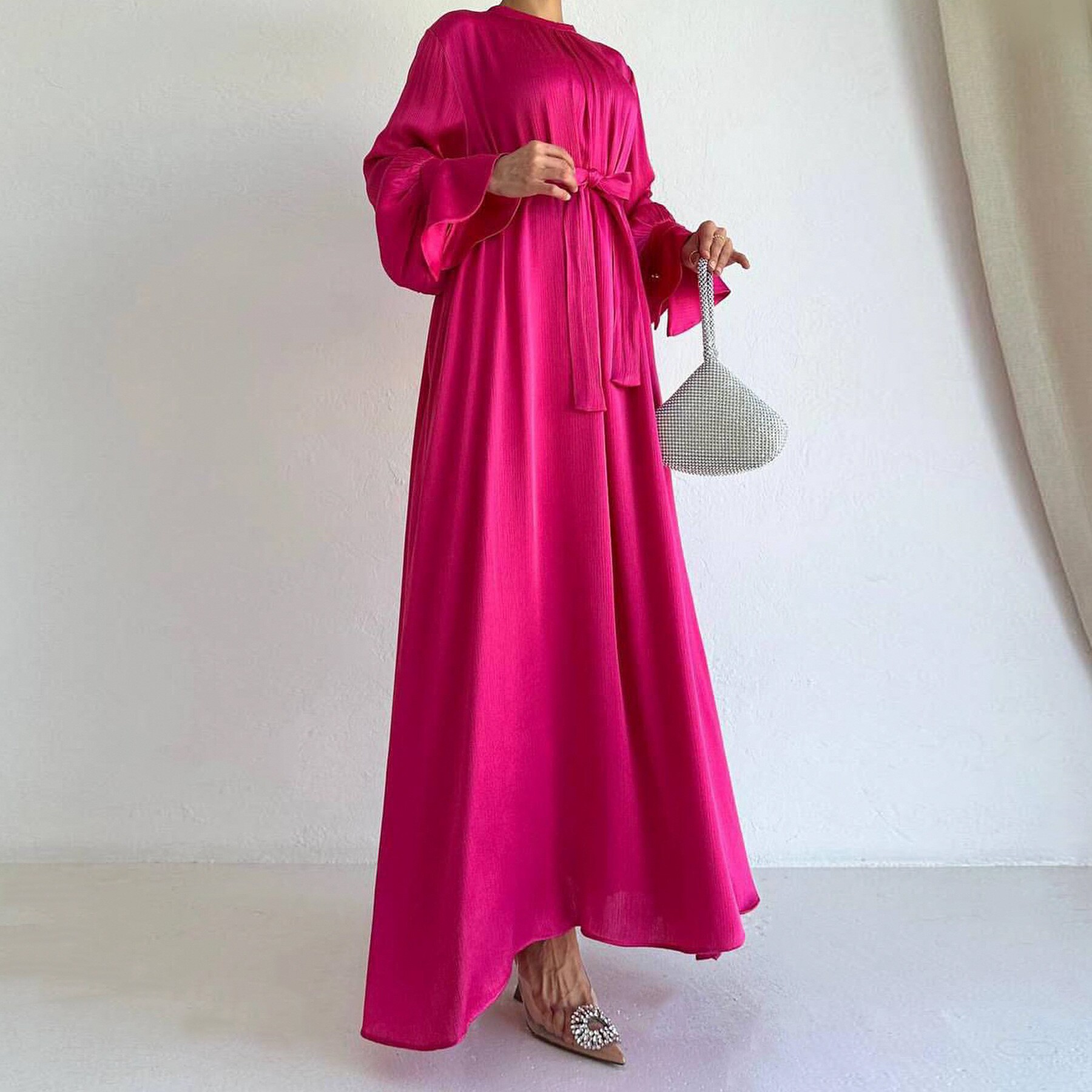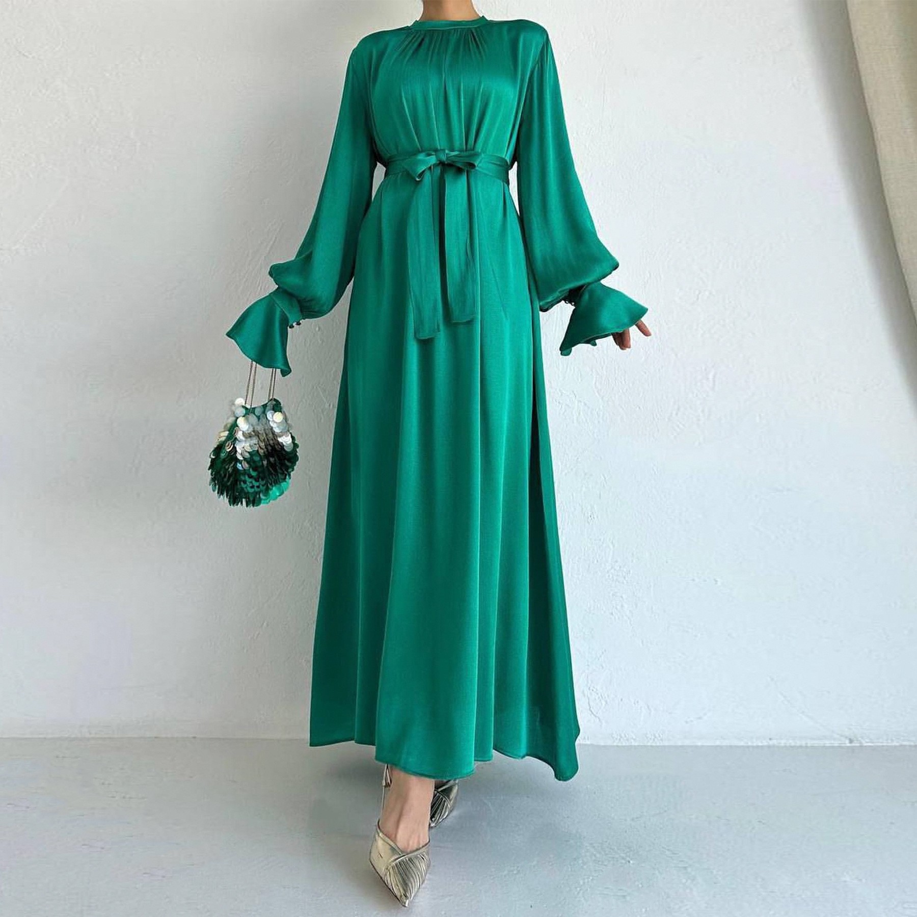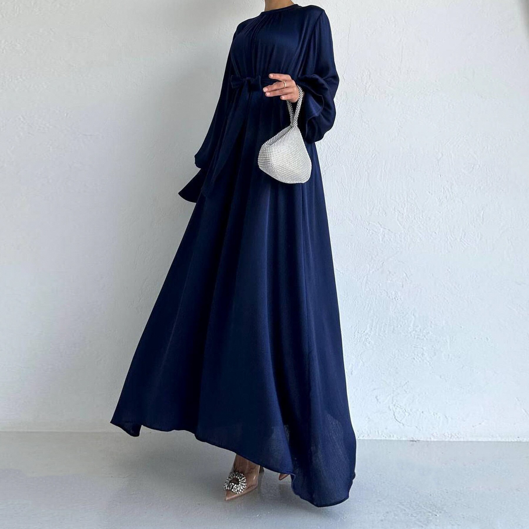 Dubai Elegant Satin Lantern Sleeve Lace-Up Dress