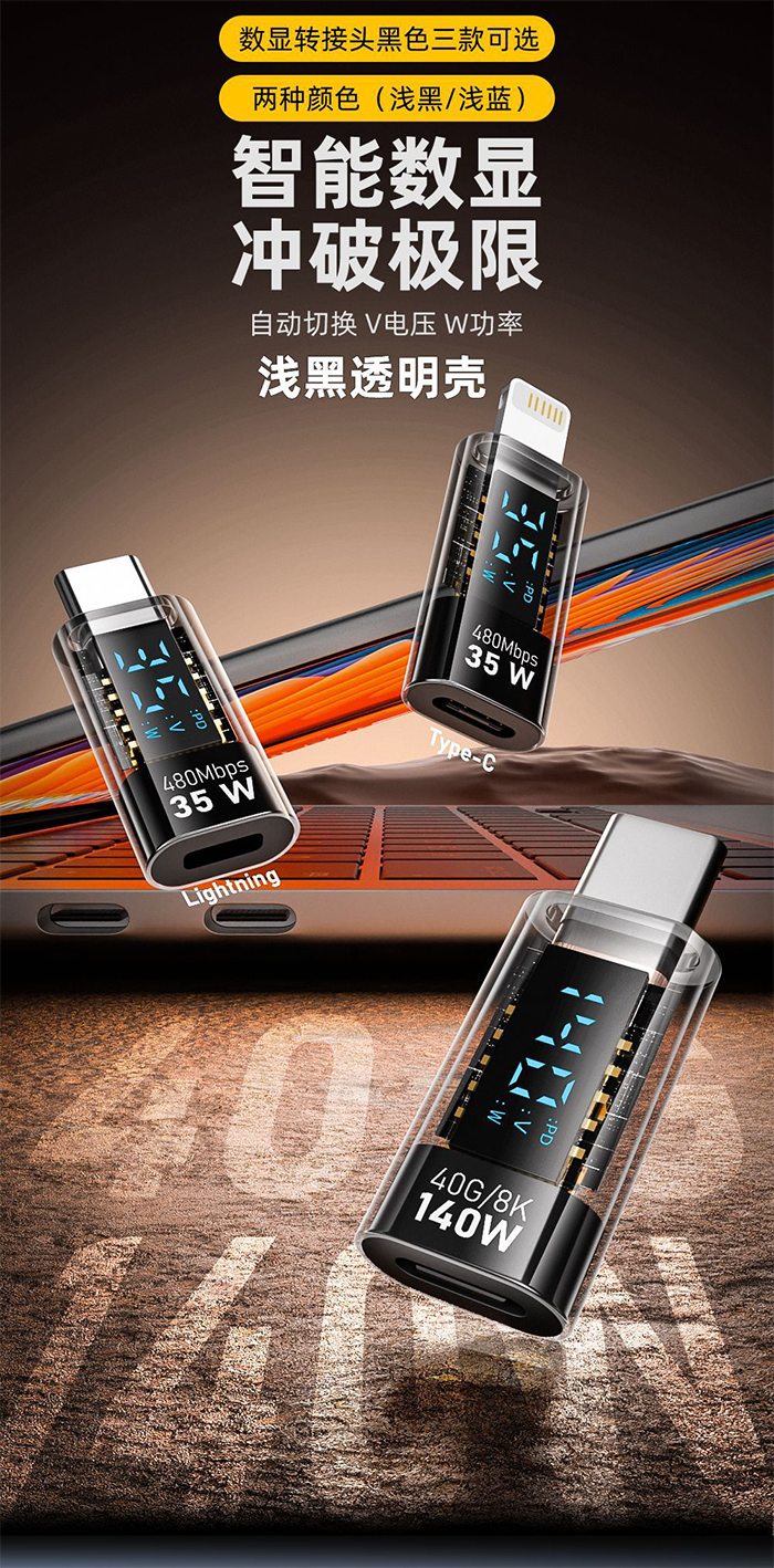 Sort by color Straight Type-C male to Type-C female, supports 140W/40G/8K digital display adapter, light black,Straight Type-C male to Type-C female, supports 140W/40G/8K digital display adapter, light blue,Straight Type-C male to lightning female, supports 35W/480M digital display adapter, light black,Straight type-C male to lightning female support 35W/480M digital display adapter light blue,Straight type-C female to lightning male, supports 35W/480M digital display adapter, light black,Straight type-C female to lightning male, supports 35W/480M digital display adapter, light blue,Straight Type-C male to Type-C female, supports 240W/40G/8K digital display adapter, black,Straight Type-C male to Type-C female, supports 240W/40G/8K digital display adapter, light black,Straight Type-C male to Type-C female, supports 240W/40G/8K digital display adapter, light blue