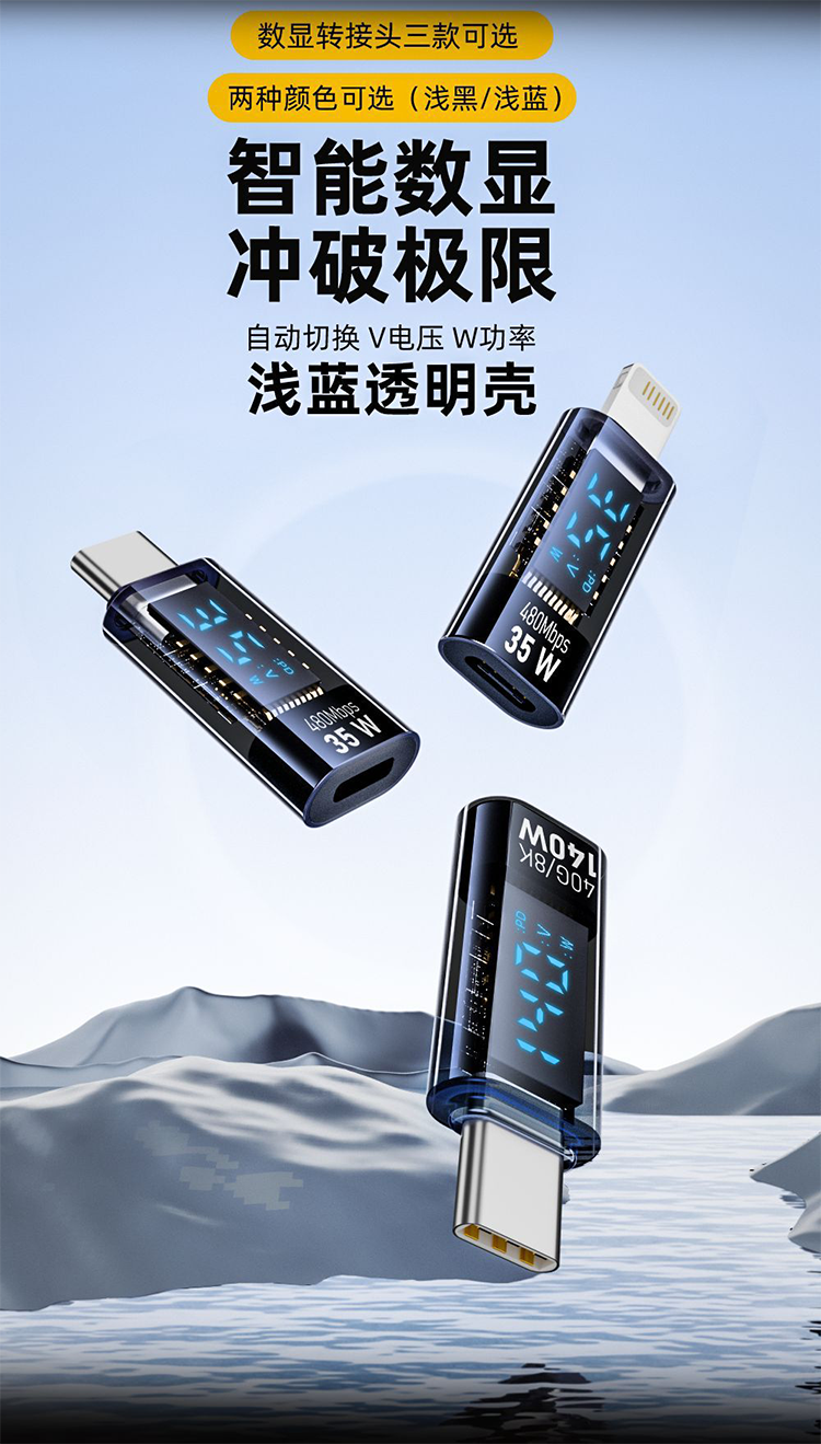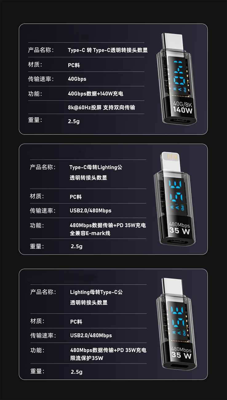 Sort by color Straight Type-C male to Type-C female, supports 140W/40G/8K digital display adapter, light black,Straight Type-C male to Type-C female, supports 140W/40G/8K digital display adapter, light blue,Straight Type-C male to lightning female, supports 35W/480M digital display adapter, light black,Straight type-C male to lightning female support 35W/480M digital display adapter light blue,Straight type-C female to lightning male, supports 35W/480M digital display adapter, light black,Straight type-C female to lightning male, supports 35W/480M digital display adapter, light blue