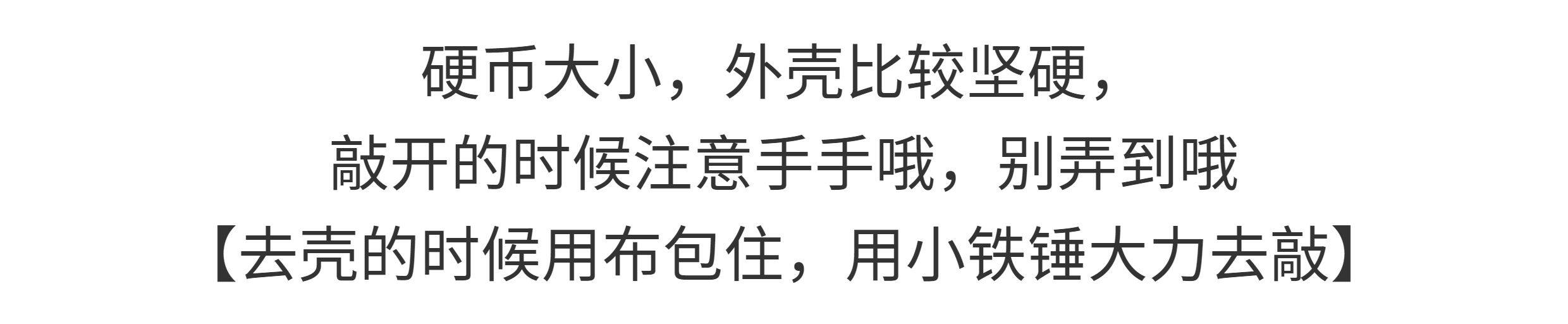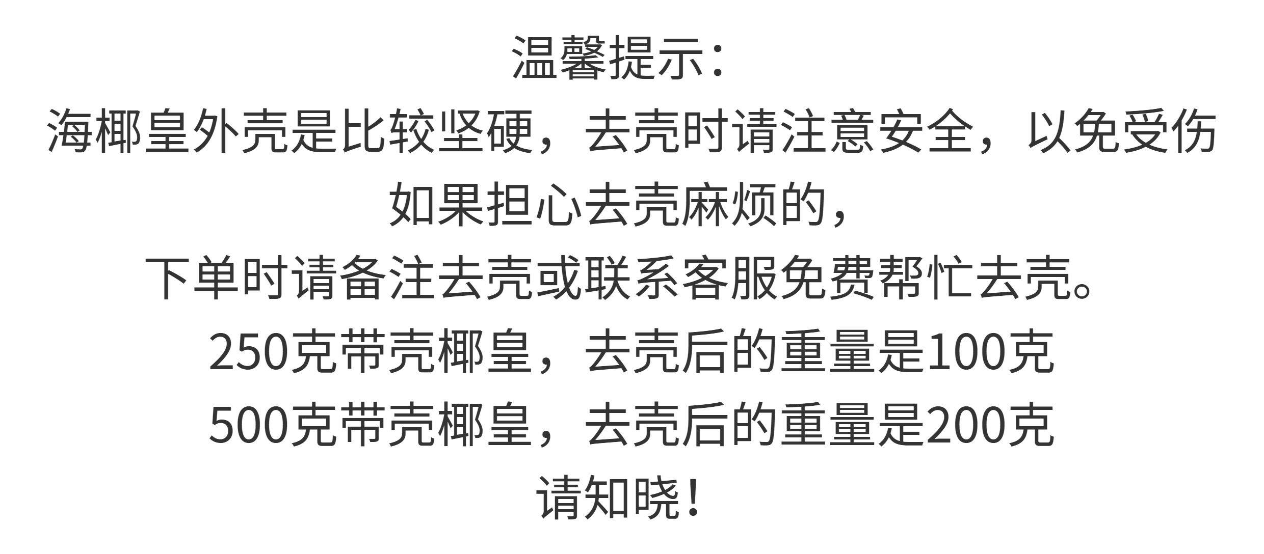 Package Type 250 grams of small coconut in shell (given a small hammer),500 grams of small coconut in shell (given a small hammer),50g small coconut king, shelled and cut in half,50 grams of shelled small coconut palm (about 25 pieces),100g of Houhai Emperor Coconut Shelled (about 43 pieces),250g Houhai Emperor Coconut Shelled (about 90 pieces),500g Houhai Royal Coconut, shelled (about 180 large fruits)