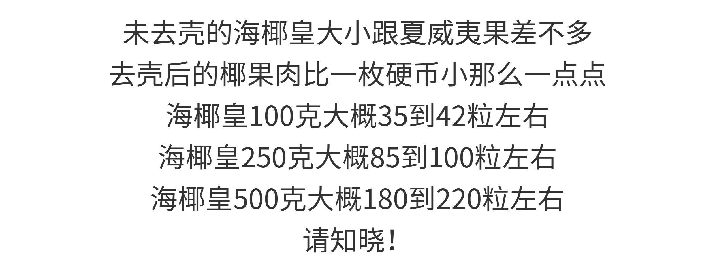 Package Type 50 grams of shucked coconut palm (about 20 pieces),50g small coconut king, shelled and cut in half,100 grams of shelled small coconut palm (about 38 pieces),150 grams of shelled small coconut palm (about 43 pieces of large fruit),250 grams of shelled coconut palm (about 100 pieces),500 grams of shelled coconut palm (about 180 pieces),250 grams of coconut palm in shell (about 38 pieces),500g small coconut palm in shell (about 75 pieces)