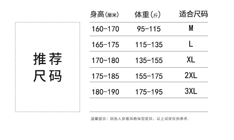 China (cm) 165 / 88-90 170 / 96-98 175 / 108-110 180 / 118-122 185 / 126-130