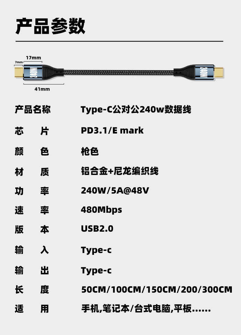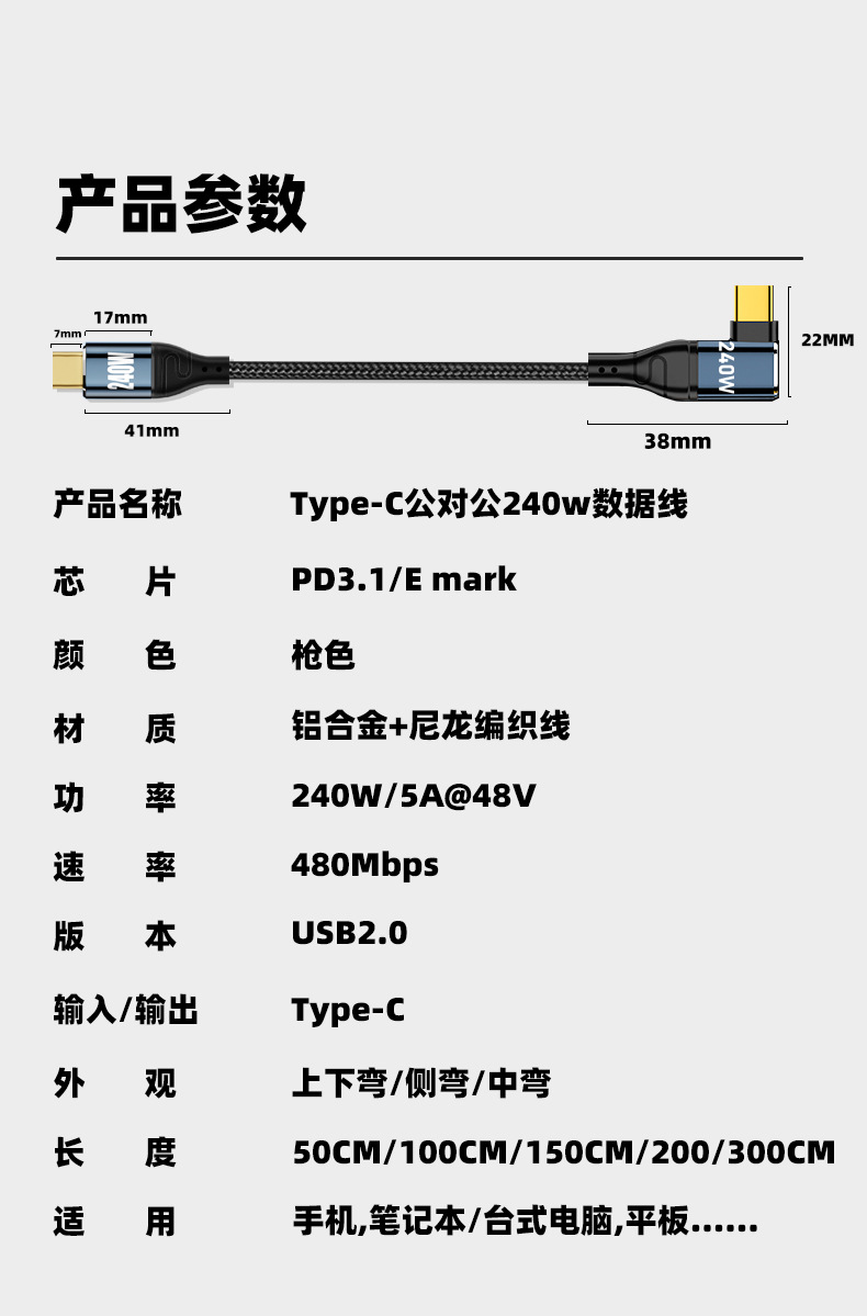 Color Classification 【 0.5m 】Double Type-C Side-Curved Braided Data Cable●480Mbps Transmission●240W Fast Charging,【 1m 】Double Type-C Side-Curved Braided Data Cable●480Mbps Transmission●240W Fast Charging,【 1.5m 】Double Type-C Side-Curved Braided Data Cable●480Mbps Transmission●240W Fast Charging,【 2m 】Double Type-C Side-Curved Braided Data Cable●480Mbps Transmission●240W Fast Charging,【 3m 】Double Type-C Side-Curved Braided Data Cable●480Mbps Transmission●240W Fast Charging,【 0.5m 】Dual Type-C Three-Dimensional Curved Braided Data Cable●480Mbps Transmission●240W Fast Charging,【 1m 】Dual Type-C Three-Dimensional Curved Braided Data Cable●480Mbps Transmission●240W Fast Charging,【 1.5m 】Dual Type-C Three-Dimensional Curved Braided Data Cable●480Mbps Transmission●240W Fast Charging,【 2m 】Dual Type-C Three-Dimensional Curved Braided Data Cable●480Mbps Transmission●240W Fast Charging,【 3m 】Dual Type-C Three-Dimensional Curved Braided Data Cable●480Mbps Transmission●240W Fast Charging,【 0.5m 】Dual Type-C Straight Braided Data Cable●480Mbps Transmission●240W Fast Charging,【 1m 】Dual Type-C Straight Braided Data Cable●480Mbps Transmission●240W Fast Charging,【 1.5m 】Dual Type-C Straight Braided Data Cable●480Mbps Transmission●240W Fast Charging,【 2m 】Dual Type-C Straight Braided Data Cable●480Mbps Transmission●240W Fast Charging,【 3m 】Dual Type-C Straight Braided Data Cable●480Mbps Transmission●240W Fast Charging,【 0.5m 】Double Type-C Mid-Curved Braided Data Cable●480Mbps Transmission●240W Fast Charging,【 1m 】Double Type-C Mid-Curved Braided Data Cable●480Mbps Transmission●240W Fast Charging,【 1.5m 】Double Type-C Mid-Curved Braided Data Cable●480Mbps Transmission●240W Fast Charging,【 2m 】Double Type-C Mid-Curved Braided Data Cable●480Mbps Transmission●240W Fast Charging,【 3m 】Double Type-C Mid-Curved Braided Data Cable ● 480Mbps Transmission ● 240W Fast Charging