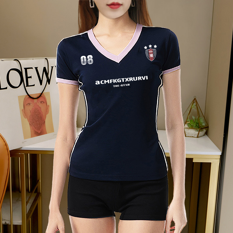 2026 New Retro Hot Girl V-Neck Color-Blocking Printed Short-Sleeve T-Shirt for Women, Summer Sports Slim-Fit Trendy Top