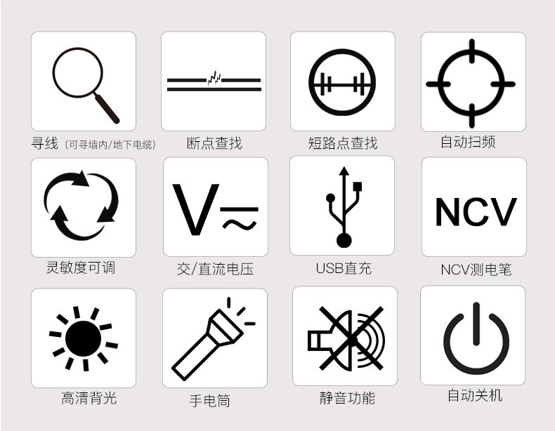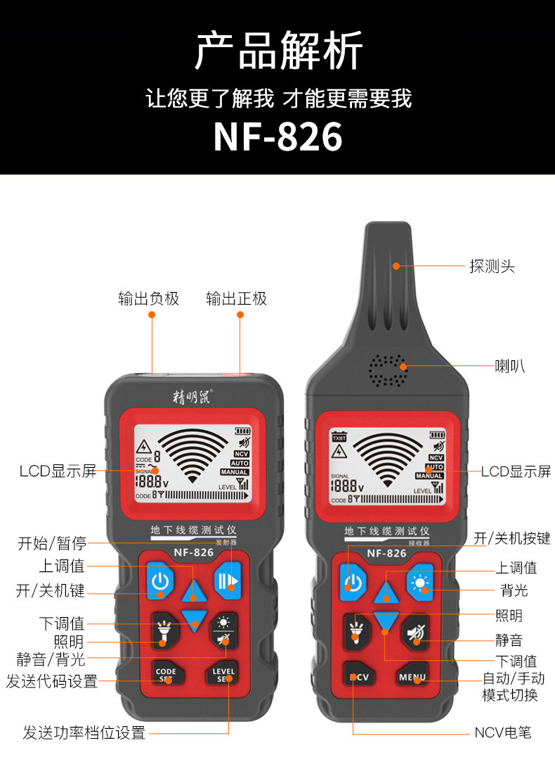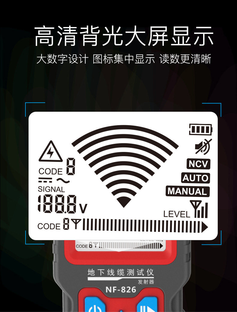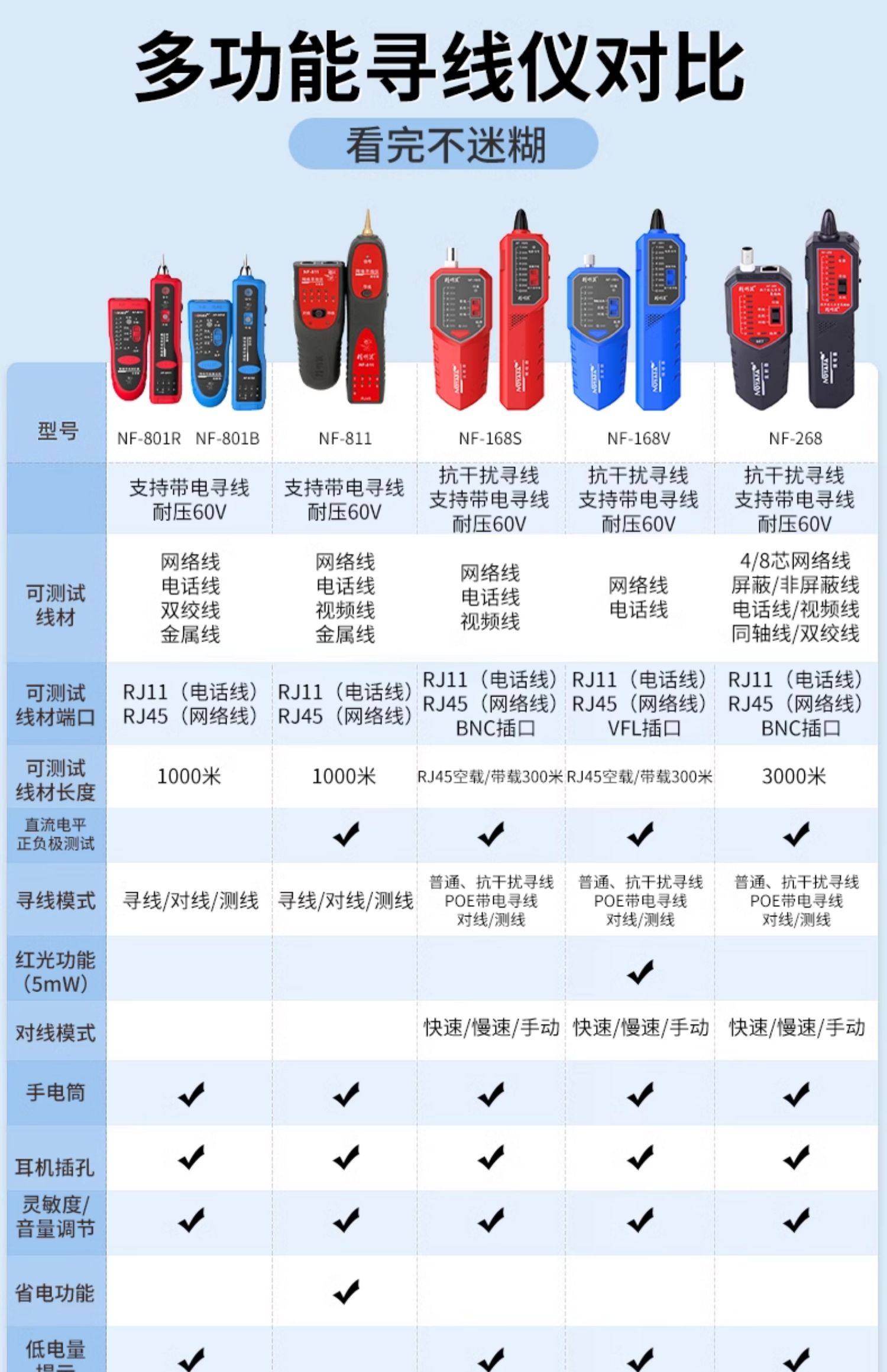 Color Classification Nf-822 Anti-Interference Forced Electricity 380V (Depth Measured 0.5m),Nf-820 Anti-Interference Forced Electricity 380V (Depth Measured 2m),Nf-826 Wire and Cable Detector Withstand Voltage 400V (Can Measure Underground Short Circuit Breakpoint),Nf-801R Second Generation Upgraded Version - Telephone Search Cable - Network Cable - Cable Wire,Nf-801B Second Generation Upgraded Version - Same Function,Different Colors,Nf-801B Set-Rechargeable Recycling-Anti-Burn Upgraded Version,Nf-801R Set-Rechargeable Recycling-Anti-Burn Upgraded Version,Nf-811 Can Find Wires - Test and Break - Measure Four-Core Network Cables,Nf-168S--Anti-Interference and Noise-Free--Three Line Finding,Nf-168V--With Red Light--Three Kinds of Line Finding,Nf-268 Anti-Interference - Poe Live Cable Finding - Four-Core Network Cable Measurement,268 Anti-Interference-Charging Set-Rechargeable Circular Use
