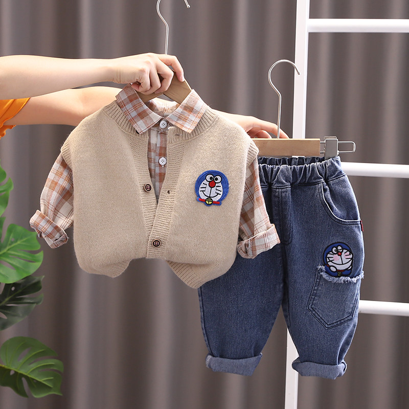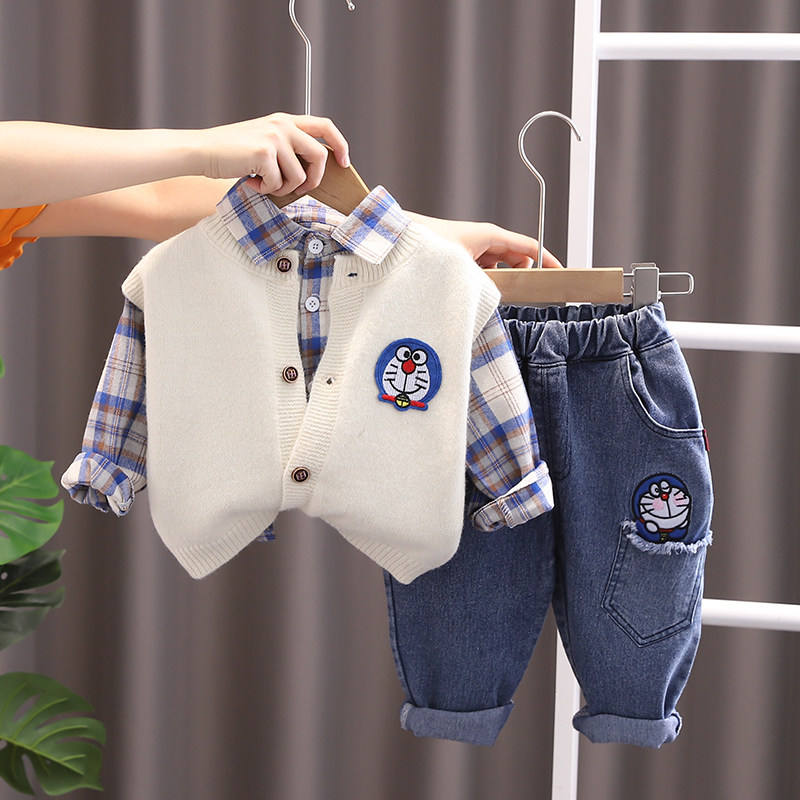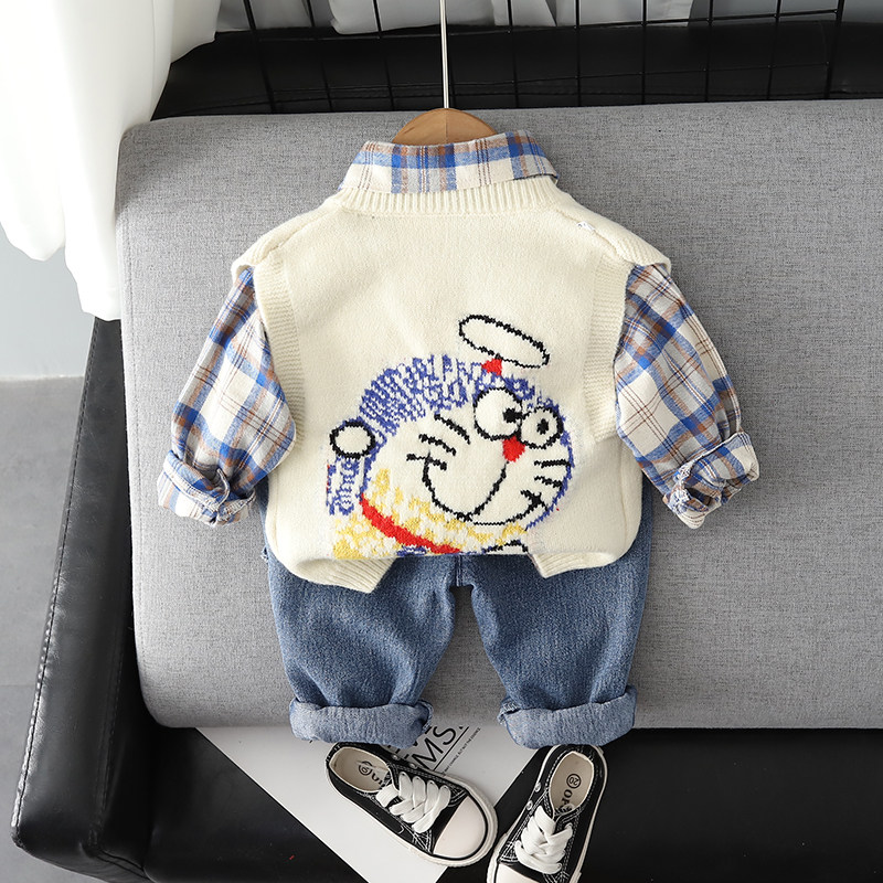 Color Classification B Blue Cat Sweater Three-Piece Set White,B Blue Cat Sweater Three-Piece Khaki Set,B Blue Cat Sweater Three-Piece Set Yellow,Light Brown Three-Piece Suit,Khaki Three-Piece Suit,Gray Three-Piece Suit,Brown Three-Piece Suit