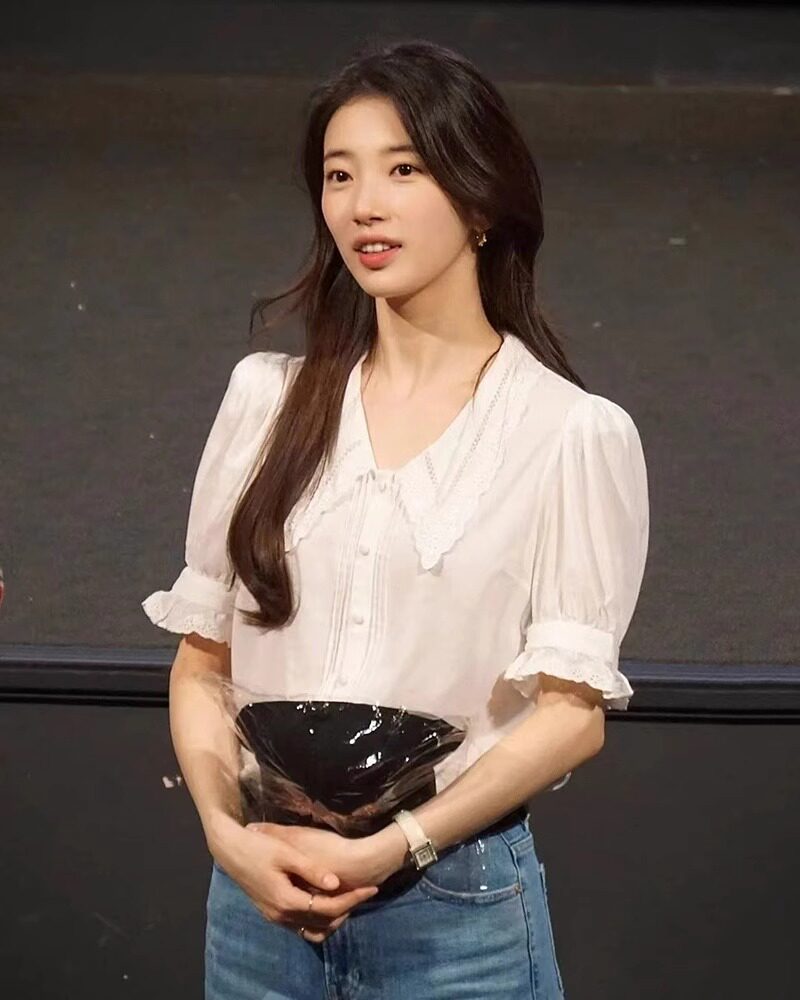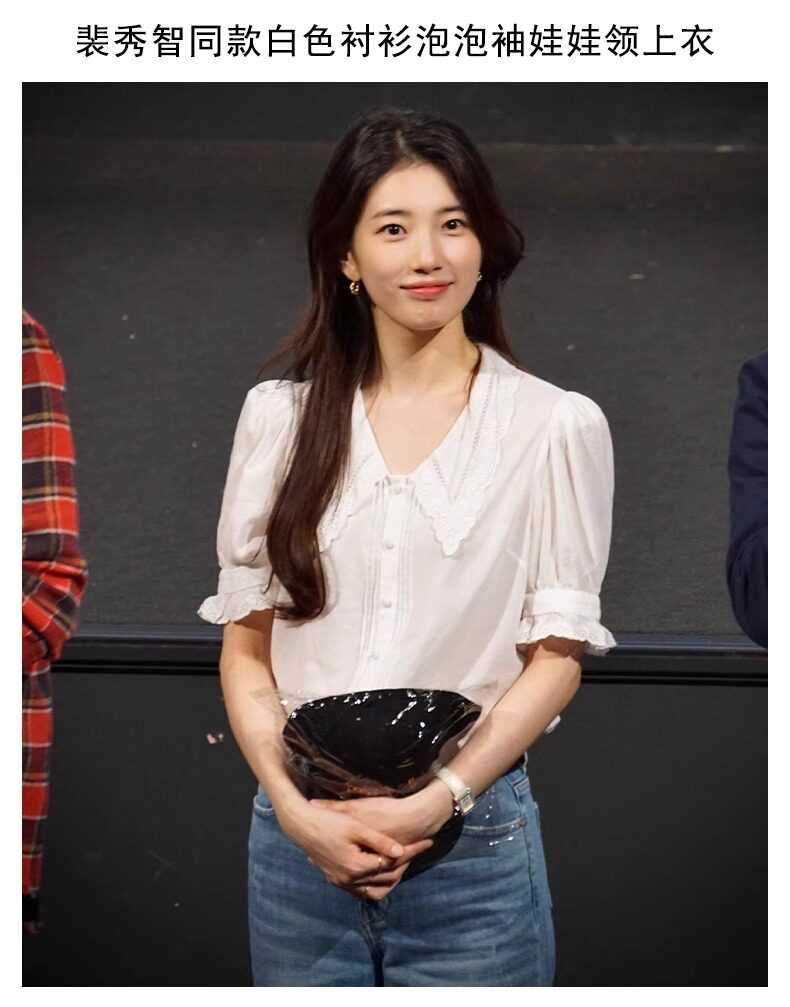 White Lace Puff Short-Sleeve Doll Collar Shirt for Women, Summer French Retro Sweet Blouse, Same Style as Park Choa