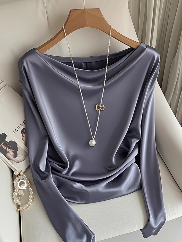French-Style Fashionable Acetate Satin Long-Sleeve Base Shirt, Unique and Super Pretty Gray-Purple Blouse for Women
