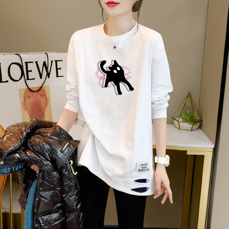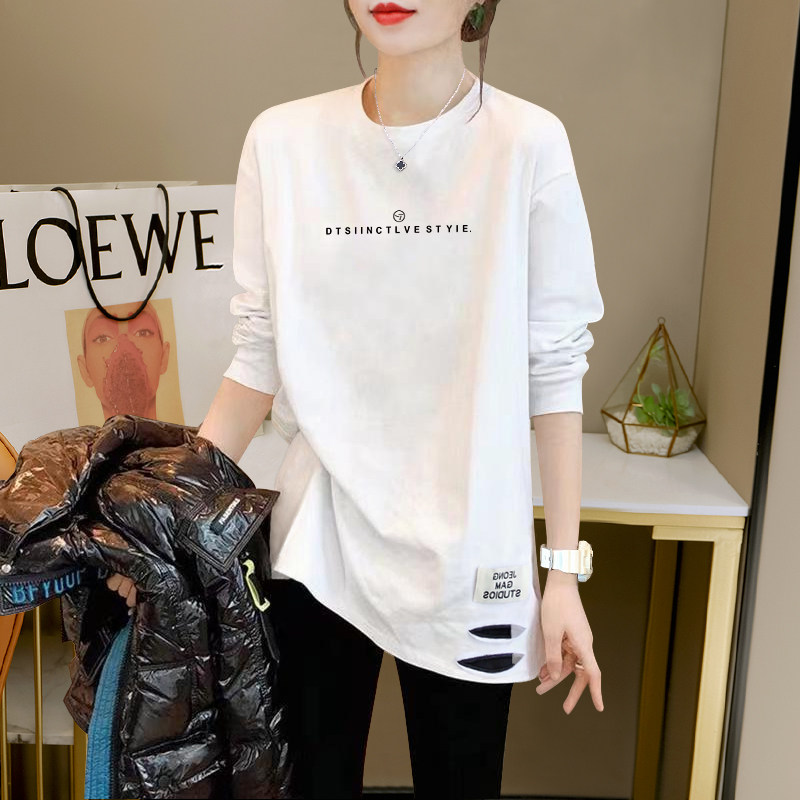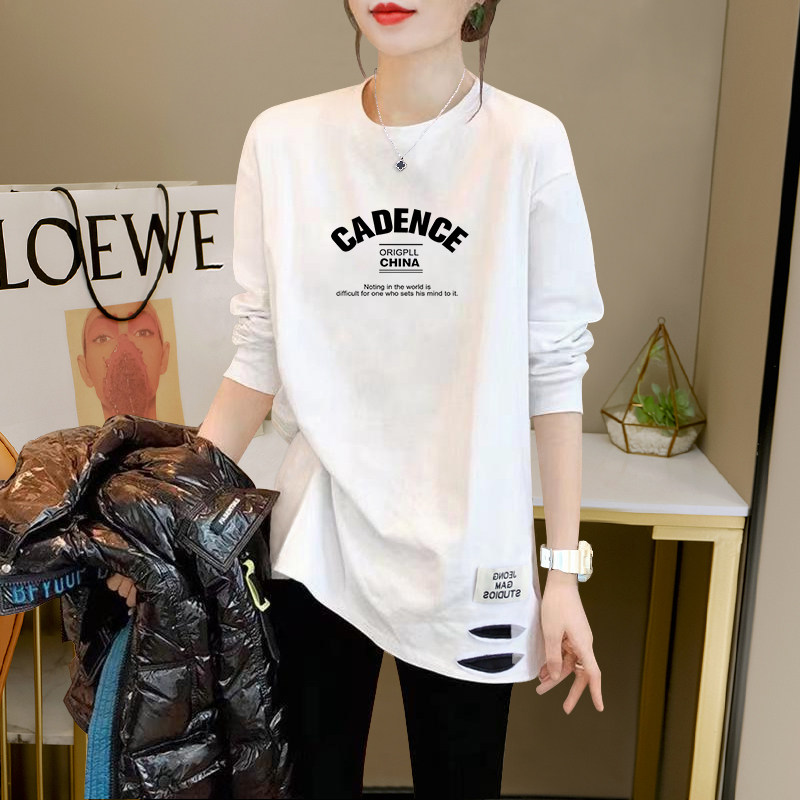 White T-Shirt, Mid-Length Top, Loose Fit, Slimming, Women's Spring and Autumn 2026 New Style, Distressed Design, Printed Long Sleeves ins