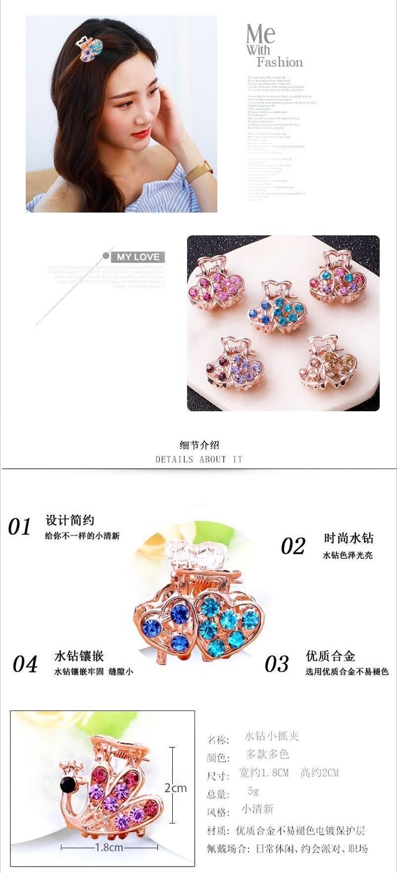 1 Piece Korean Style Small Claw Clip Hairpin Bangs Clip Rhinestone Top Clip Hair Accessory Adult Hair Ornament Hairpin for Women