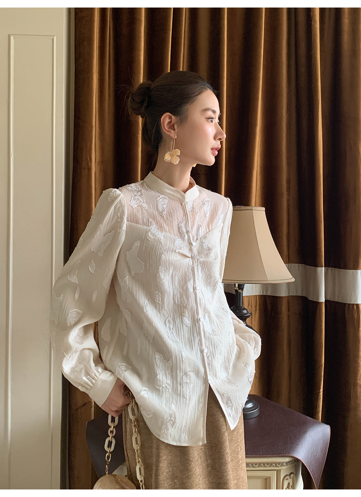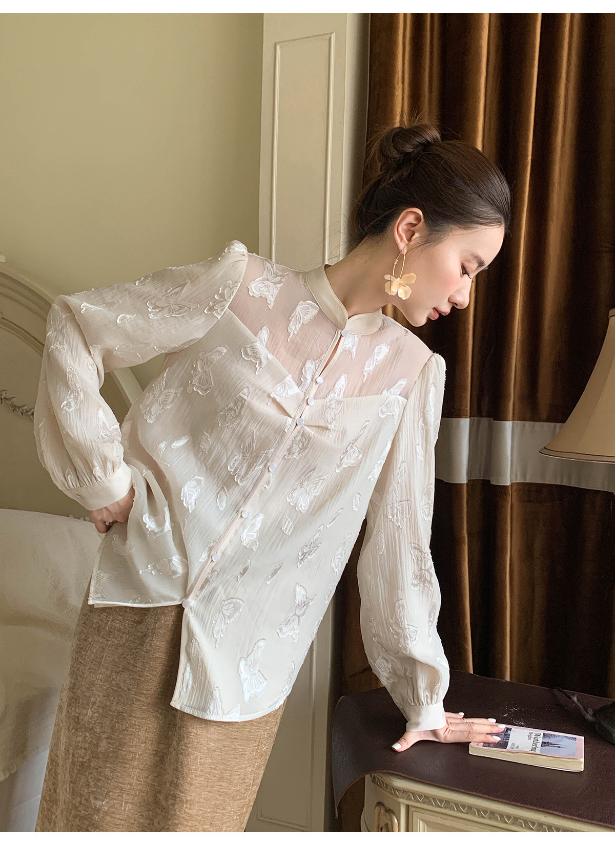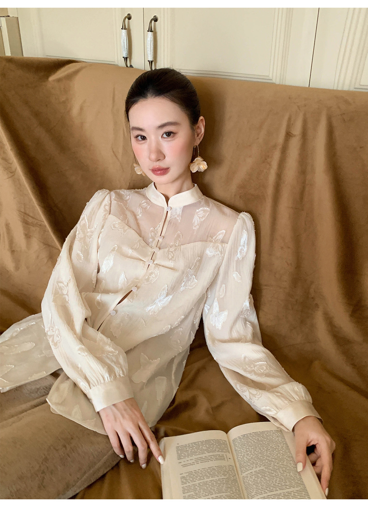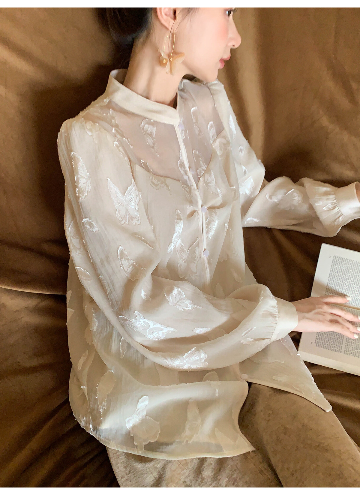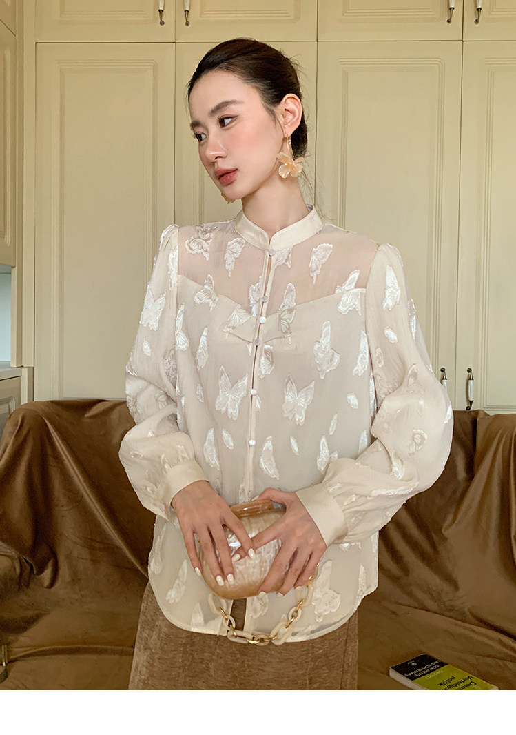 Xxning New Chinese Style Butterfly Jacquard Satin Shirt for Women, Early Spring National Style Long Sleeve Versatile Niche Casual Top