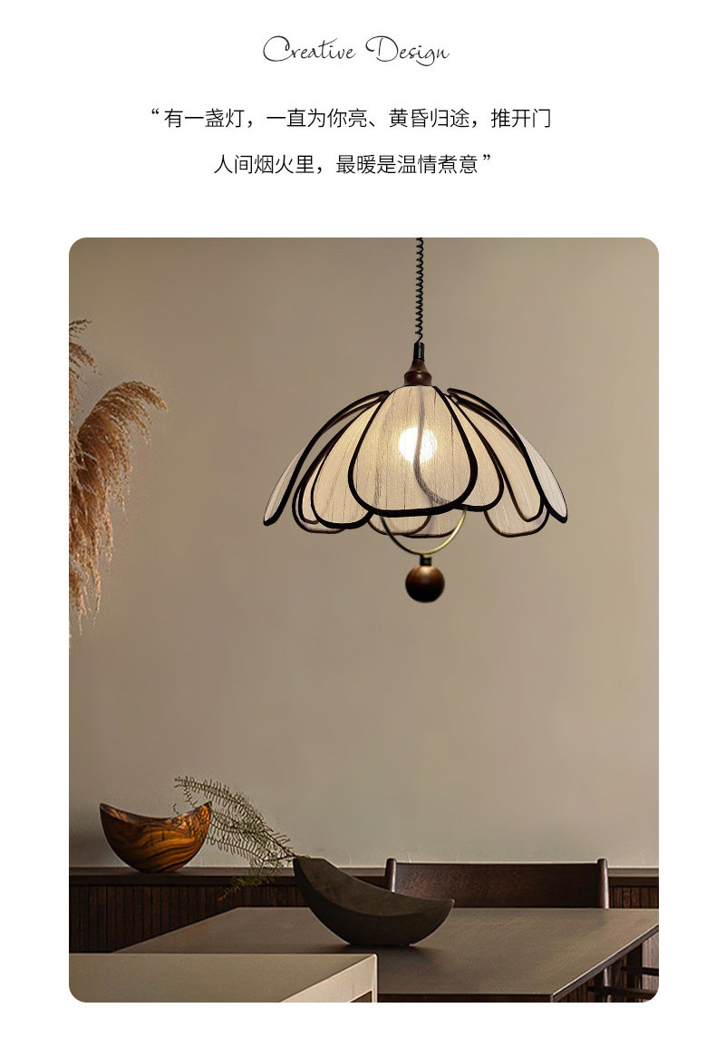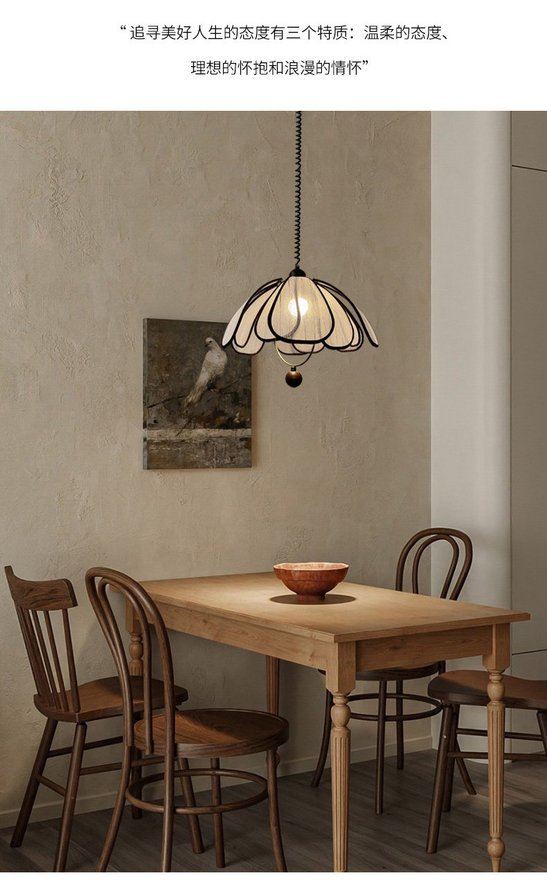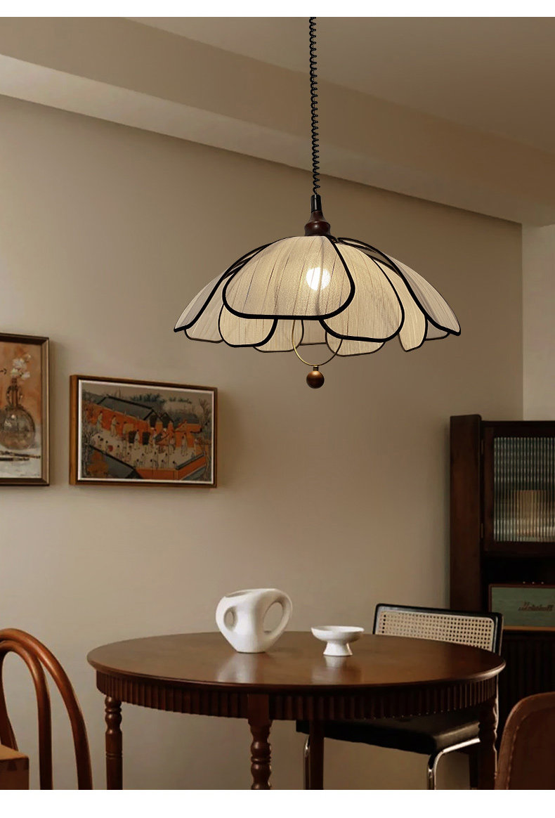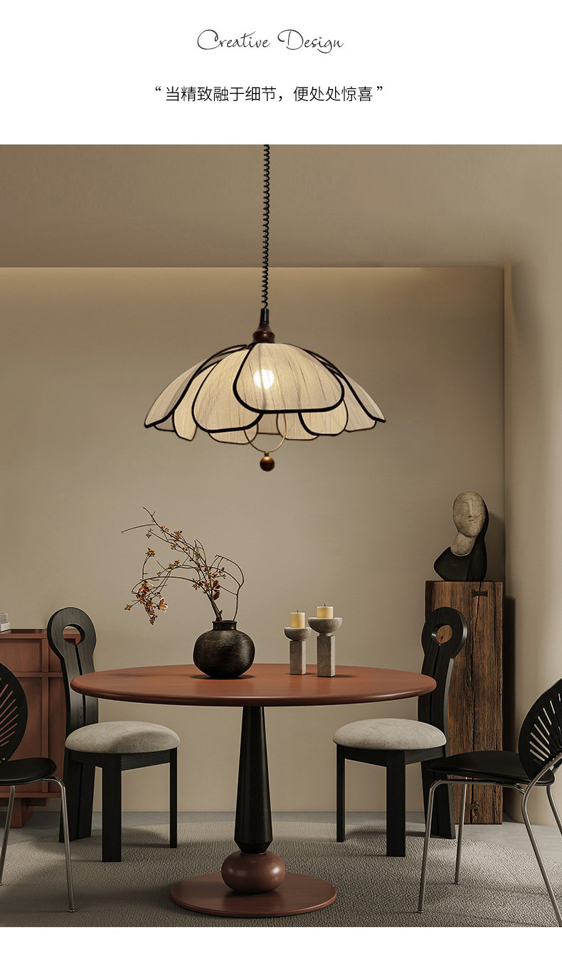 French Vintage Fabric Petal Dining Room Chandelier, Japanese Wabi-Sabi Style, Adjustable Height Bar Counter Tea Room Lighting