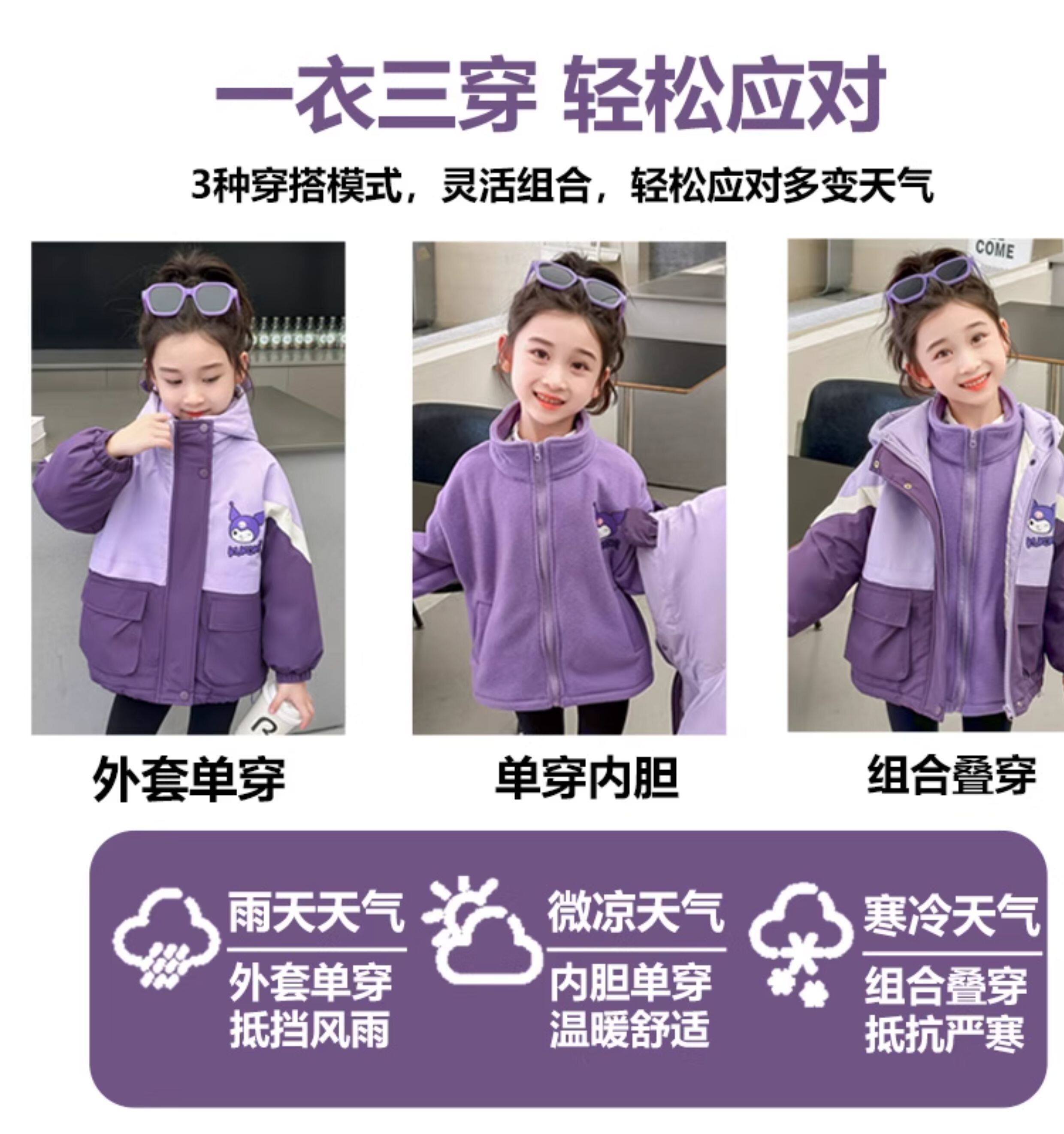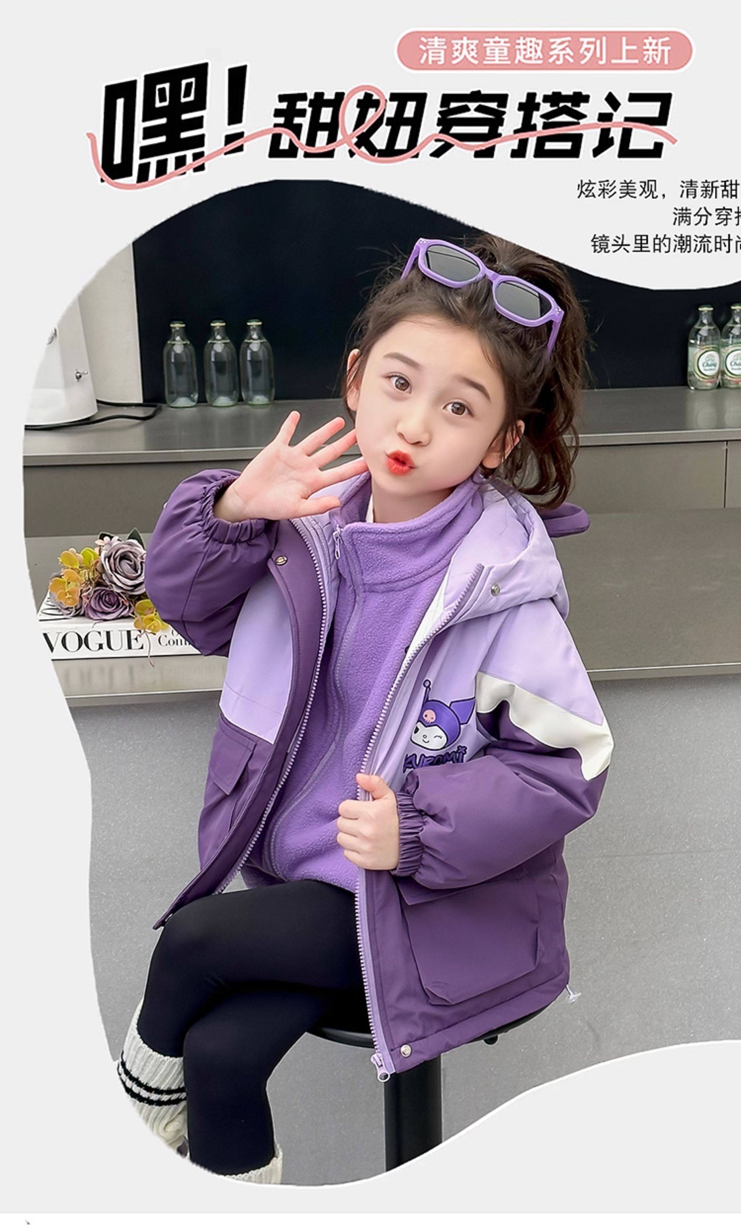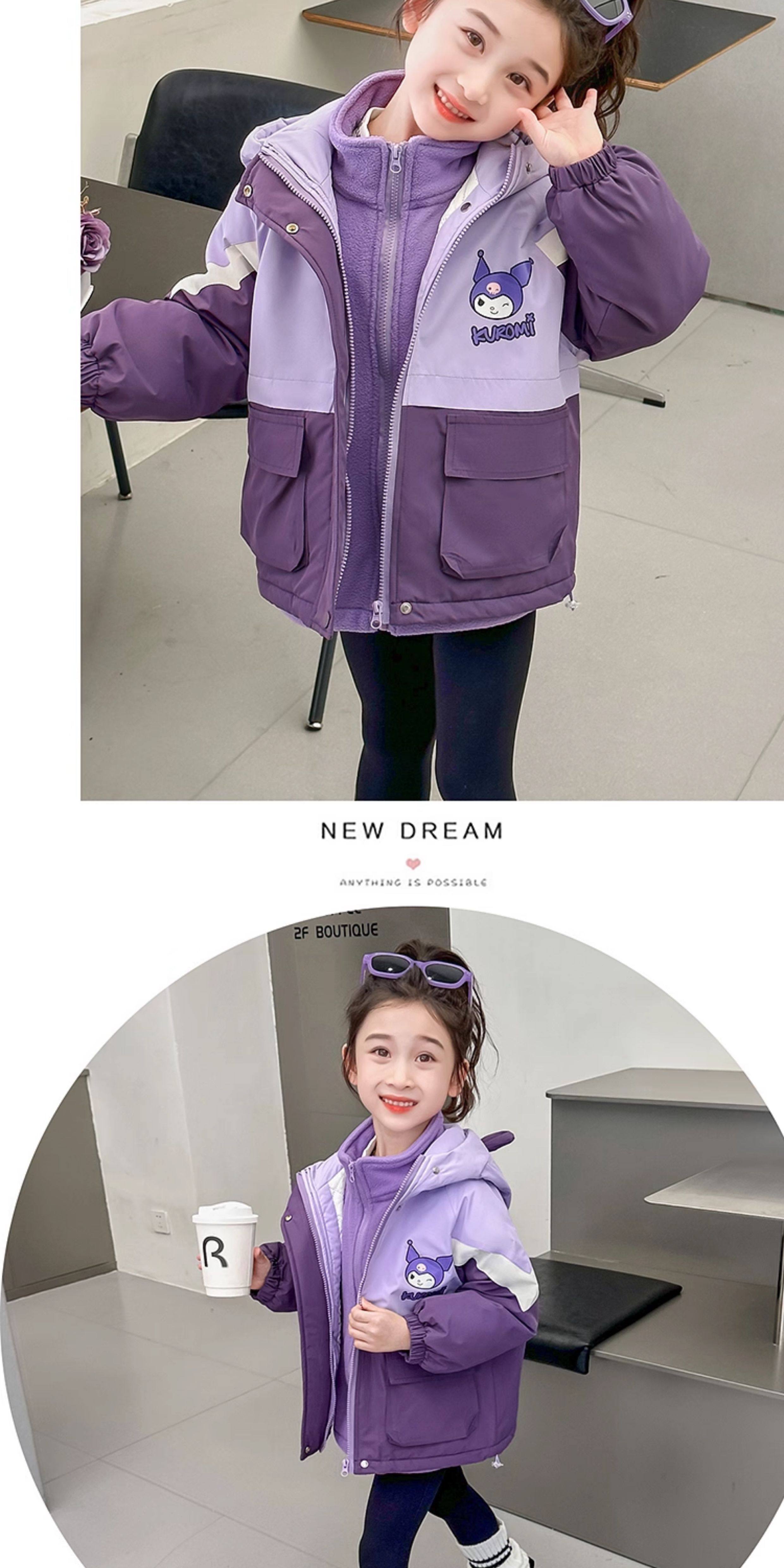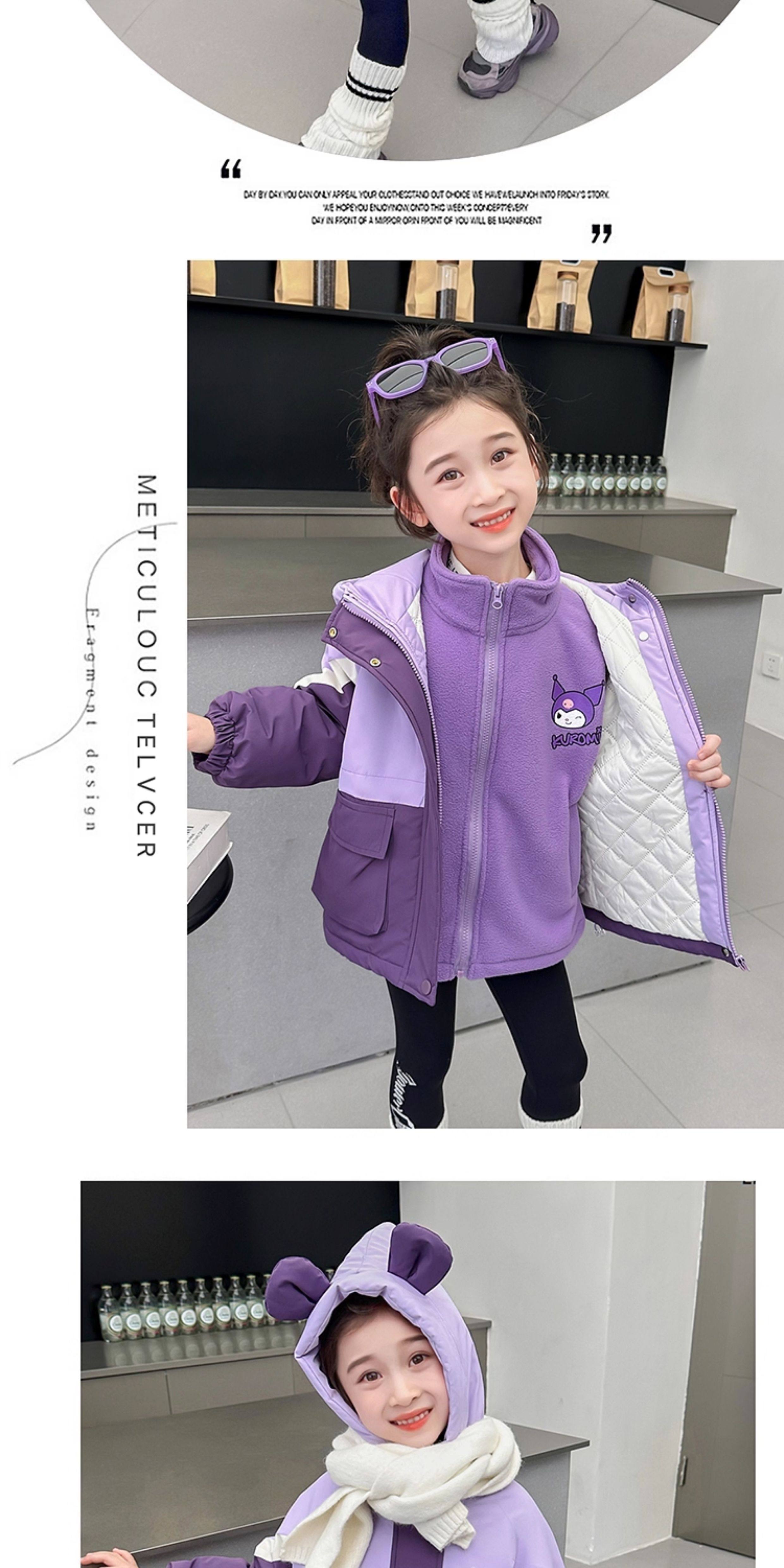 Kuromi Girls' Windbreaker Jacket for Autumn and Winter, Stylish Children's Detachable Three-In-One Padded Coat for Little Girls