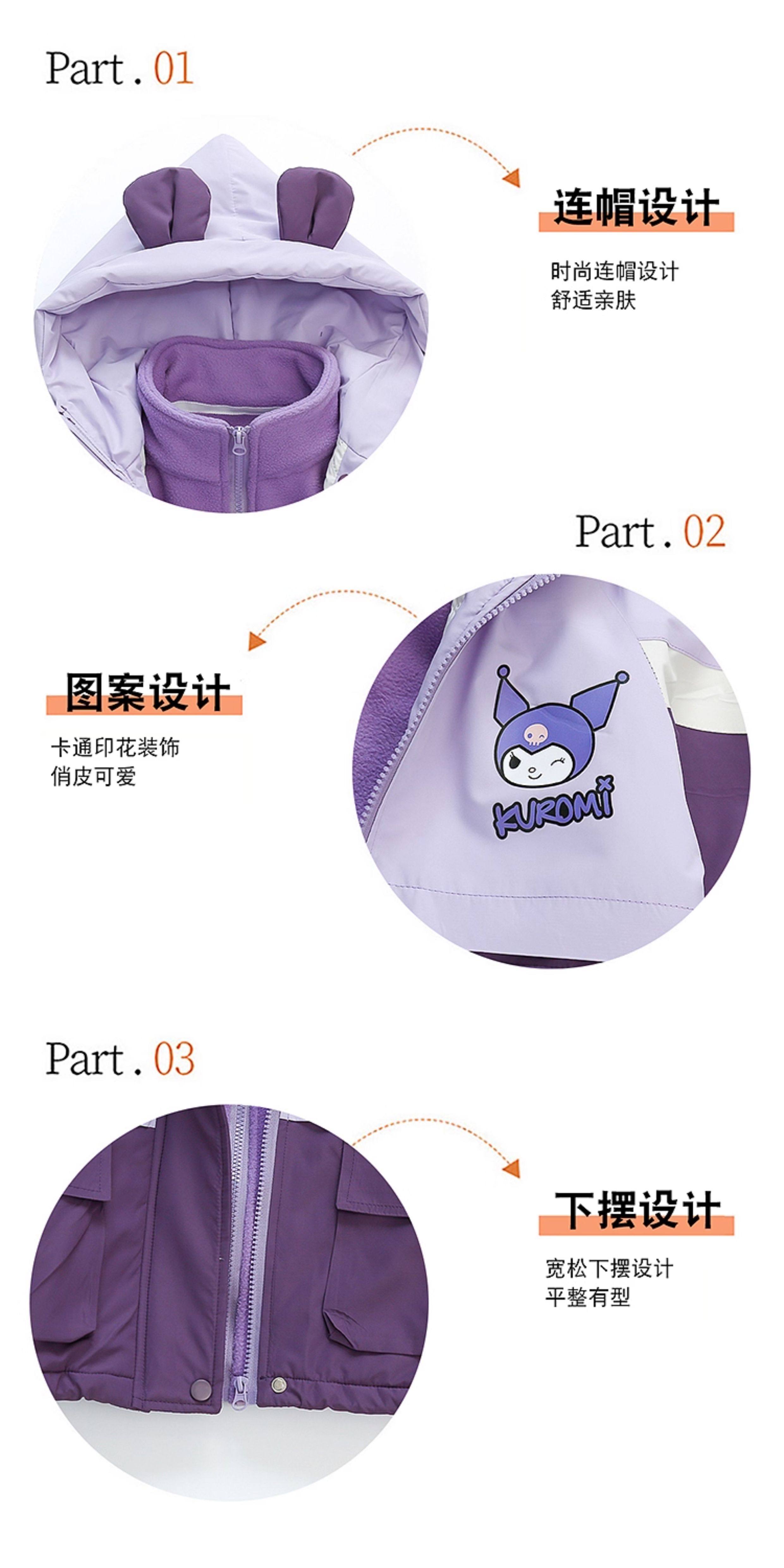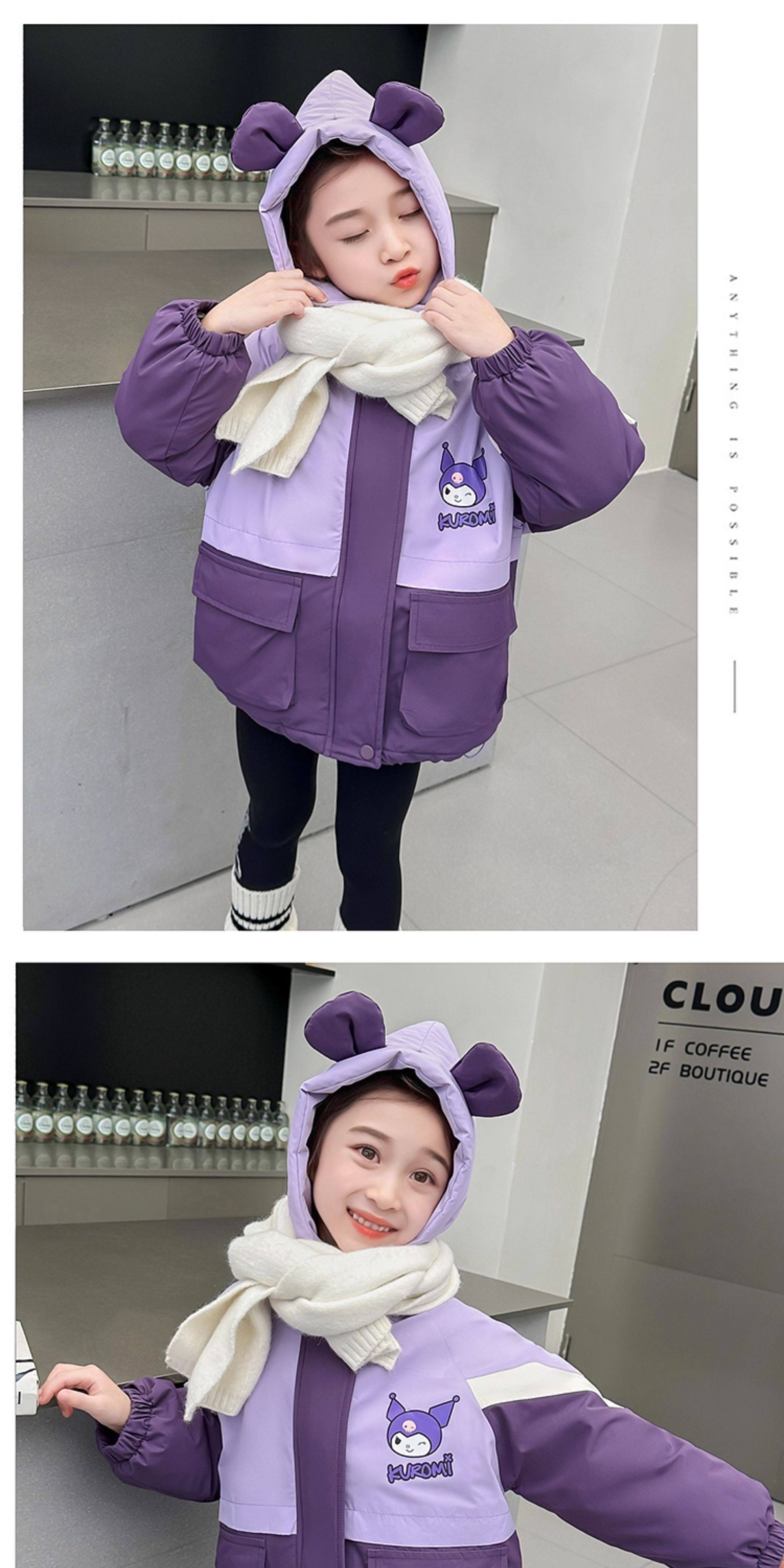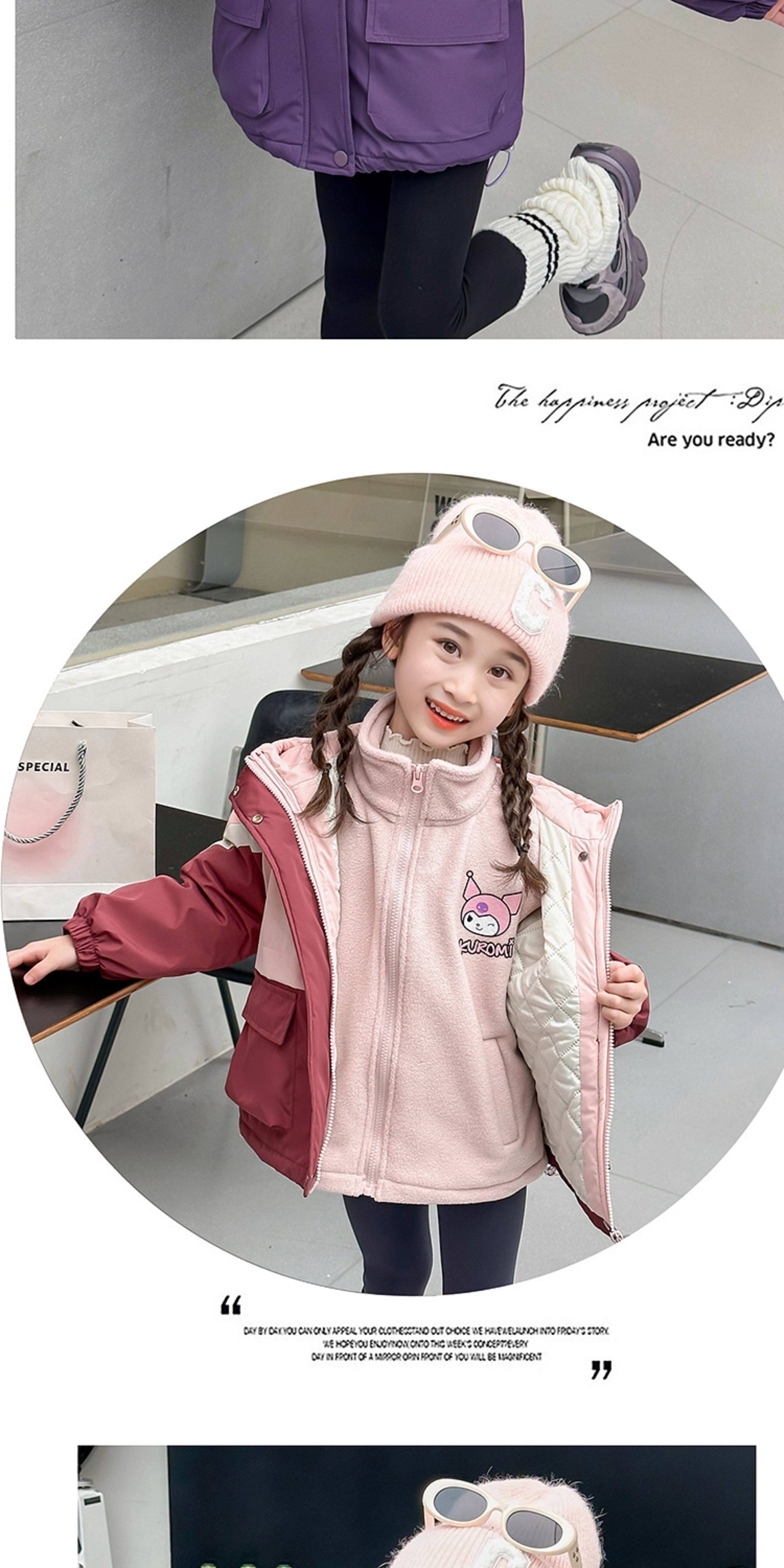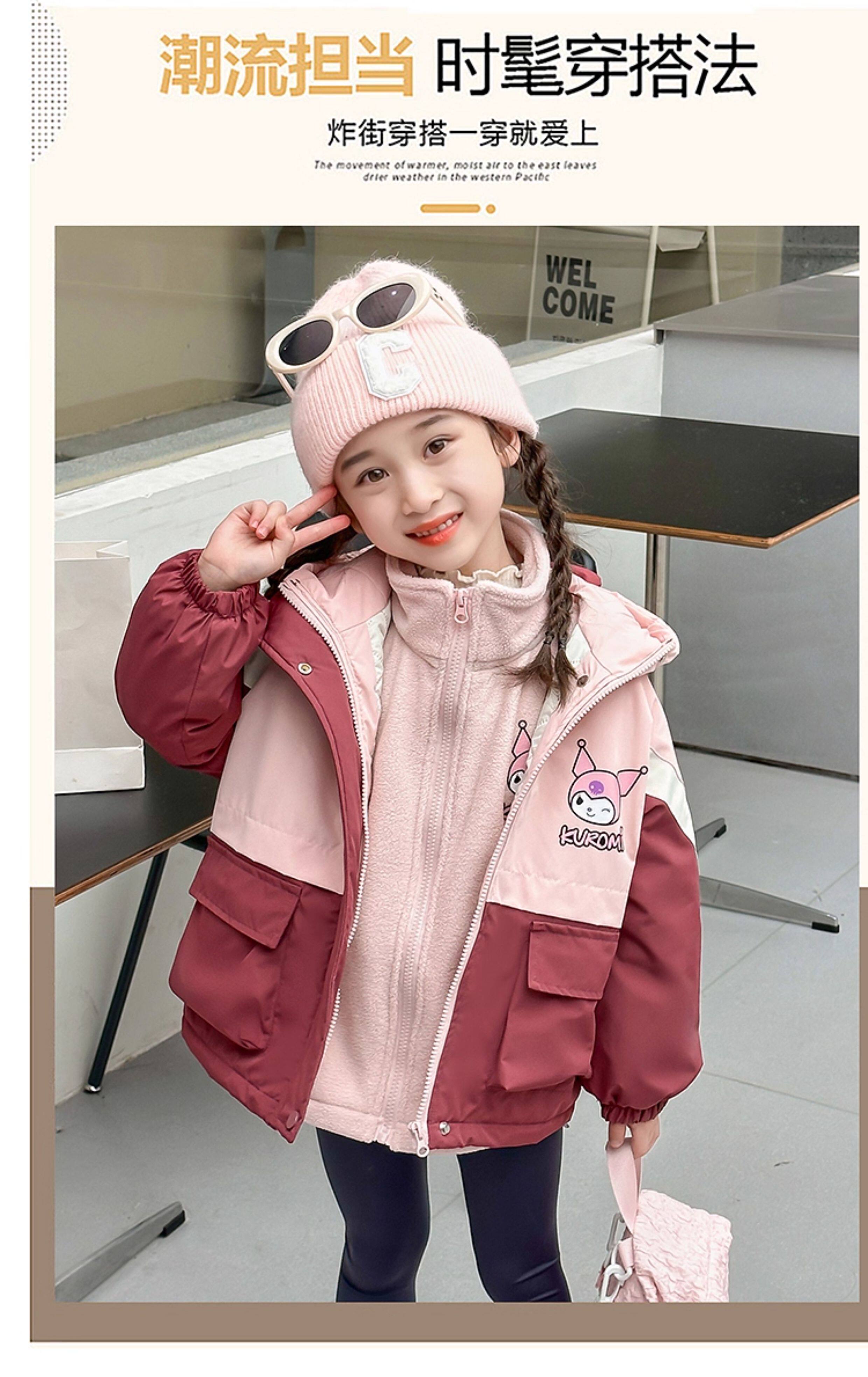 Kuromi Girls' Windbreaker Jacket for Autumn and Winter, Stylish Children's Detachable Three-In-One Padded Coat for Little Girls