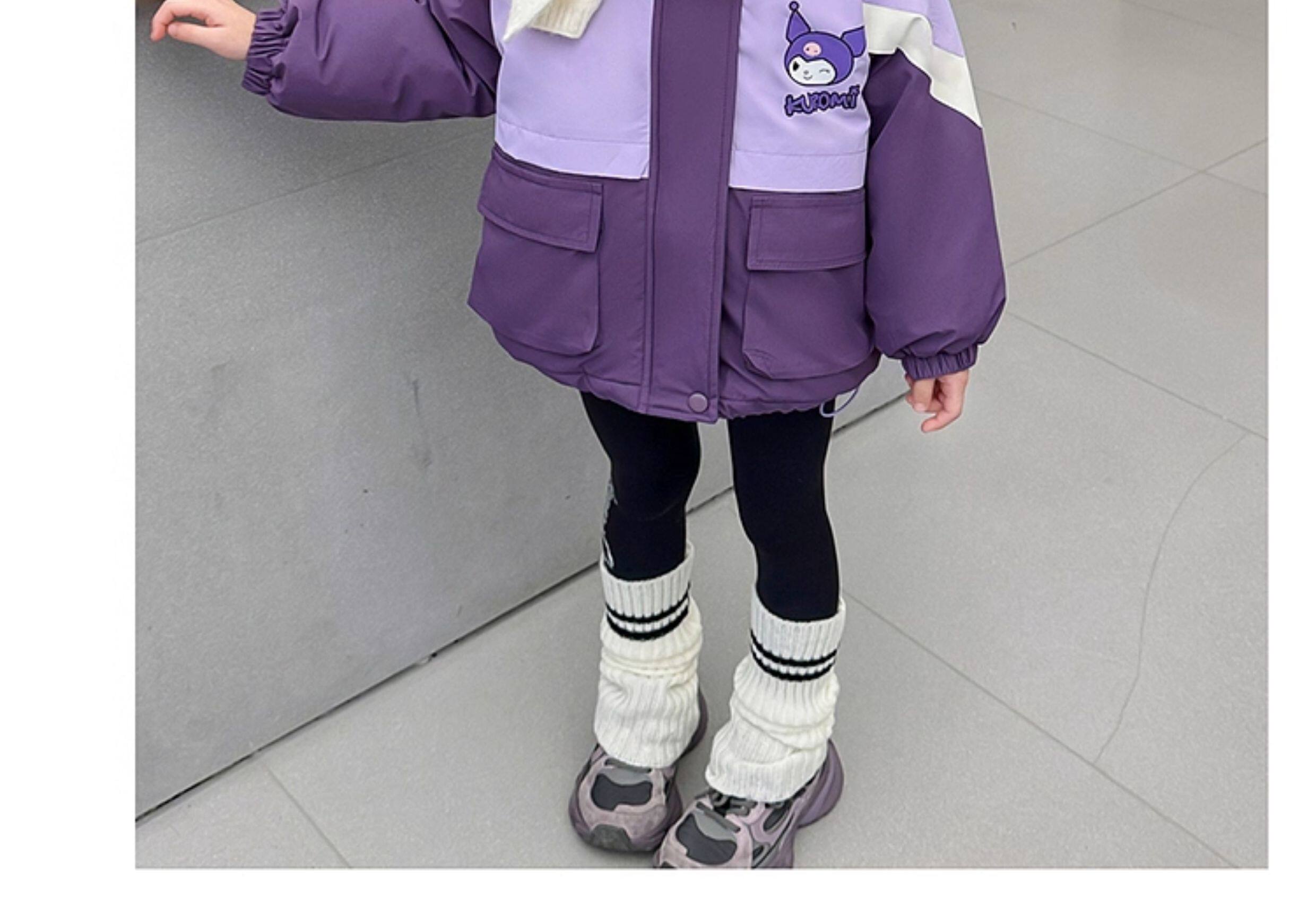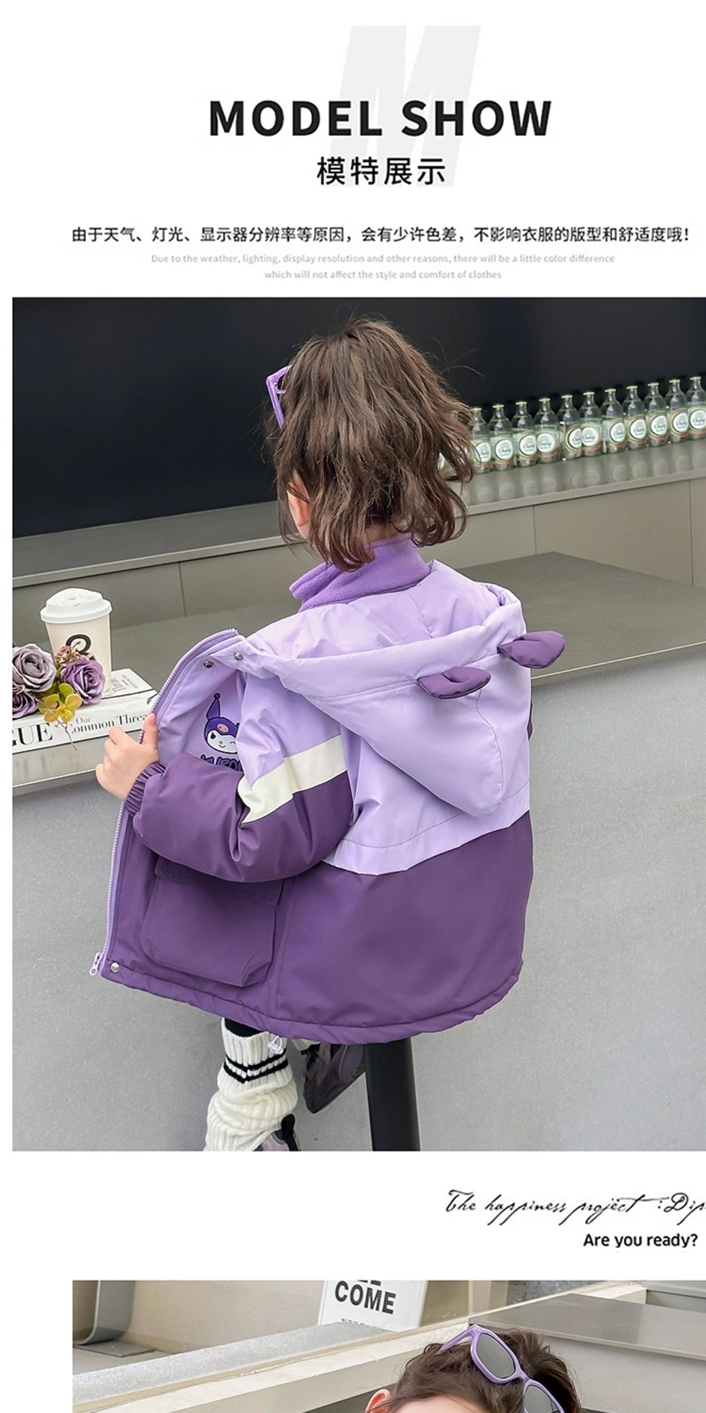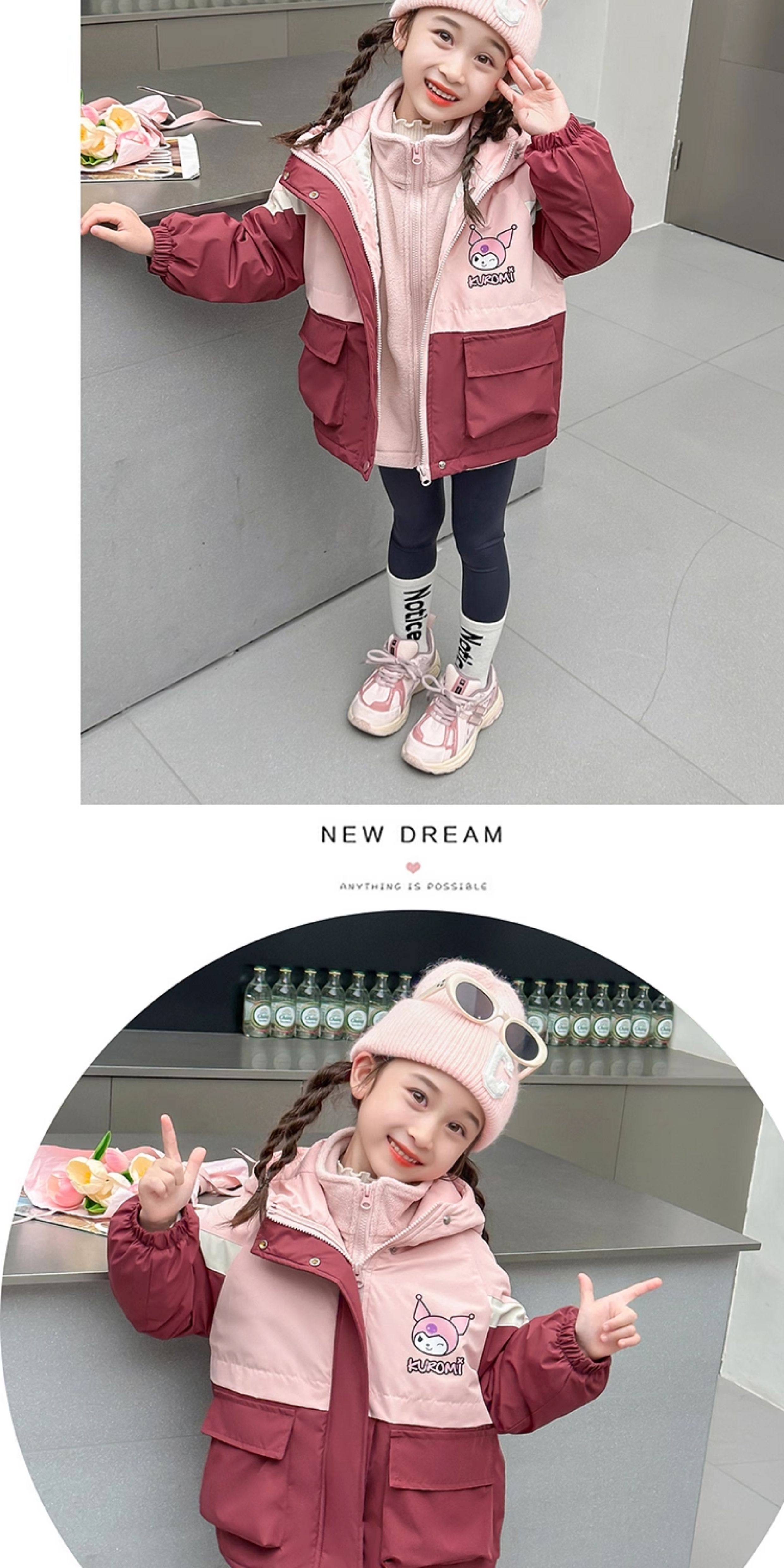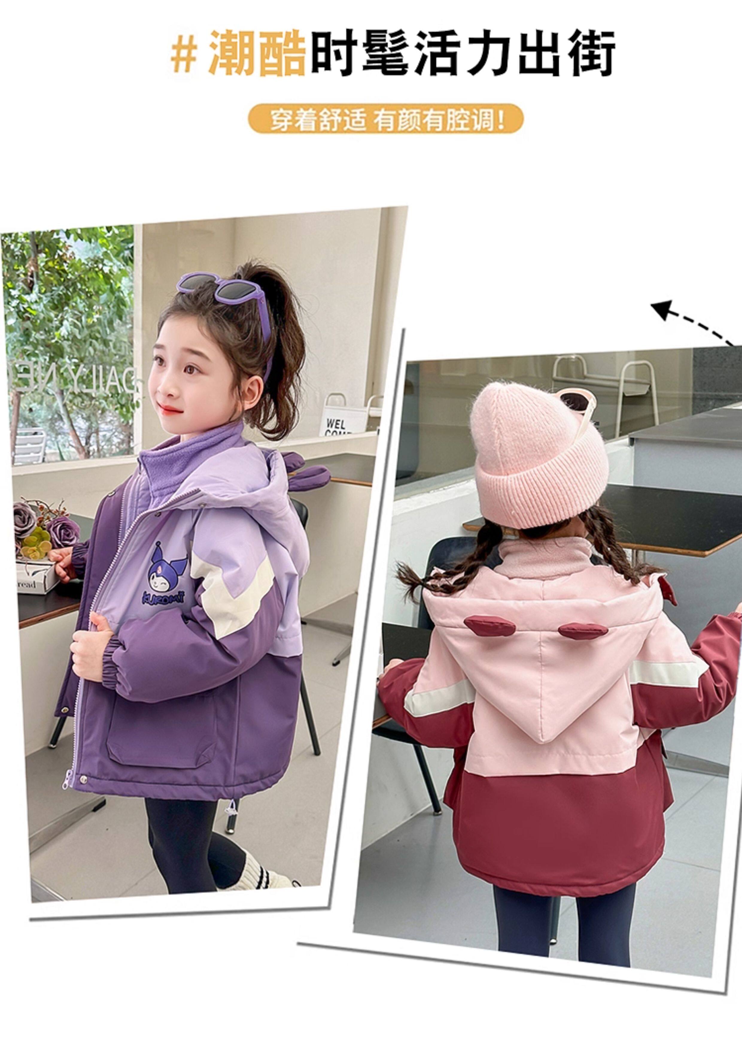 Kuromi Girls' Windbreaker Jacket for Autumn and Winter, Stylish Children's Detachable Three-In-One Padded Coat for Little Girls