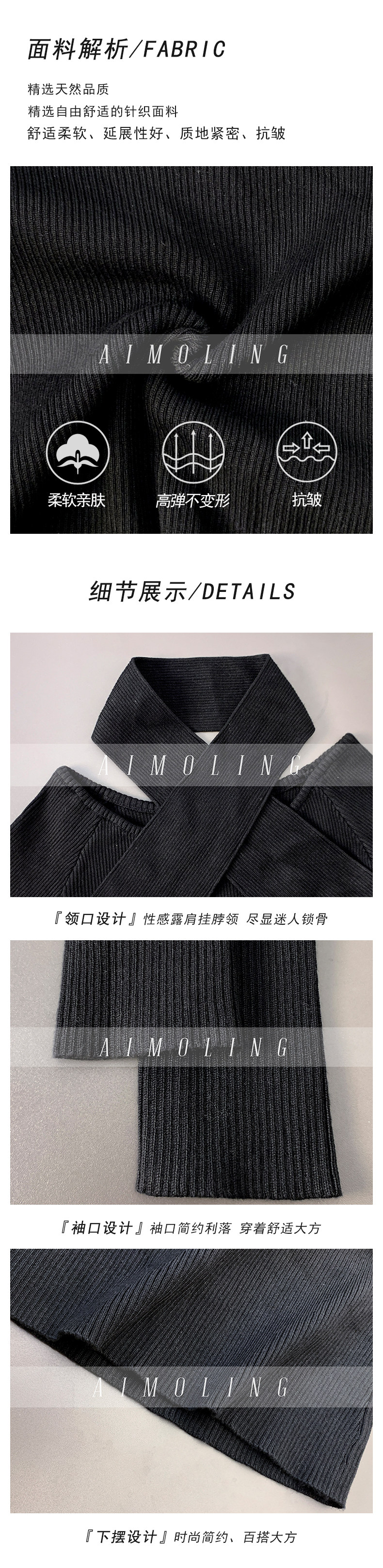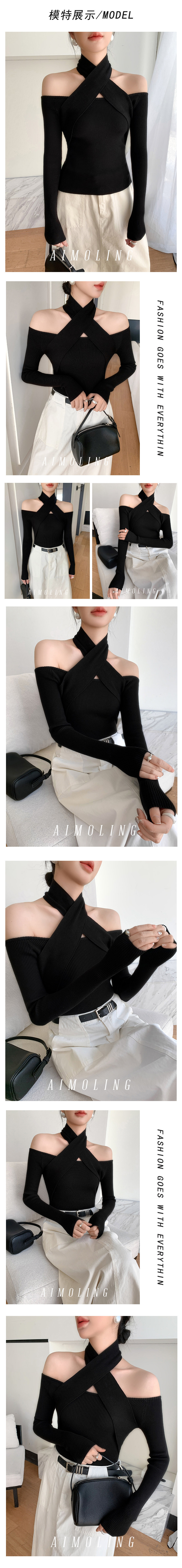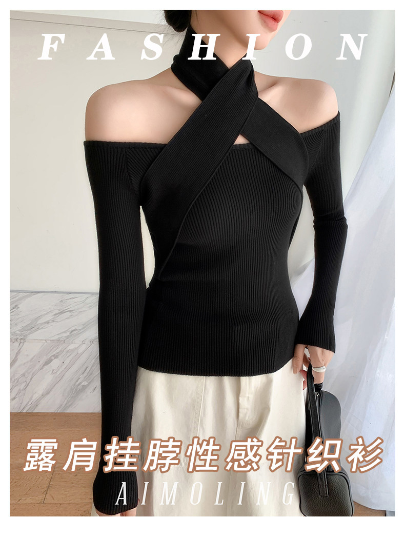 Autumn and Winter Design Wool Knit Sweater for Women, French-Style Black Halter Neck Base Sweater, Sexy Off-Shoulder Top