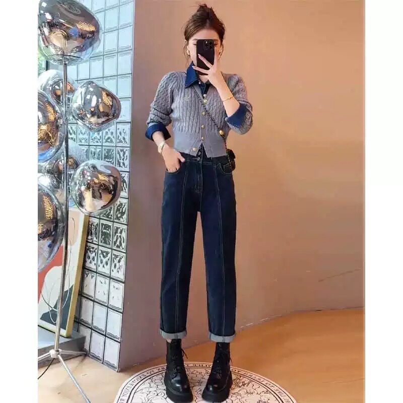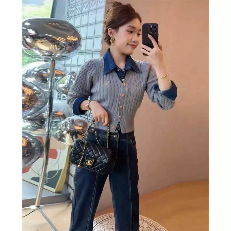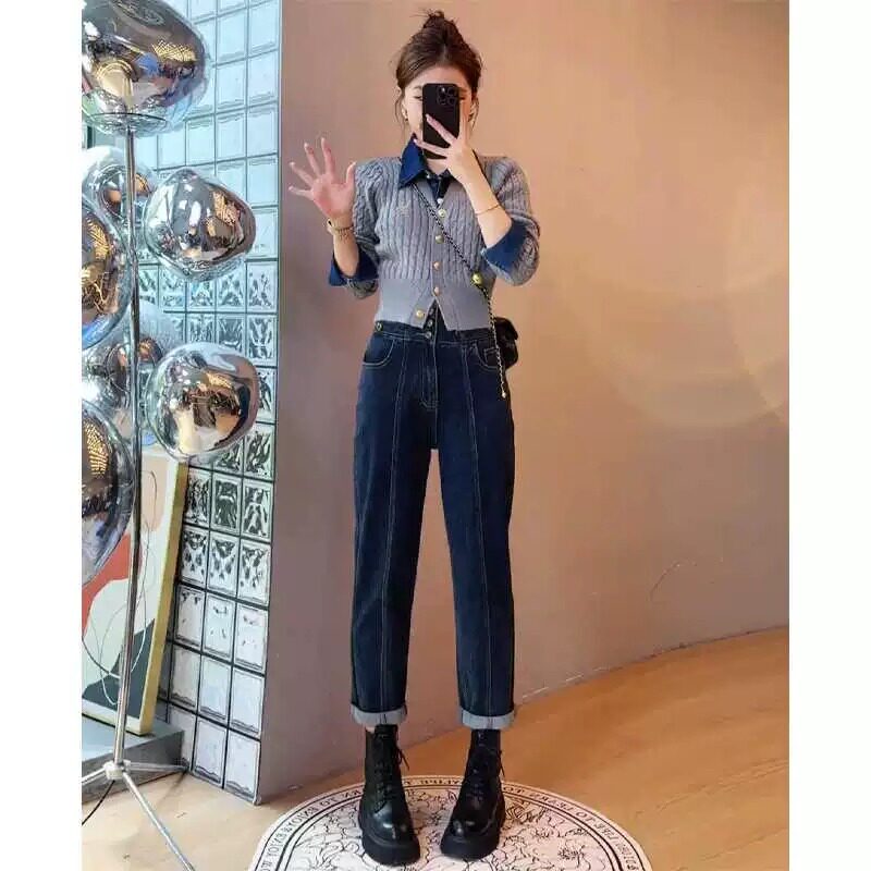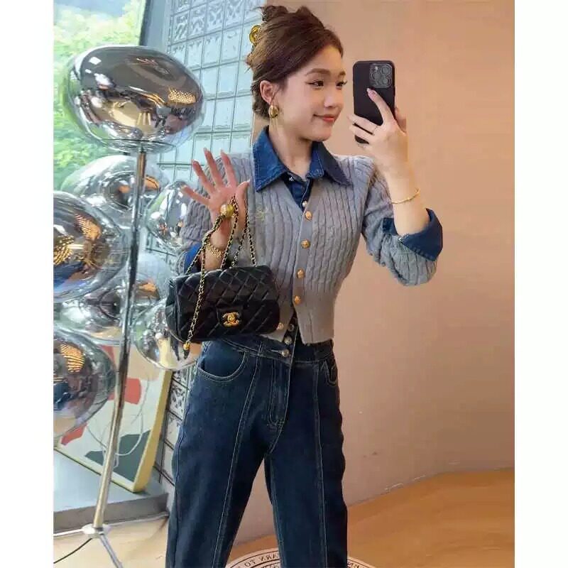 Autumn clothing is matched with a complete set of 2025 new design stitching fake two-piece polo collar sweater and jeans two-piece set