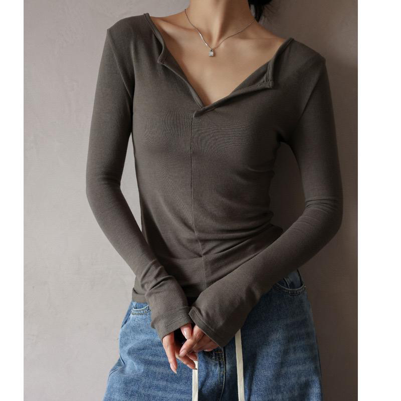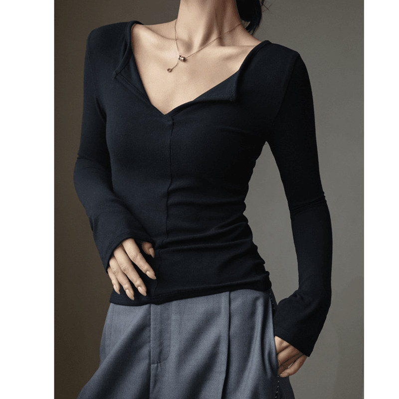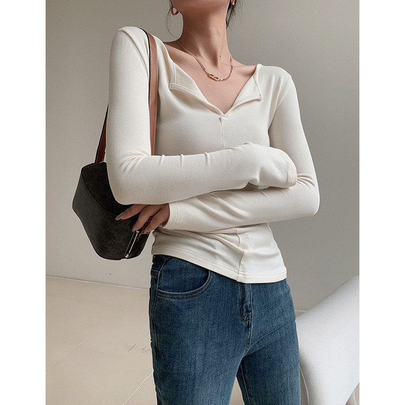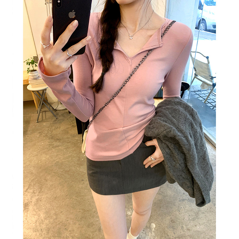 Age-Reducing Lapel Collar V-Neck Knit Sweater for Women, New Autumn and Winter Slim-Fit Solid Color Long-Sleeve T-Shirt Top