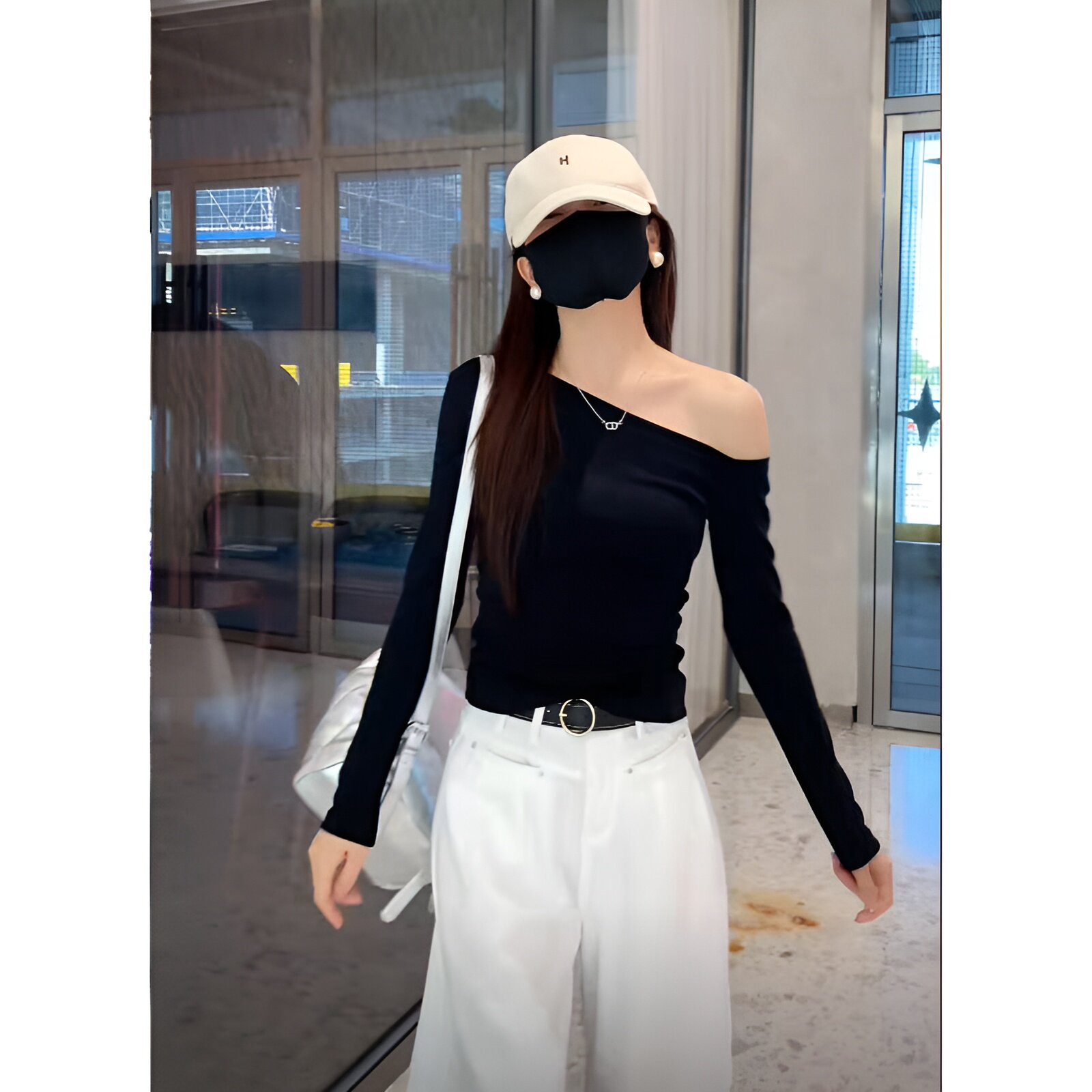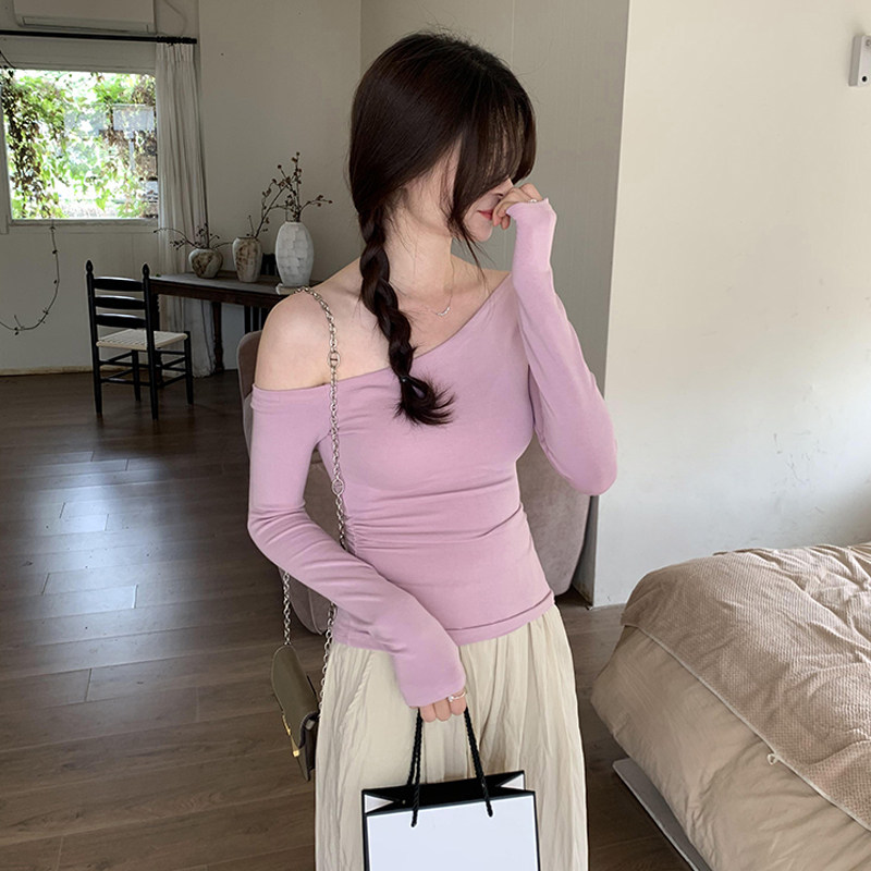 Purely Alluring Spicy Girl Long-Sleeve Asymmetrical Shoulder T-Shirt for Women, Early Autumn High-End Slim-Fit Sexy Off-Shoulder Top