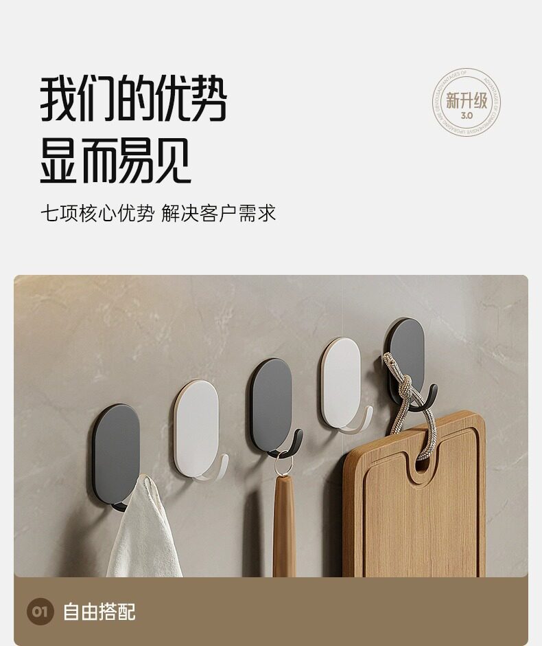 German Precision Hooks with Strong Adhesive, No-Drill Wall-Mounted Hooks for Kitchen, Bathroom, and Behind Doors, Traceless Adhesive Hooks