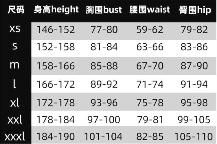China (cm) 160-165/84-86 165-170 / 88-90 167-172 / 92-96 168-173 / 98-102 170-176 / 106-110