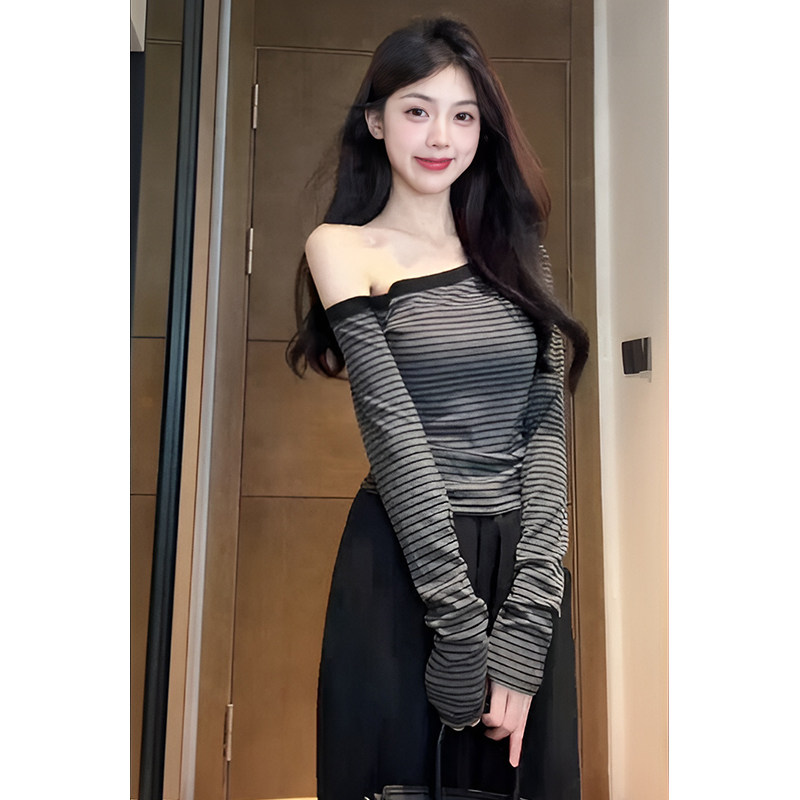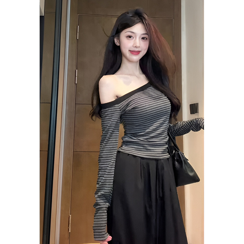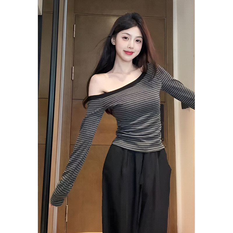 Designed Asymmetrical Striped Base Shirt for Women, Autumn Long-Sleeve Off-Shoulder Slim-Fit Versatile Shoulder-Baring Short Top for Trendy Girls