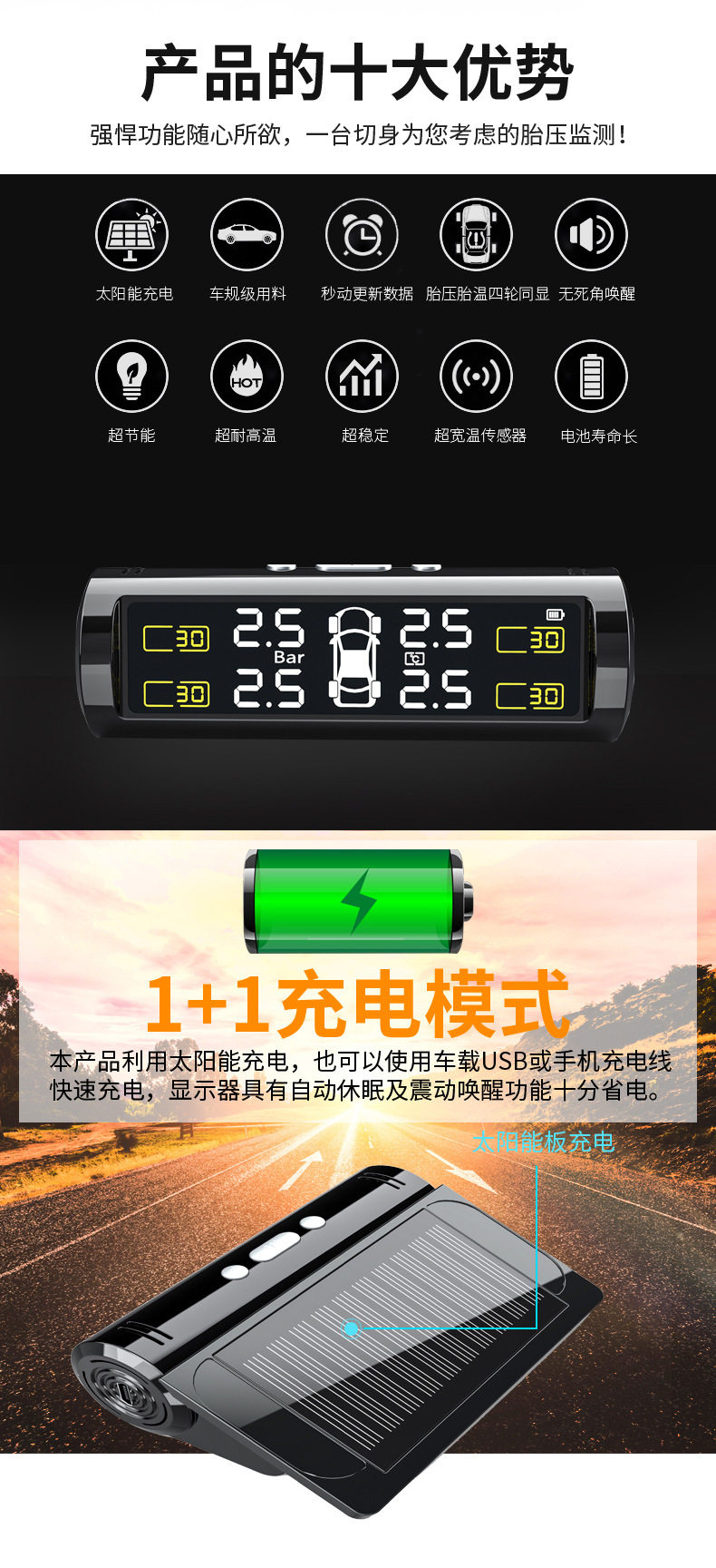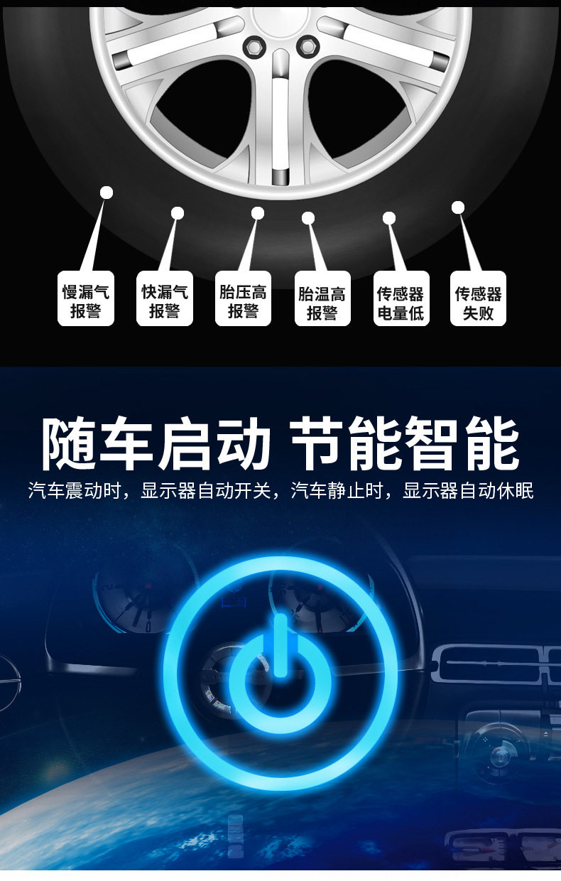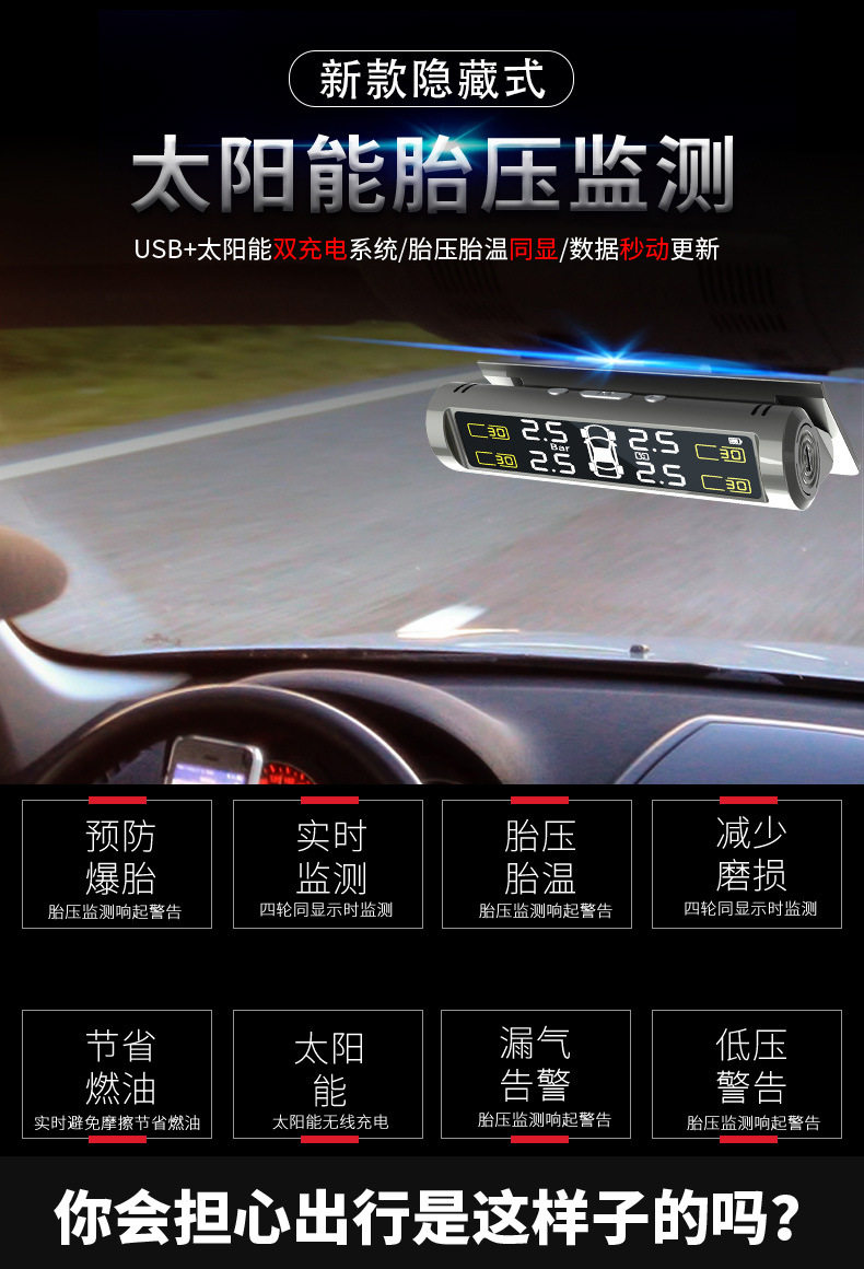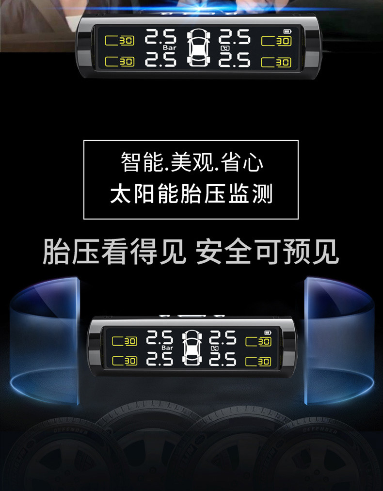 Tire Pressure Monitor External and Internal Car Tire Detector Wireless Solar-Powered Tire Pressure Hidden High-Precision