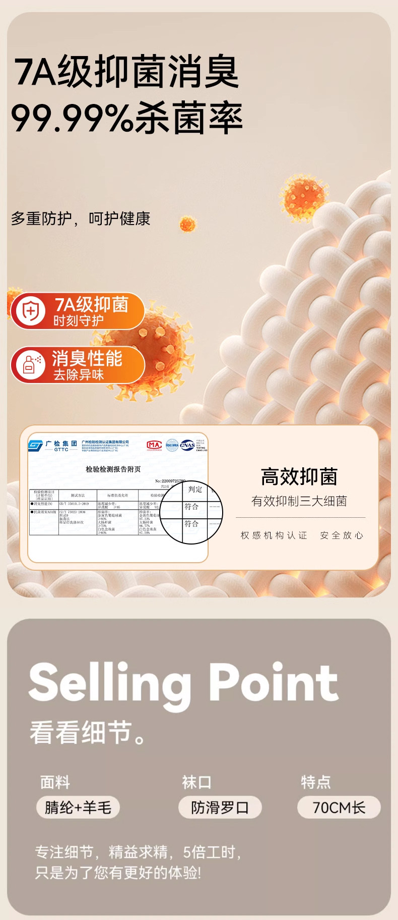 Fabric material ingredients Polyester fiber 57.5%, polyacrylonitrile fiber (acrylic fiber) 20.6%, polyamide fiber (nylon) 15.4%, wool 5%, polyurethane elastic fiber (spandex) 1.5%