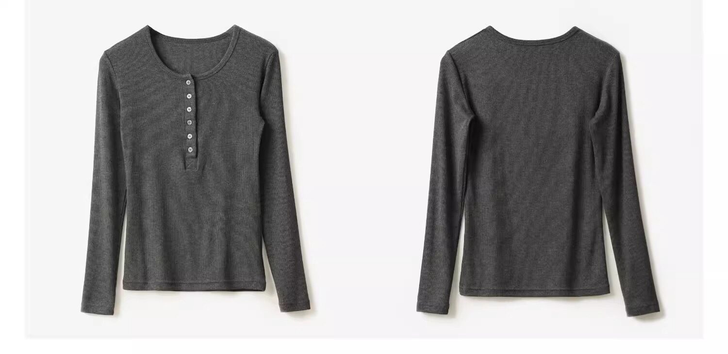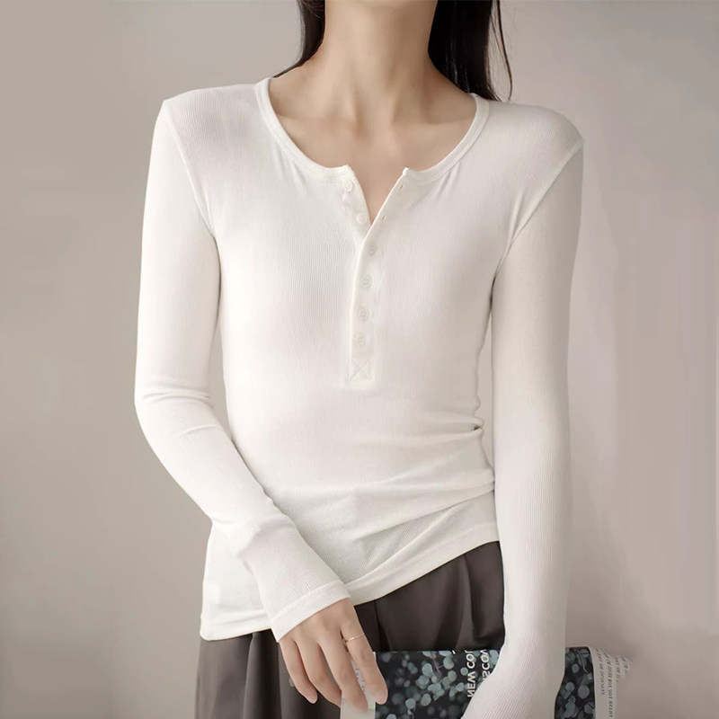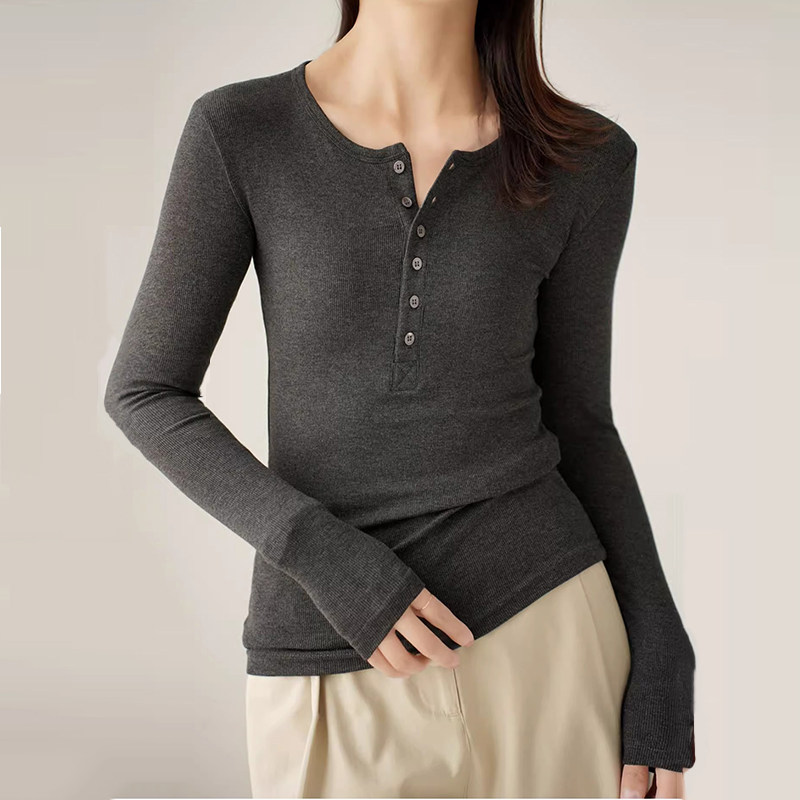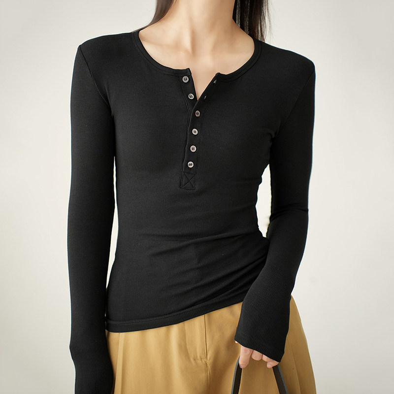 Threaded Button Henry Collar Long-Sleeve Inner T-Shirt for Women, Autumn and Winter American Style Unique Half-Open Collar Slimming Base Shirt Top