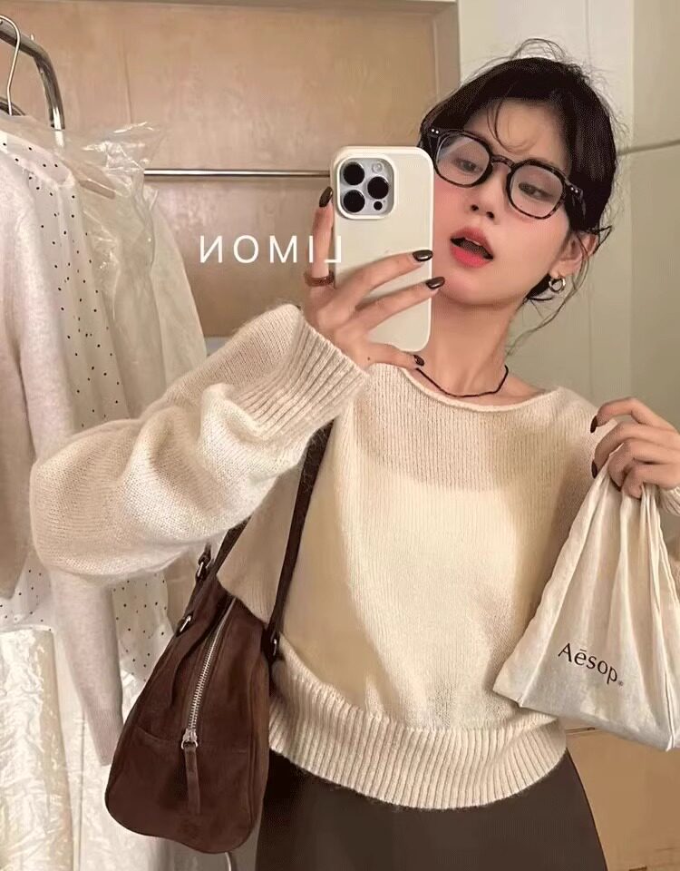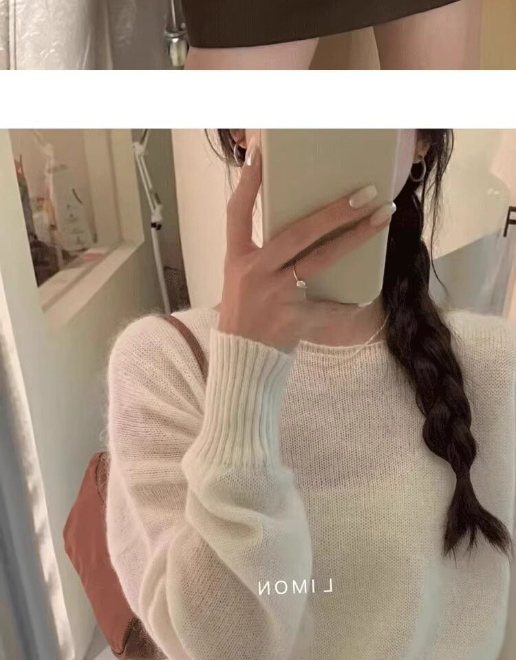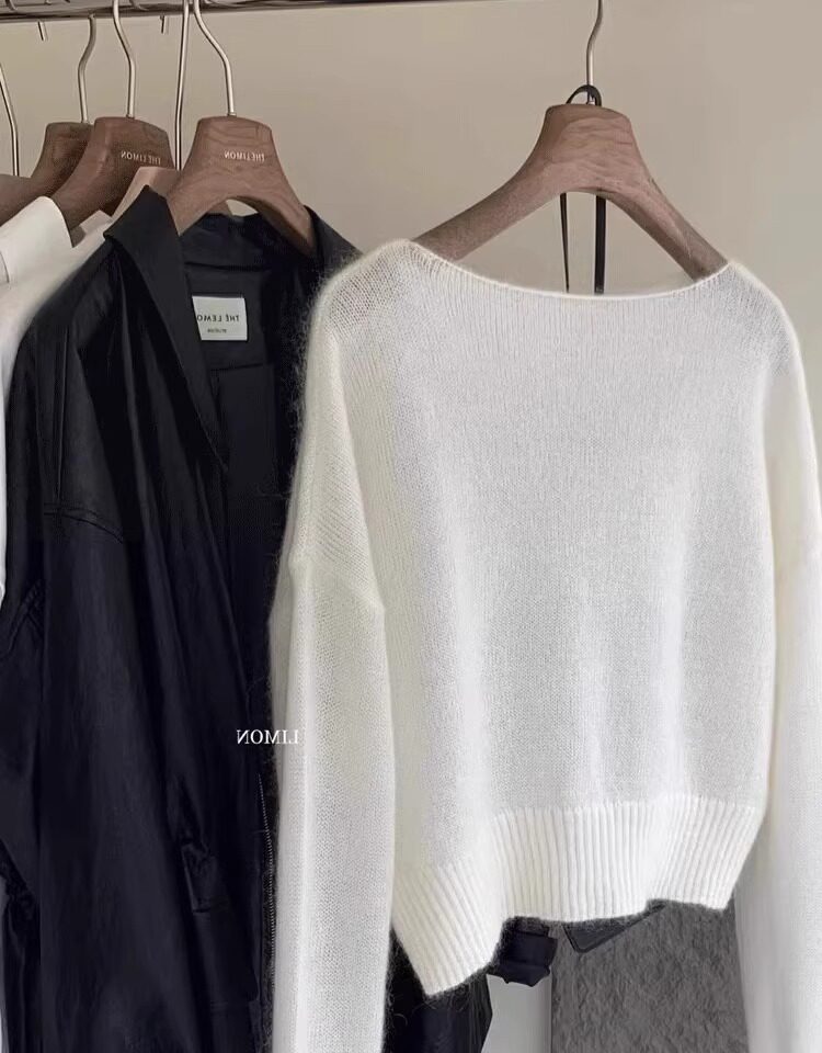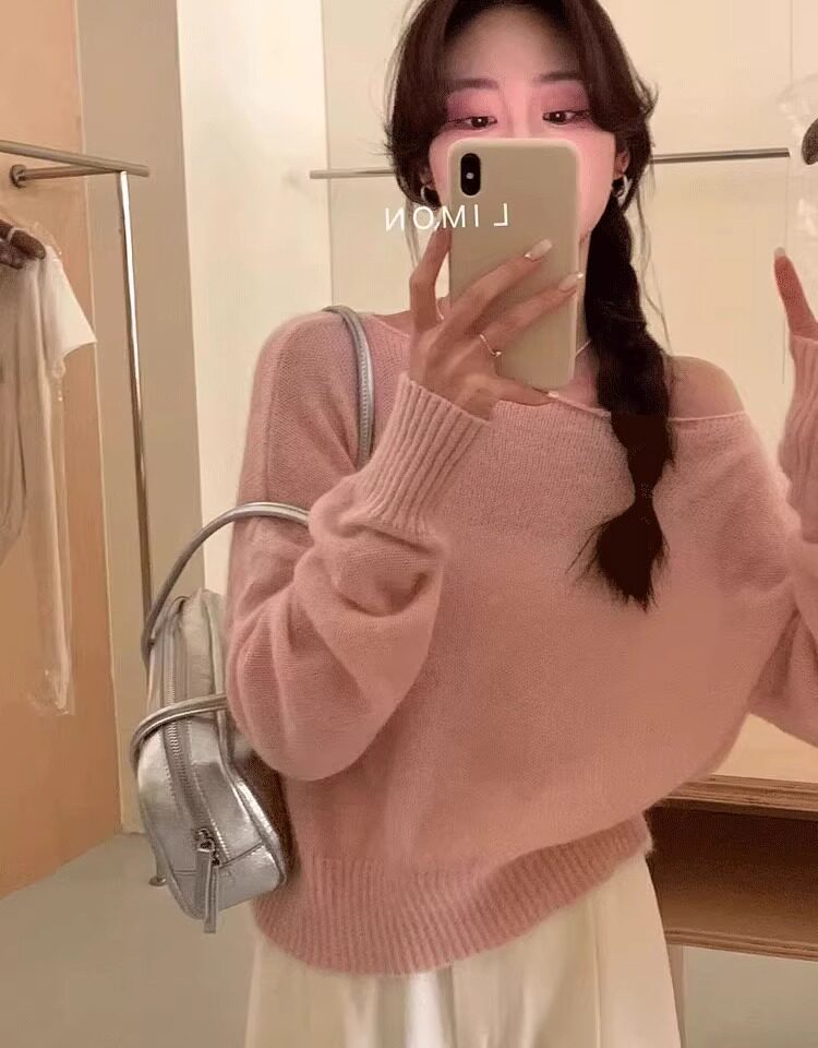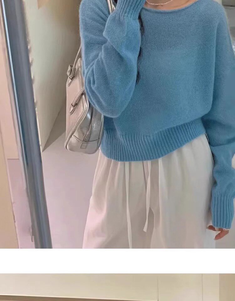 Klein Blue Gentle and Soft Mohair Knit Sweater for Women, New Spring Style, Off-Shoulder Base Layer Sweater Top
