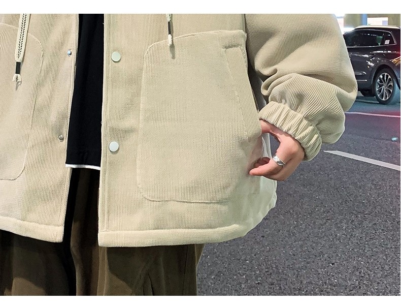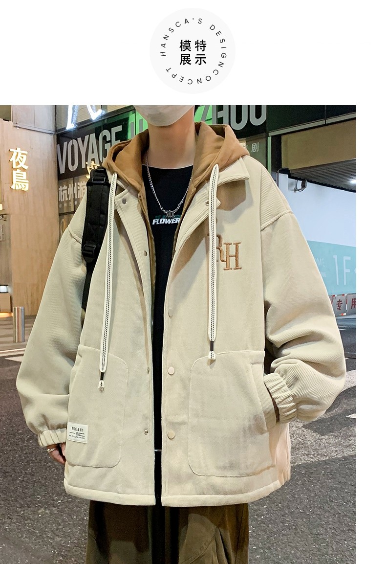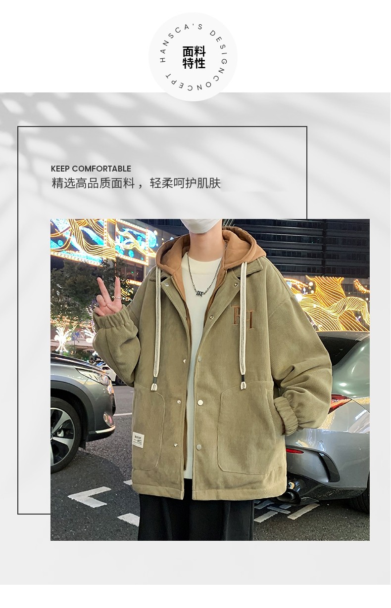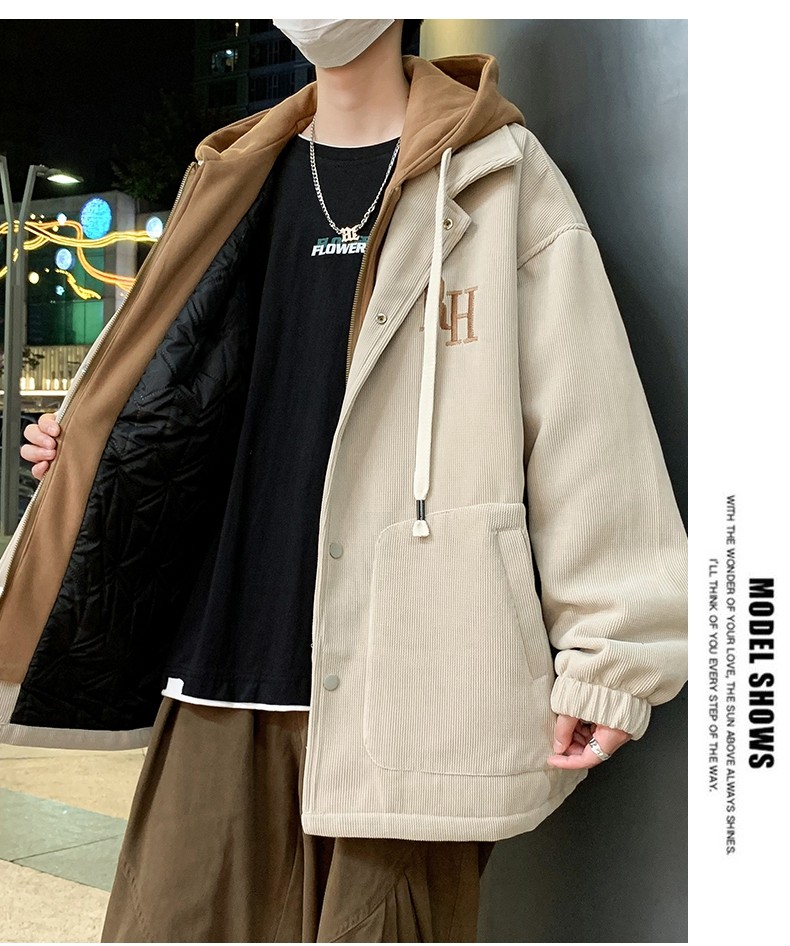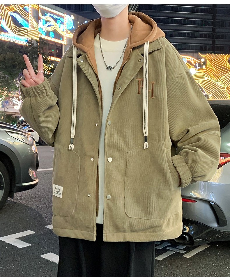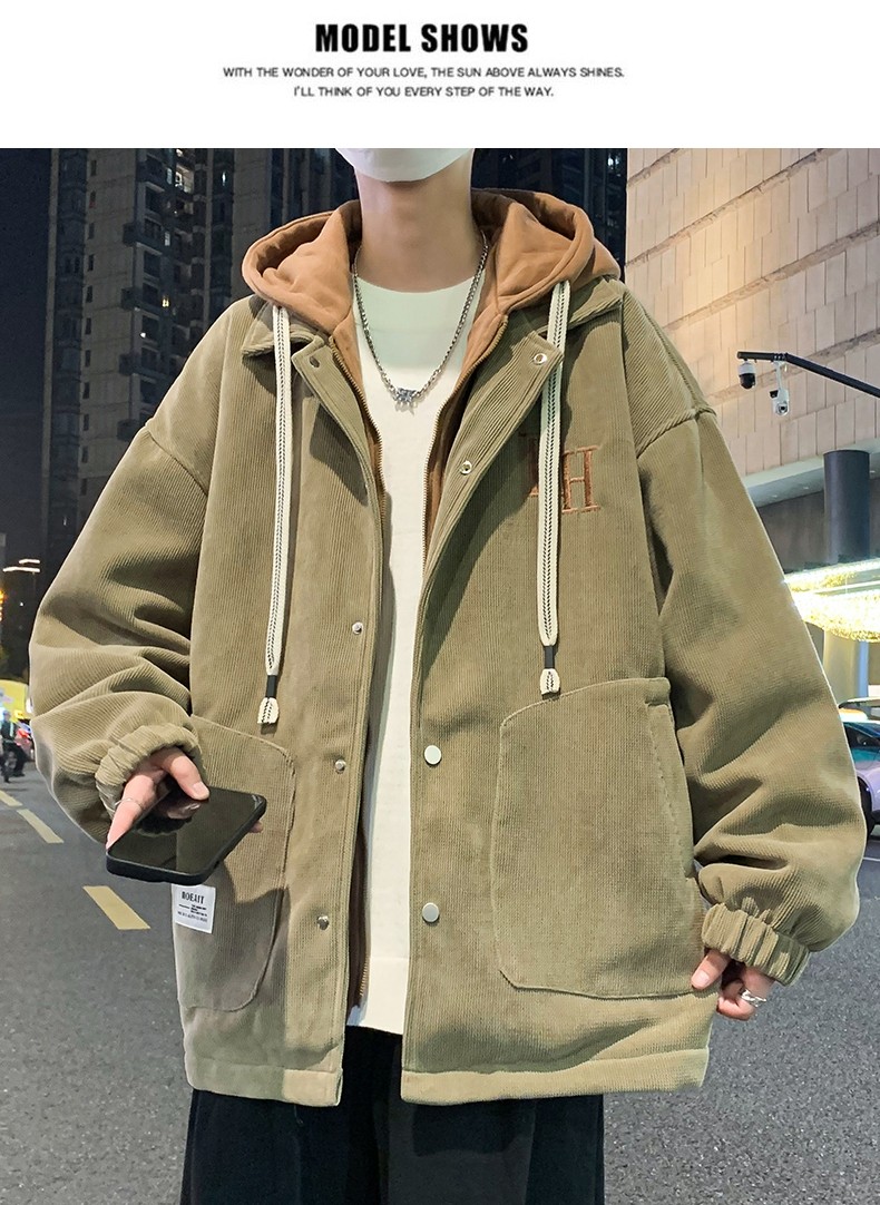 Corduroy jacket for male teenagers in autumn and winter hooded thickened quilted jacket for male high school students winter clothing two-padded jacket