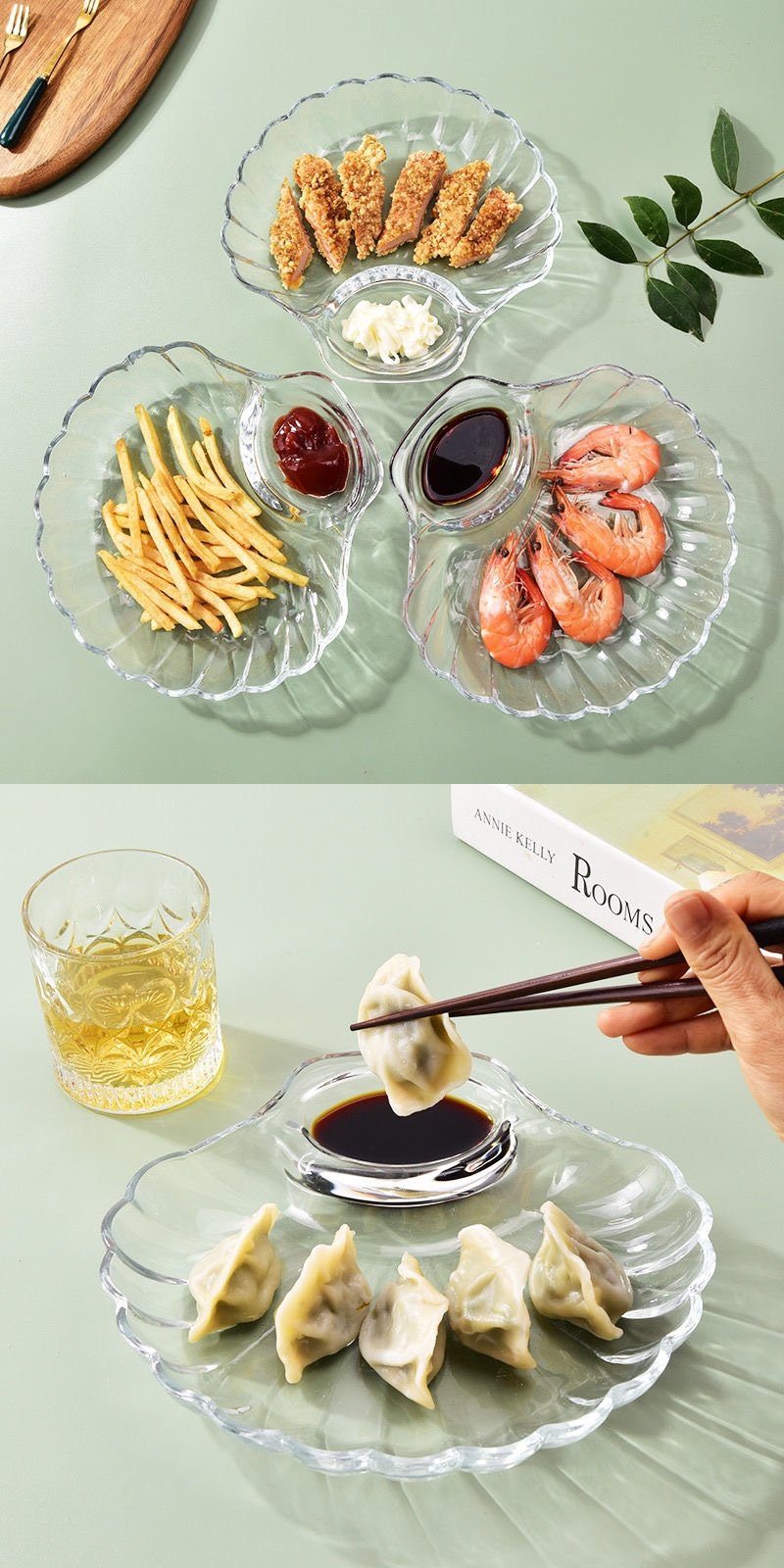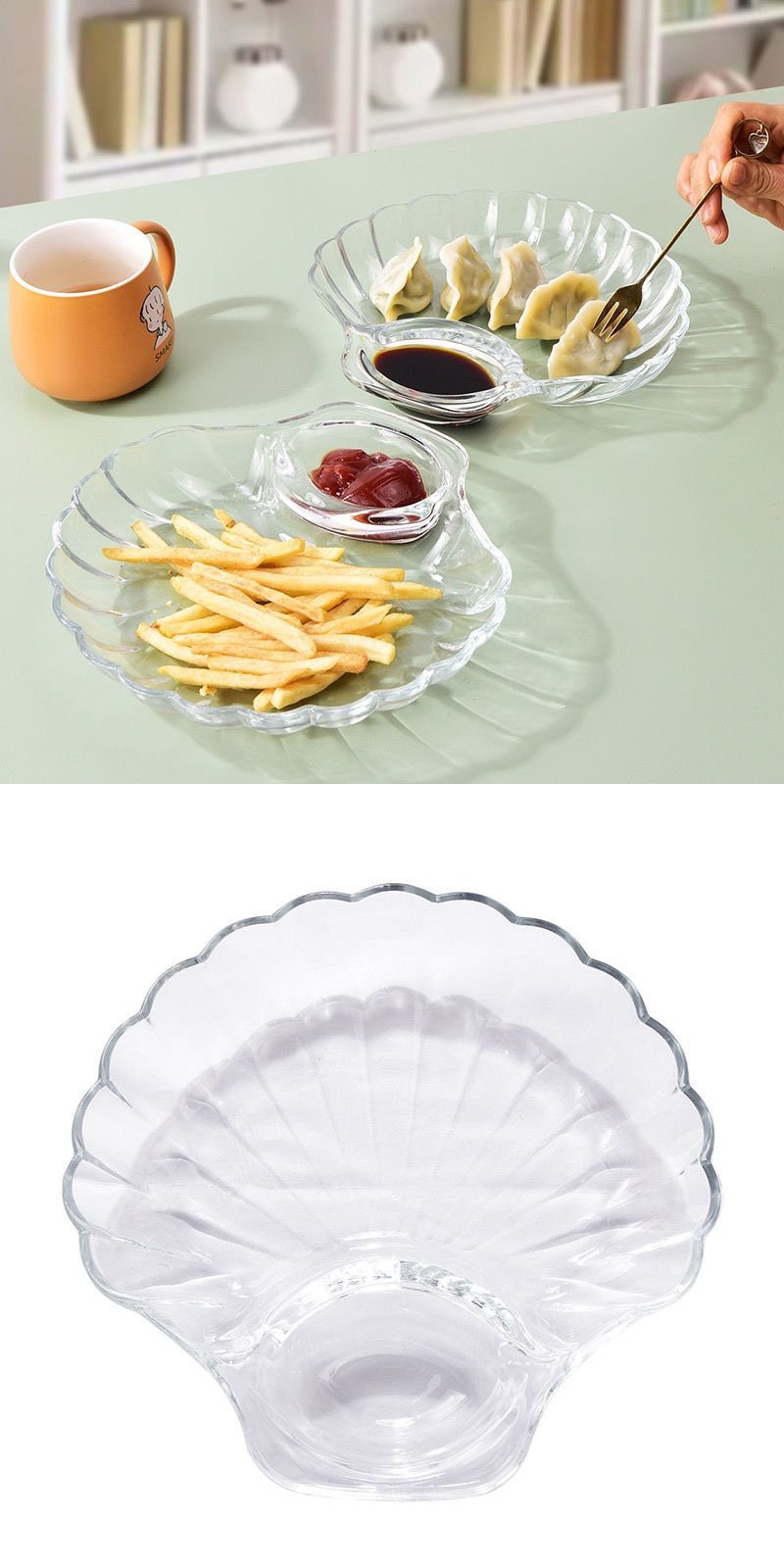 Glass Dumpling Plate with Vinegar Dish, Fat-Reducing Portion Control Plate, Household Fan-Shaped Shell-Shaped Dumpling Special Plate, Dipping Sauce Plate All-In-One