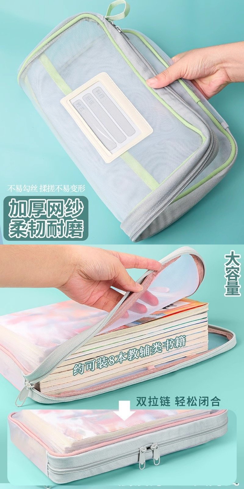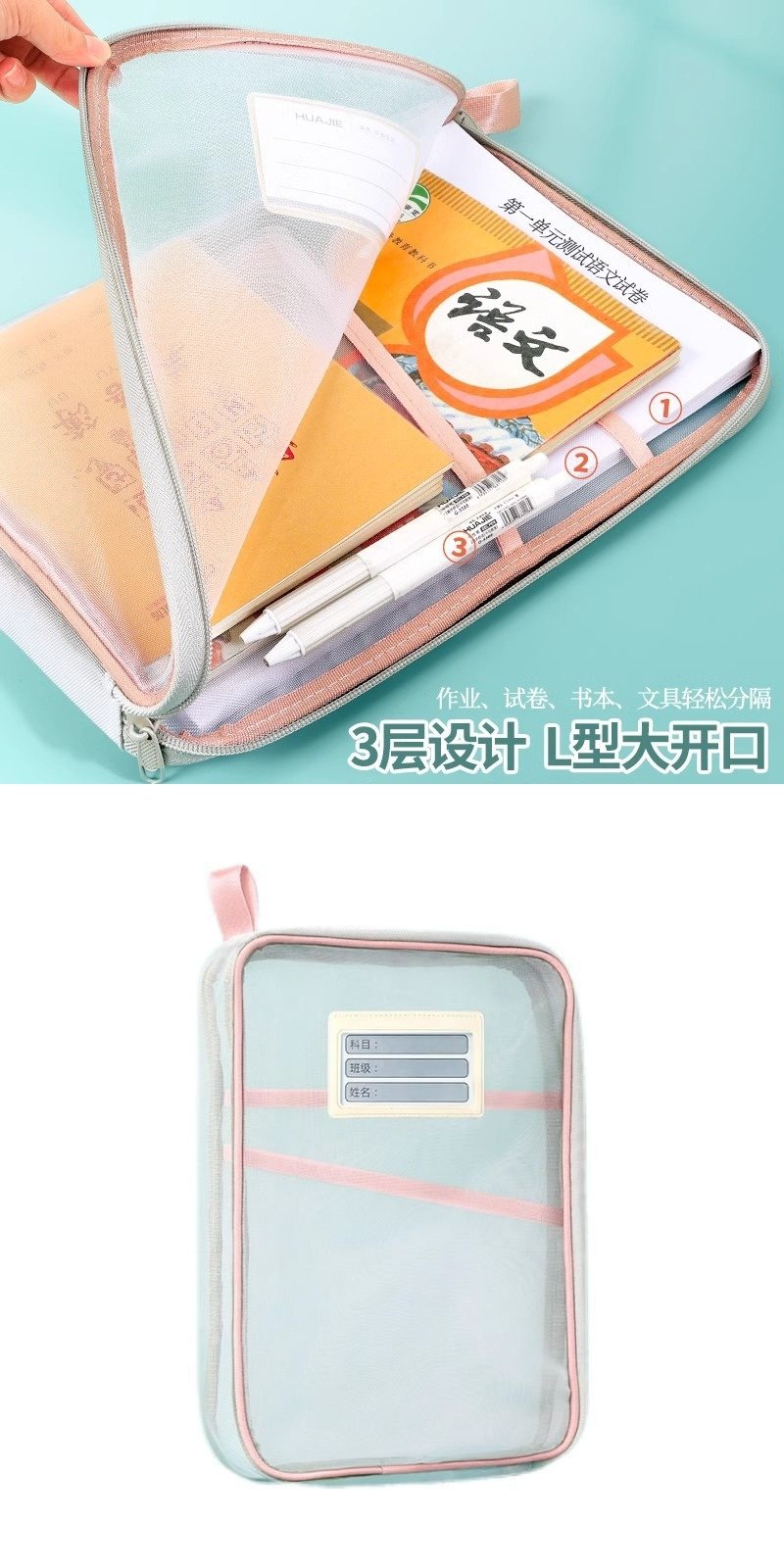 L-Shaped Large Opening Subject Classification Bag Mesh File Bag Zipper Type Primary School Student Book Bag Subject Exam Bag