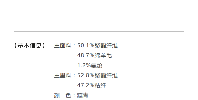 Material Composition 50.1% Polyester Fiber, 48.7% Sheep Wool, 1.2% Polyurethane Elastic Fiber (Spandex)