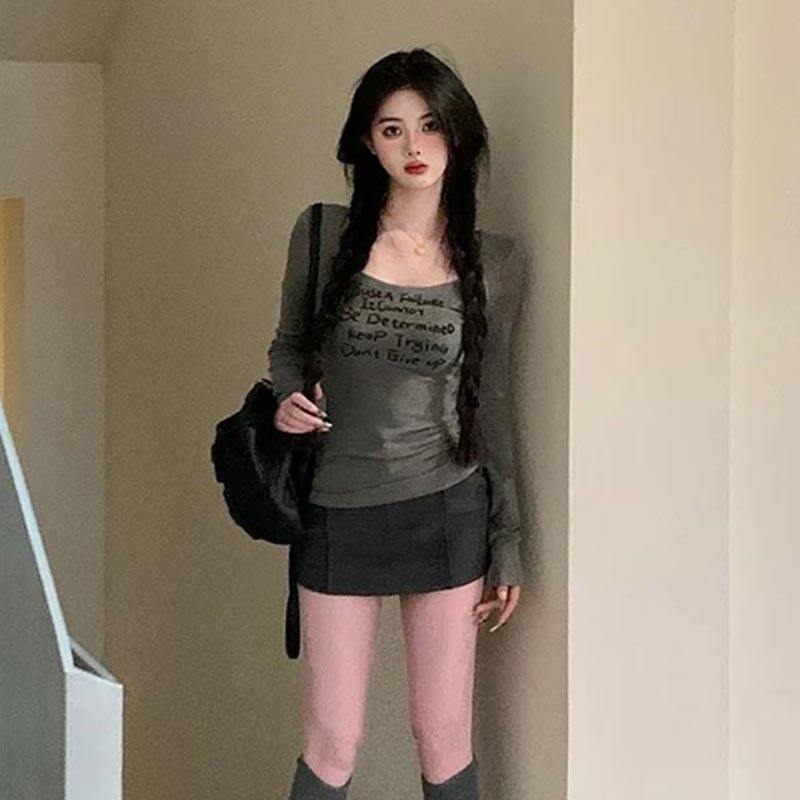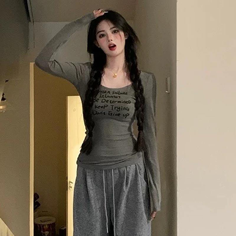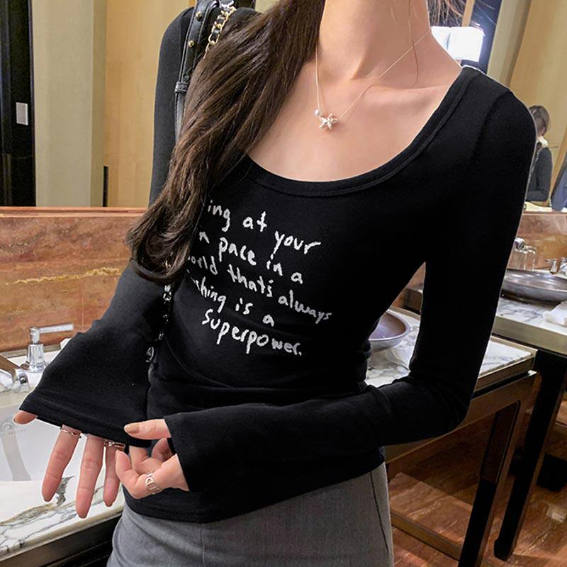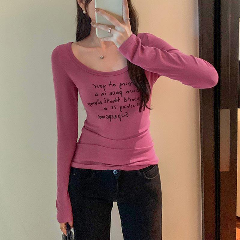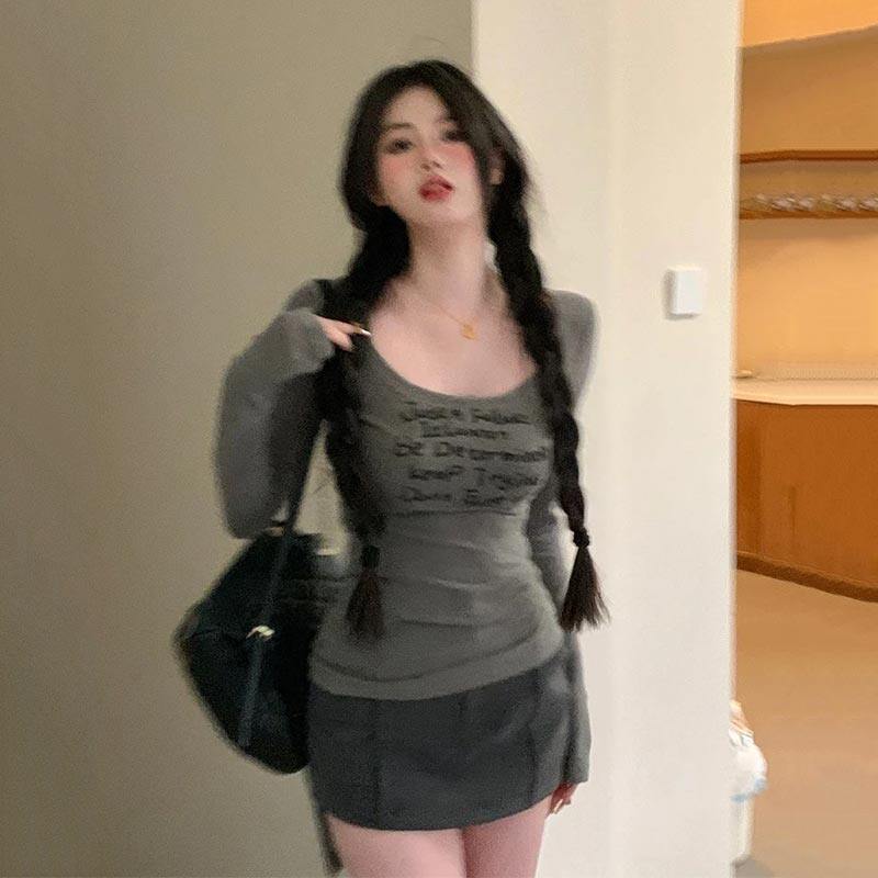 American-Style Sweet and Cool Spicy Girl U-Neck Long-Sleeve T-Shirt Top for Women, Suitable for Spring, Autumn, and Winter, Low-Neck Layered Slim-Fit Inner Wear Base Shirt Top