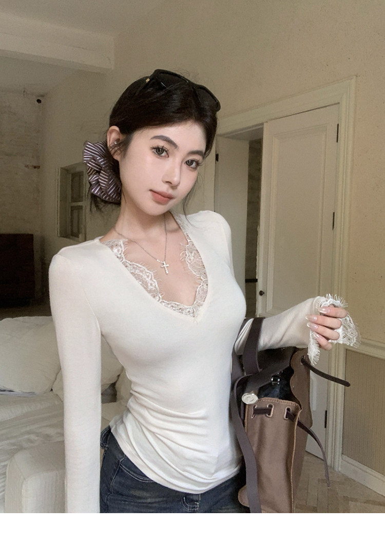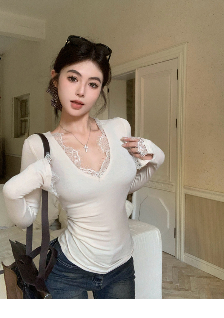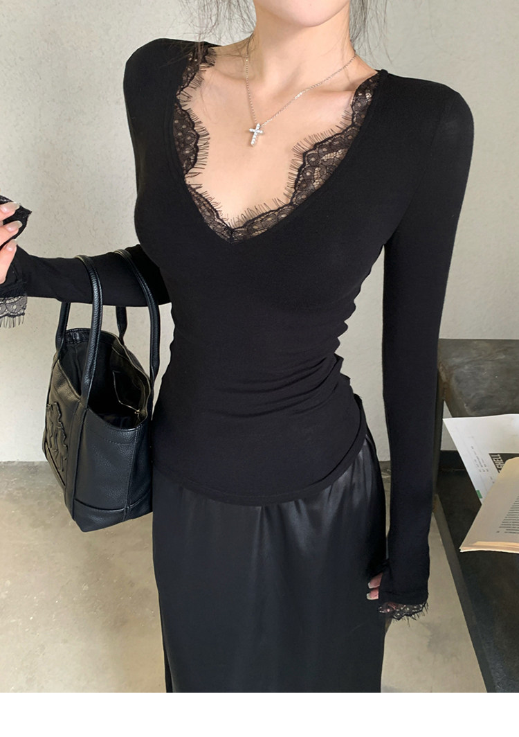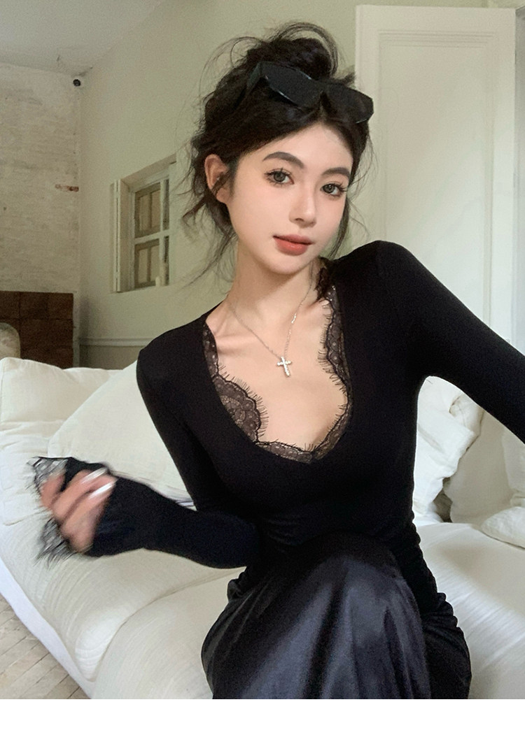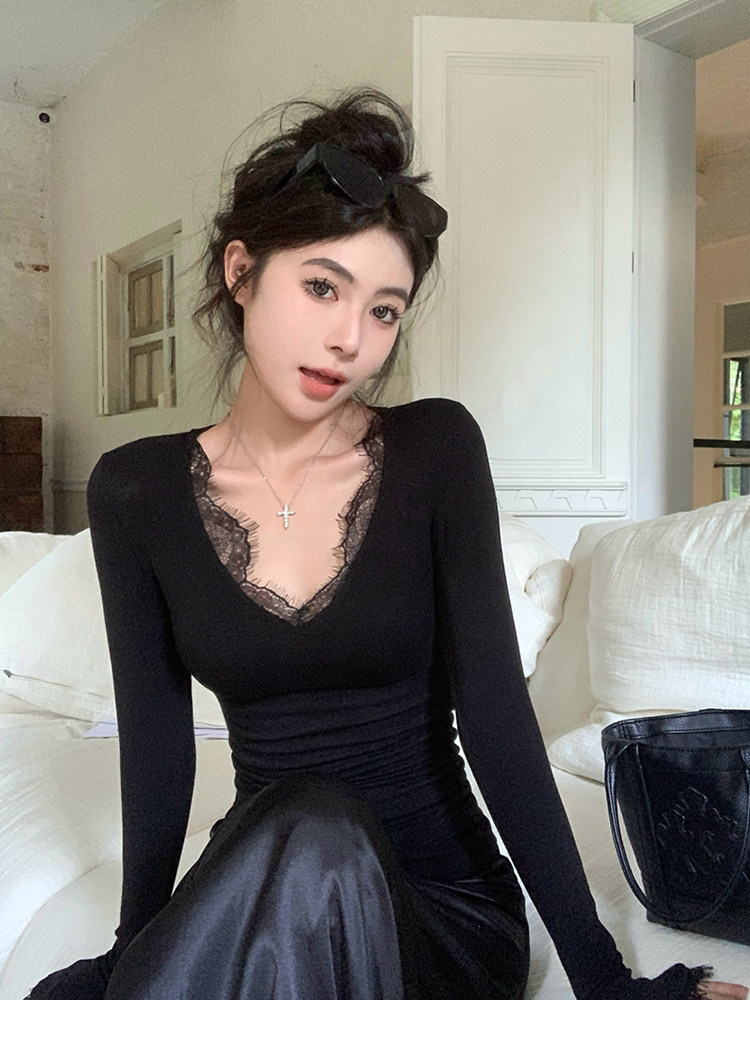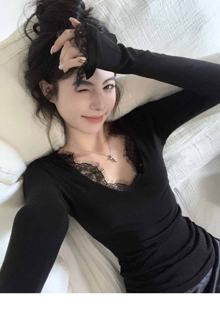 Autumn and Winter Pure Black V-Neck Long-Sleeve T-Shirt for Women with Lace Trim, Slim-Fit Base Shirt, Sexy Tight-Fitting Inner Top