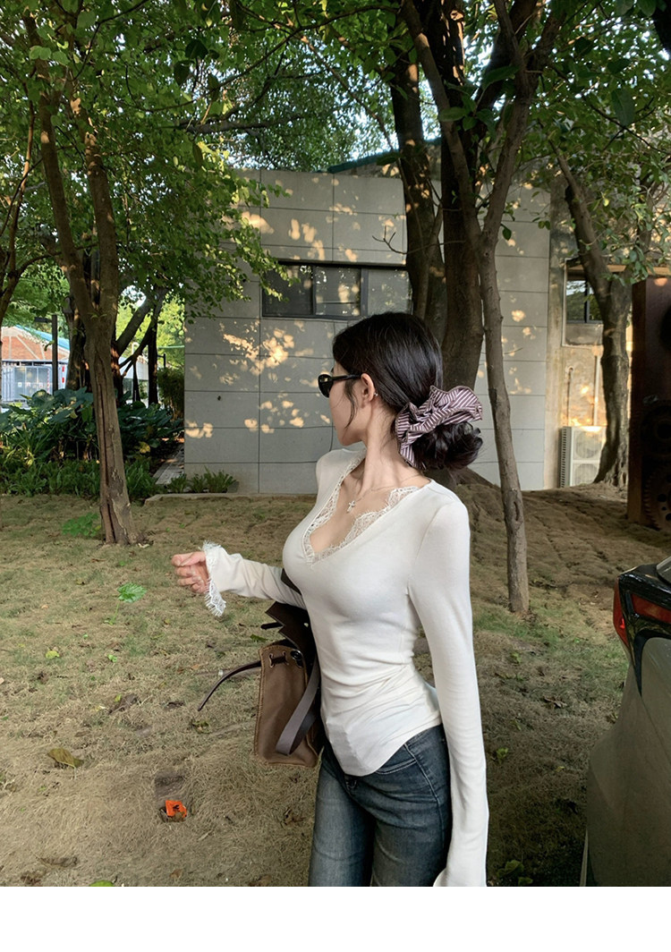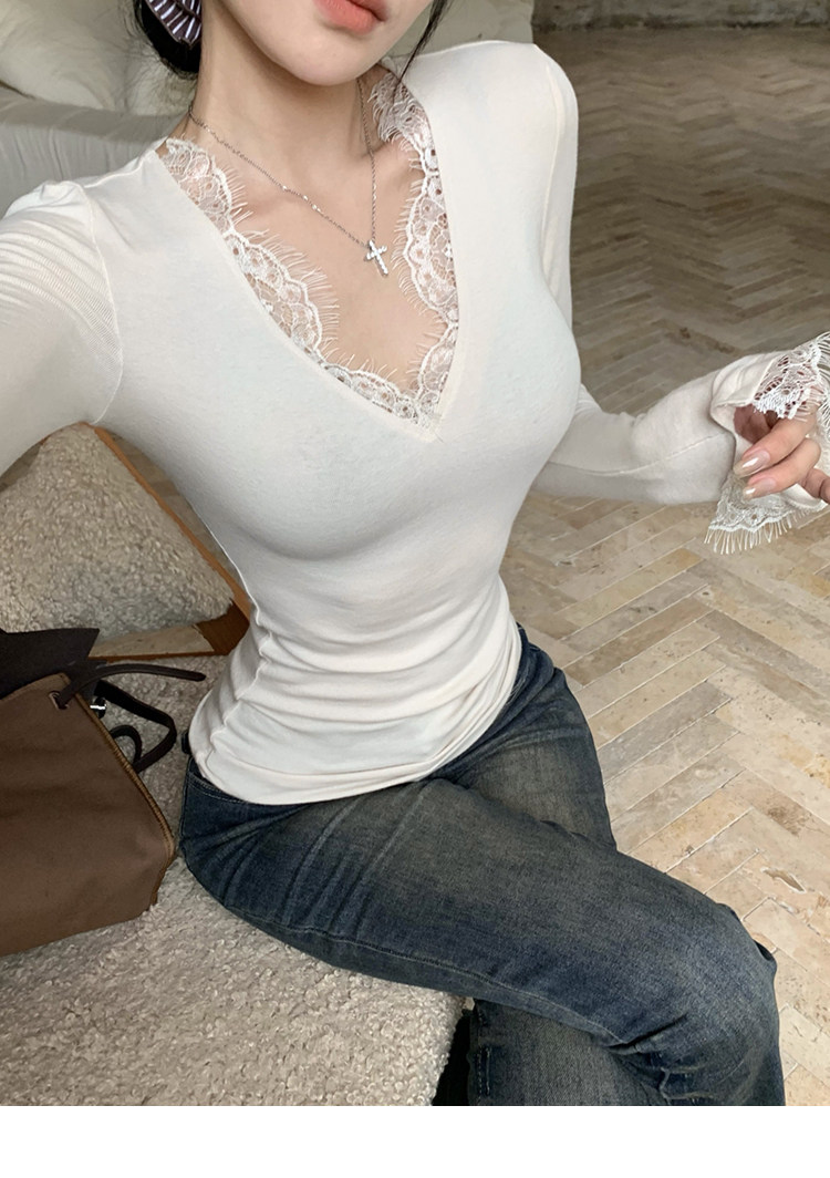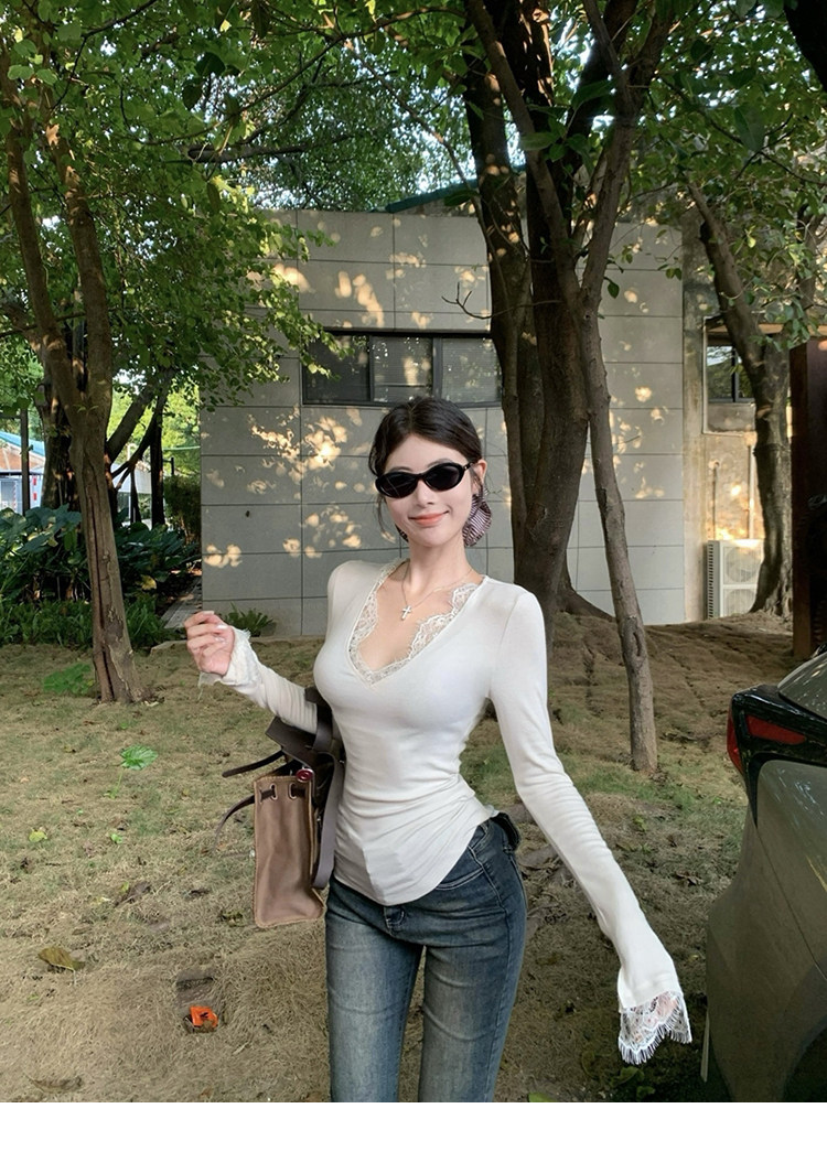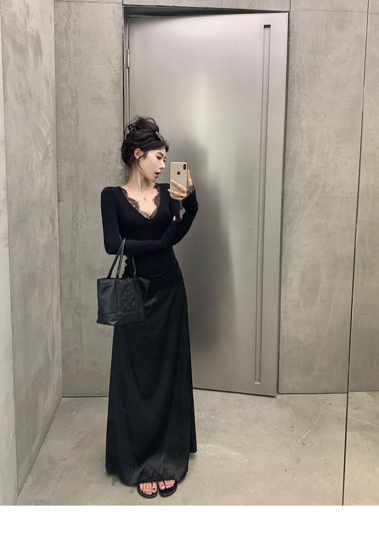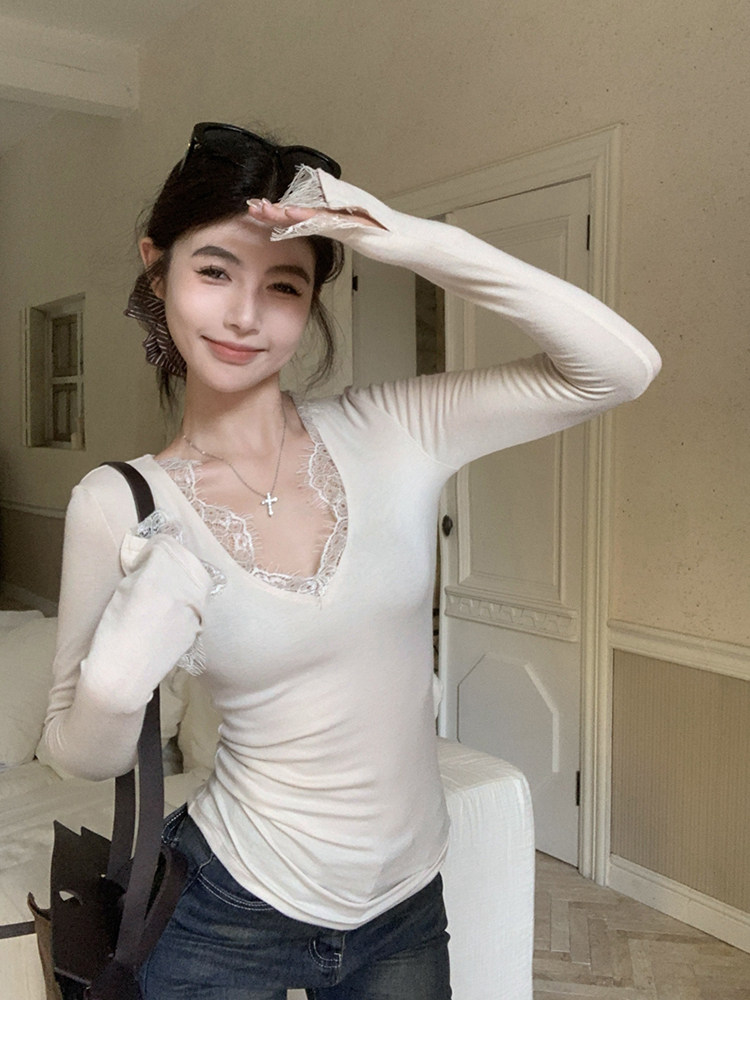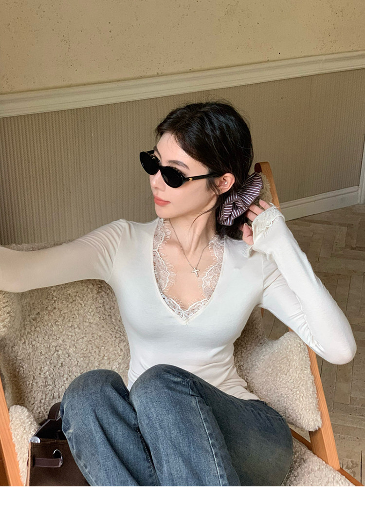Autumn and Winter Pure Black V-Neck Long-Sleeve T-Shirt for Women with Lace Trim, Slim-Fit Base Shirt, Sexy Tight-Fitting Inner Top
