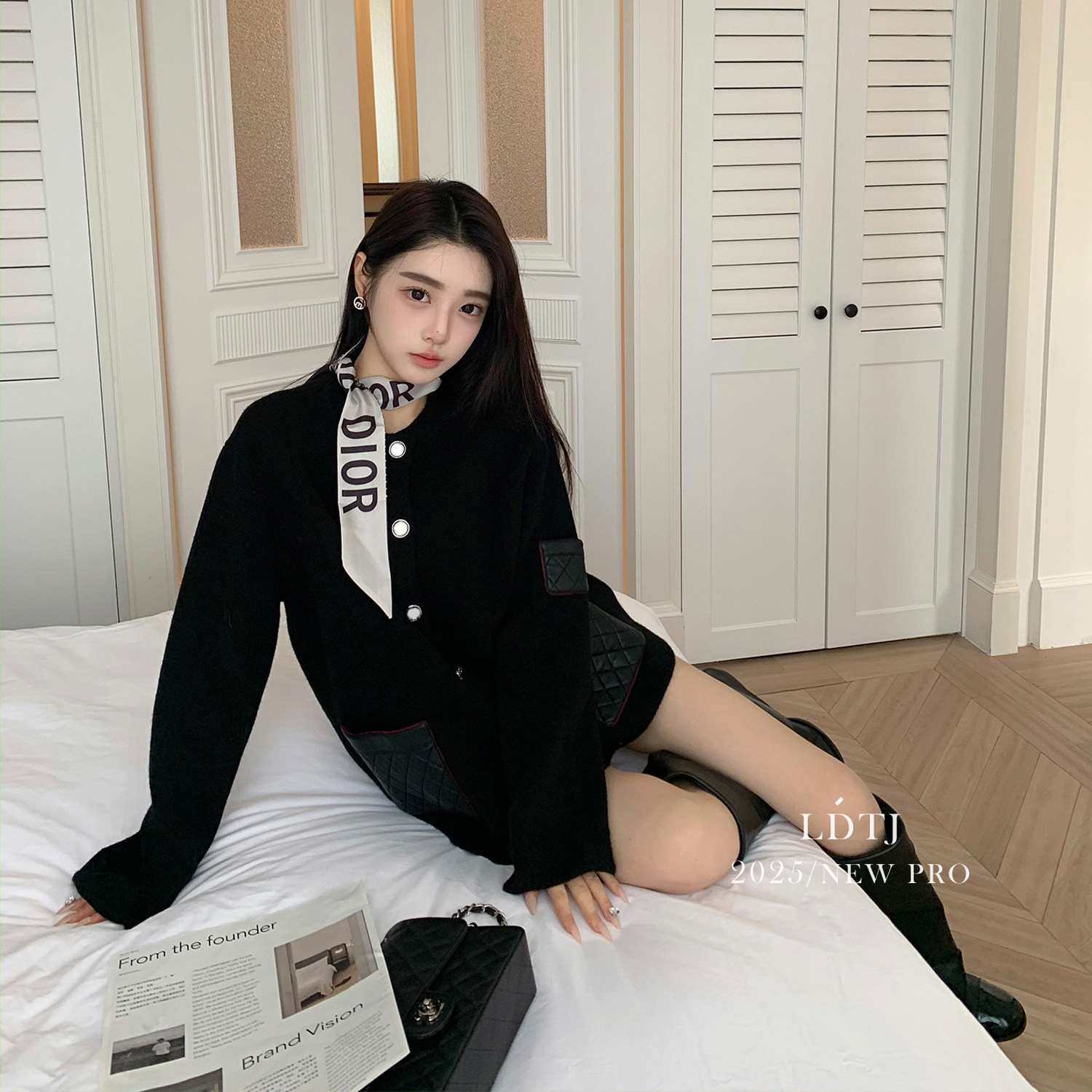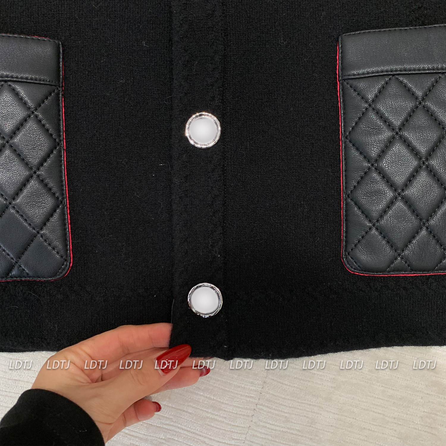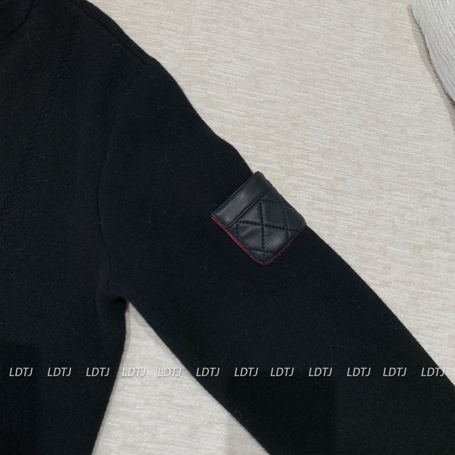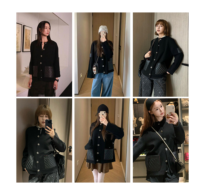 Ldtj High-End Customization: the Alluring Sister's Appointment - Autumn French Style Small Fragrance Diamond Pattern Leather Pocket Knitted Cashmere Cardigan Jacket
