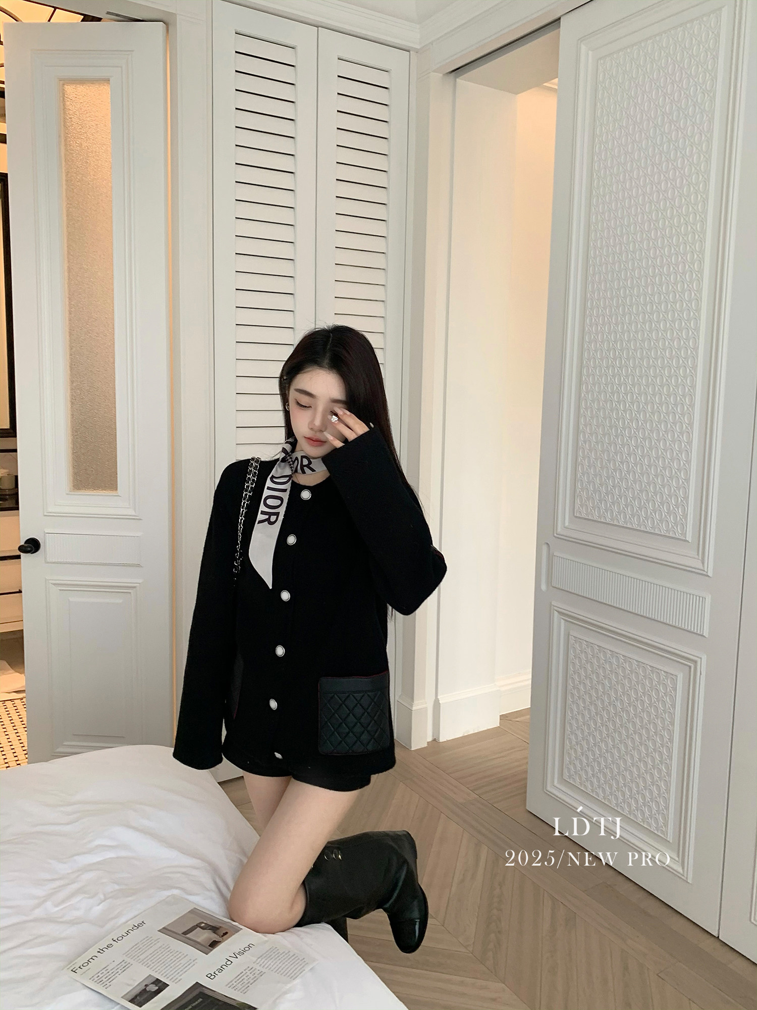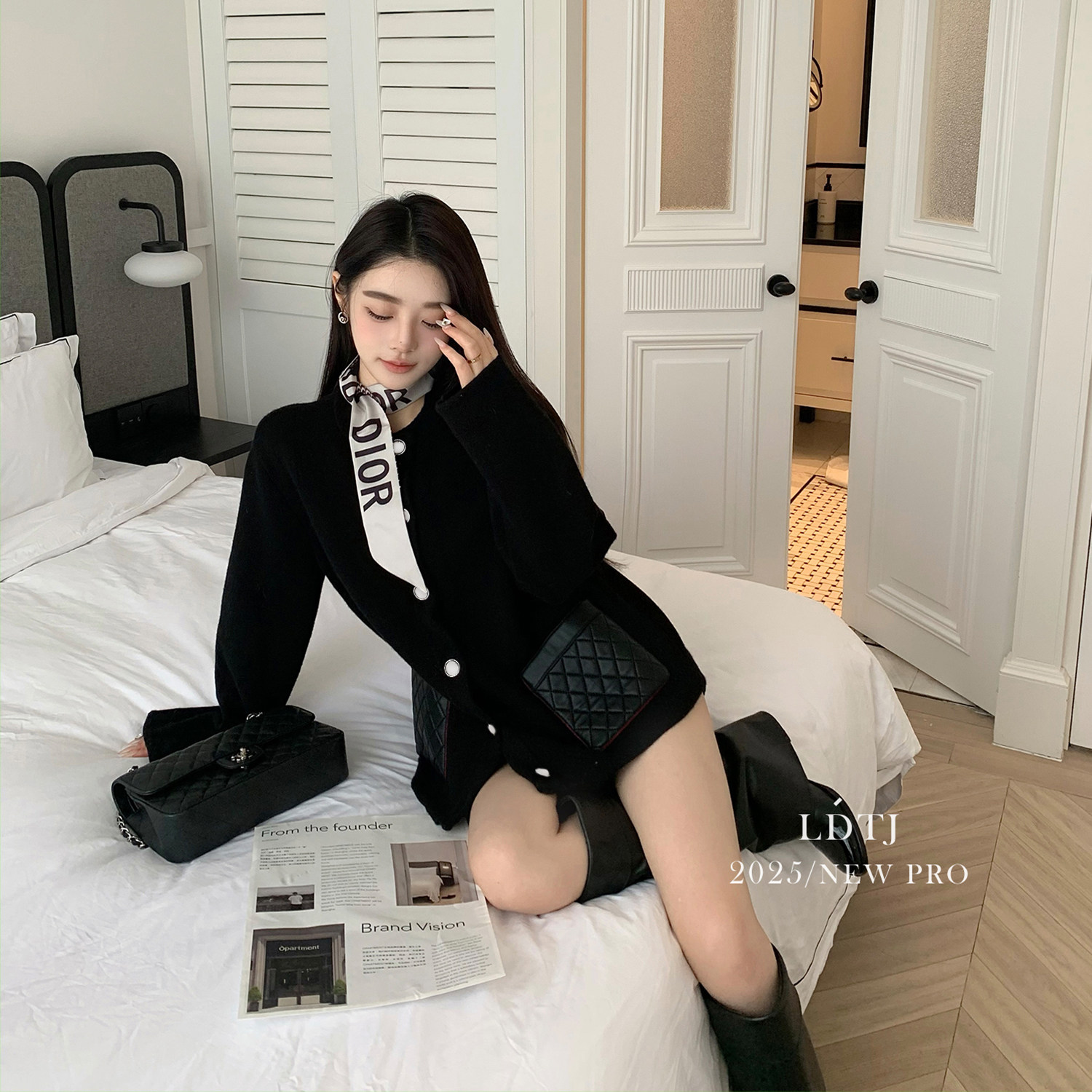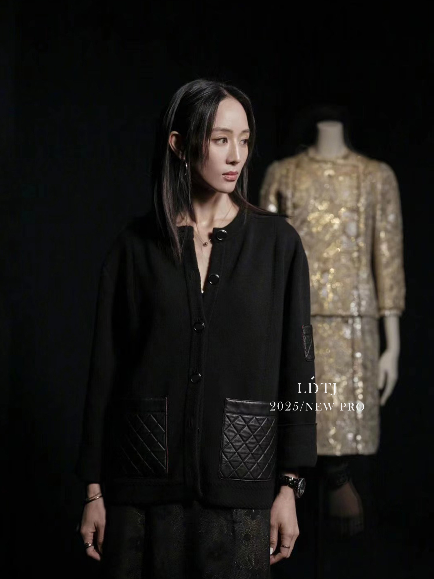 Ldtj High-End Customization: the Alluring Sister's Appointment - Autumn French Style Small Fragrance Diamond Pattern Leather Pocket Knitted Cashmere Cardigan Jacket
